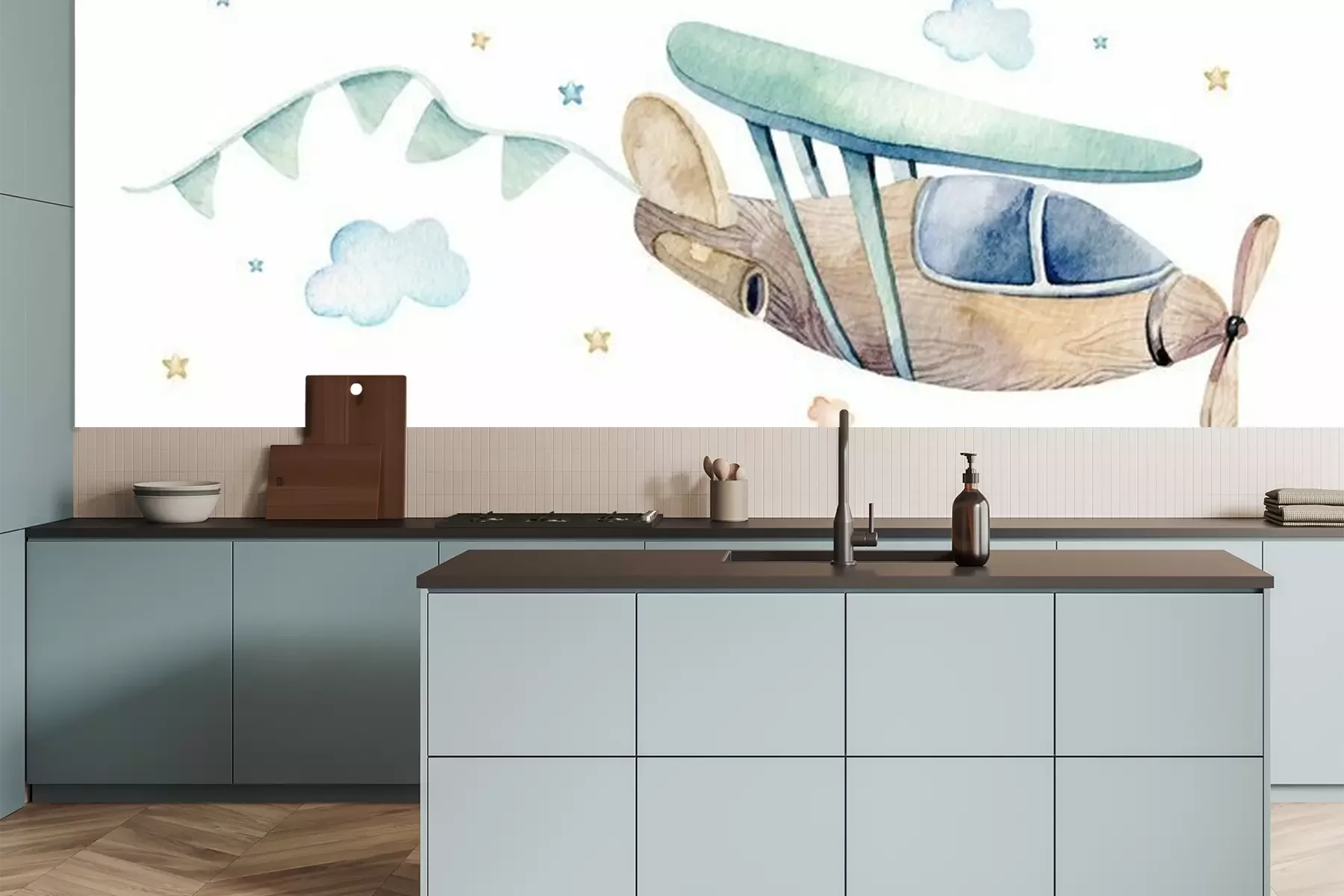 Sticker  Un avion en bois tirant des drapeaux derrière lui