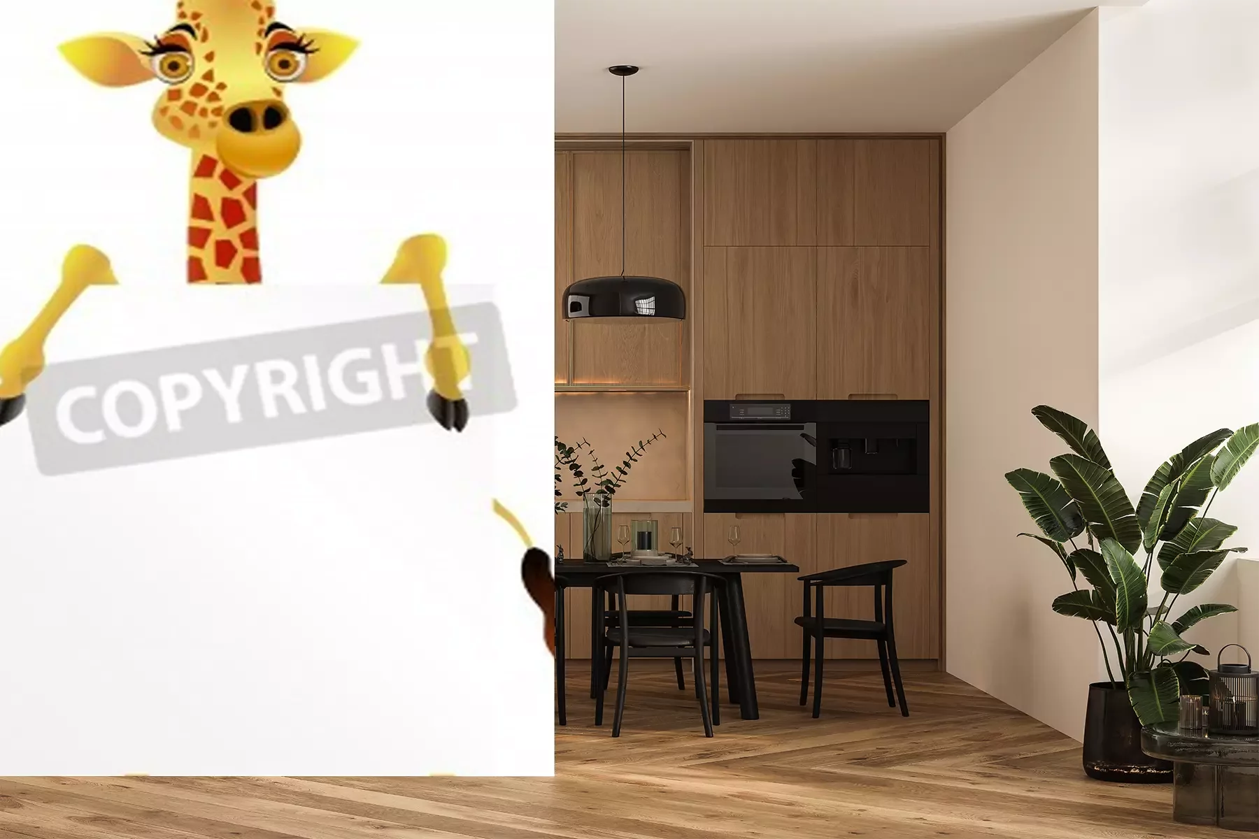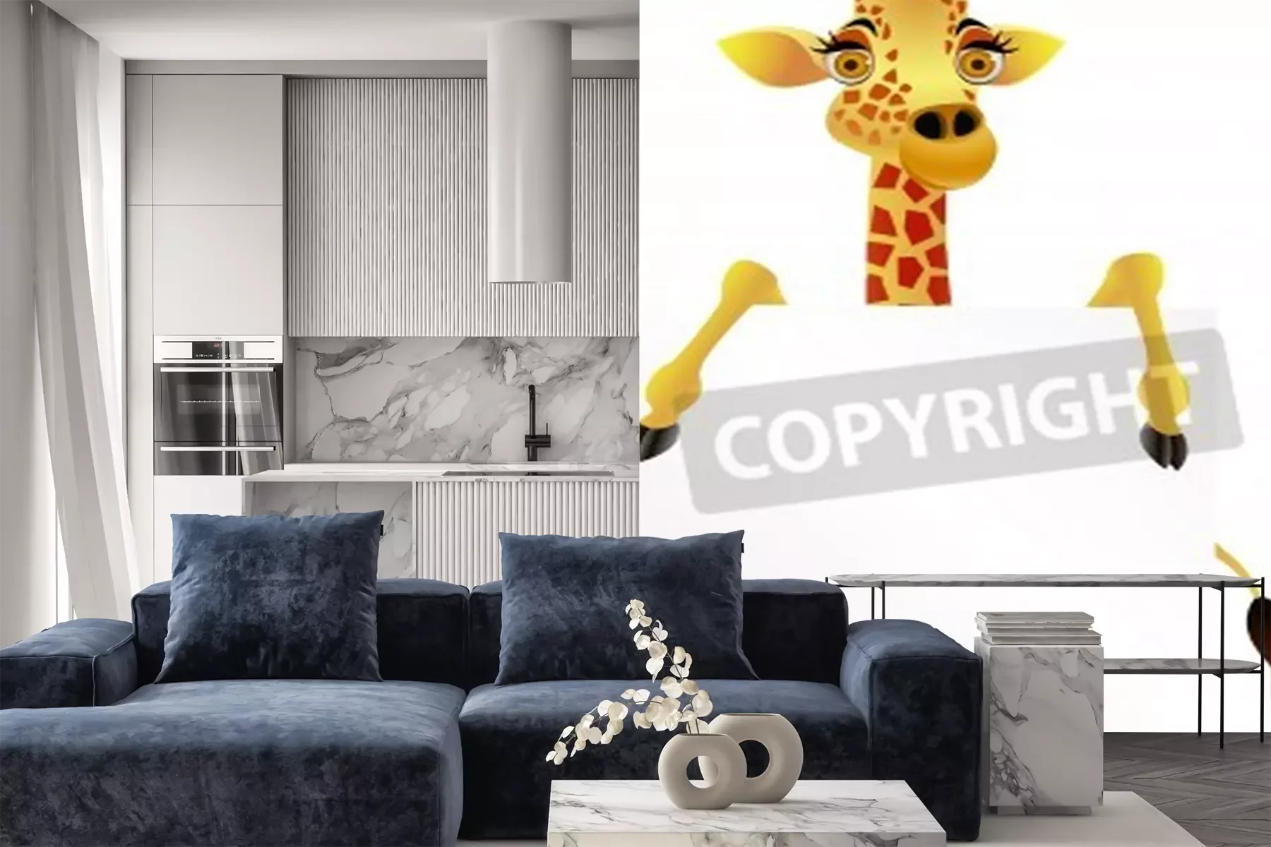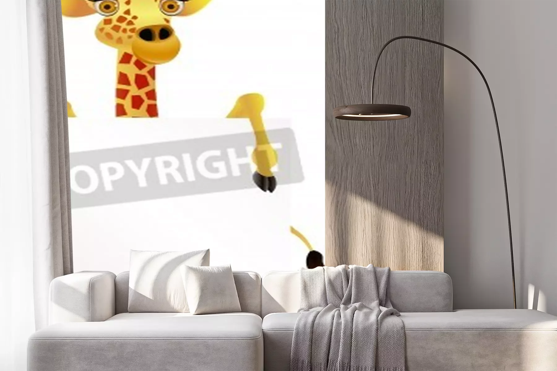 Sticker  Une girafe de dessin animé tenant un tableau blanc vierge