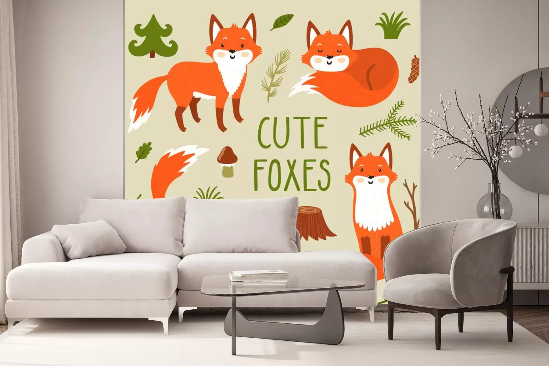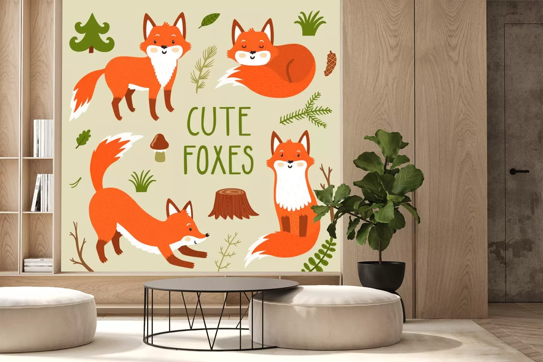 Sticker  Vecteur série de quatre renards mignons, des plantes forestières. Personnages de dessin animé drôle dessinés à la main. Peut être utilisé dans des affiches enfantines, carte, invitations et autres.