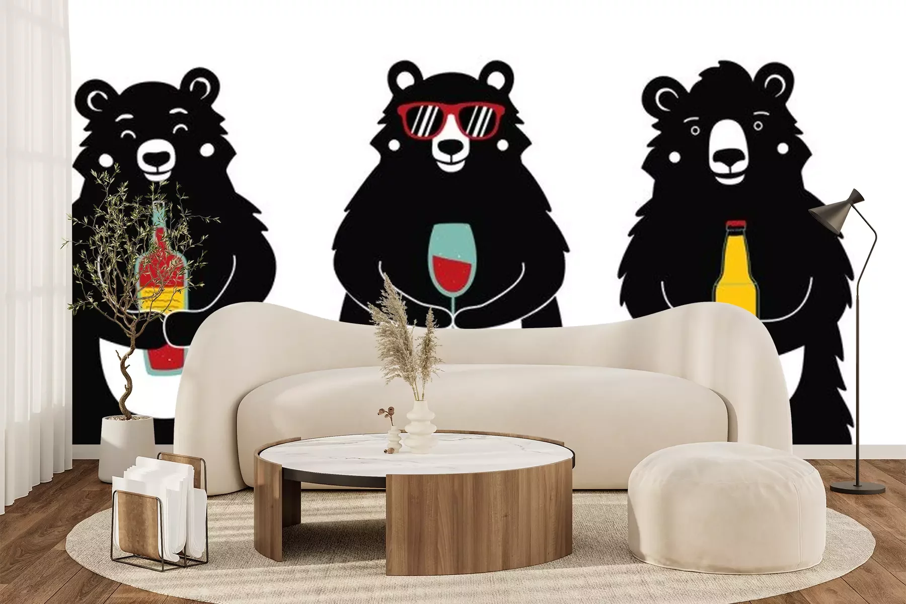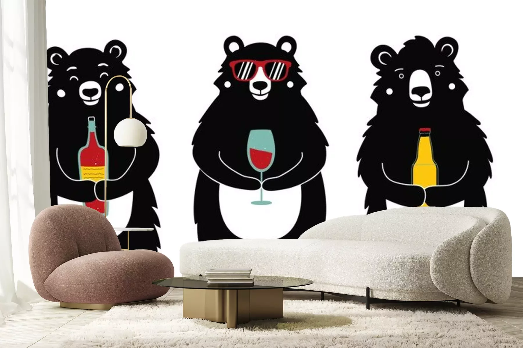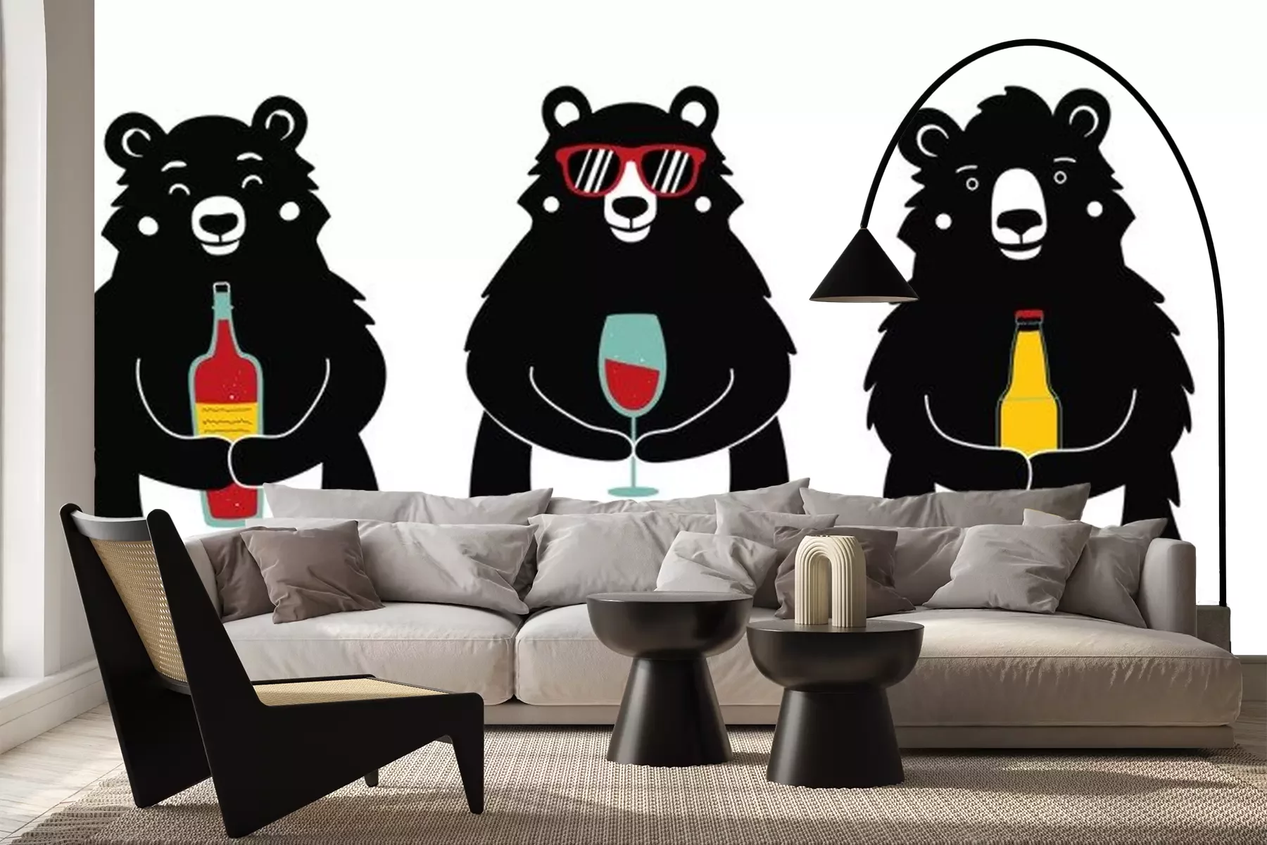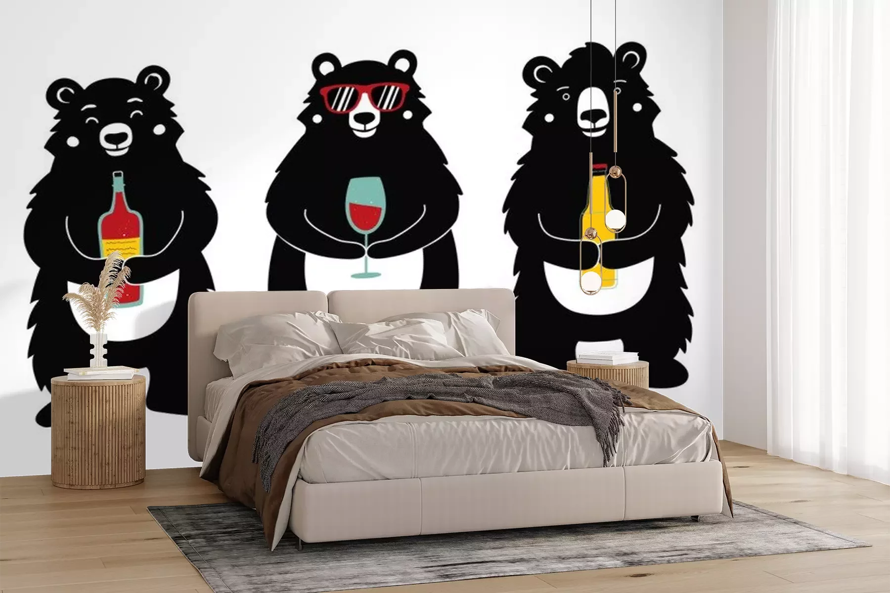 Sticker  Vector illustration with bears holding drinks - wine bottle, red wine glass and beer.