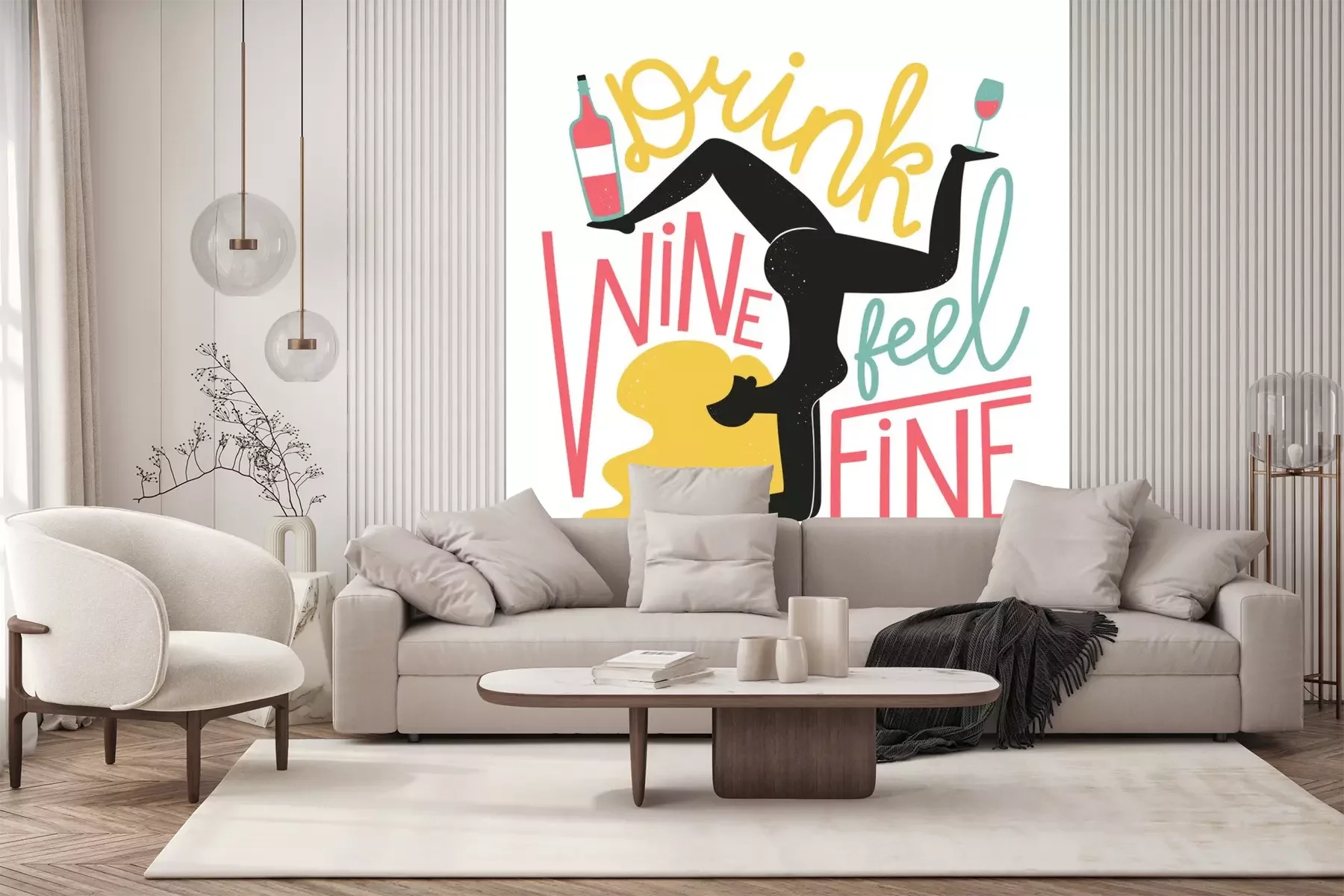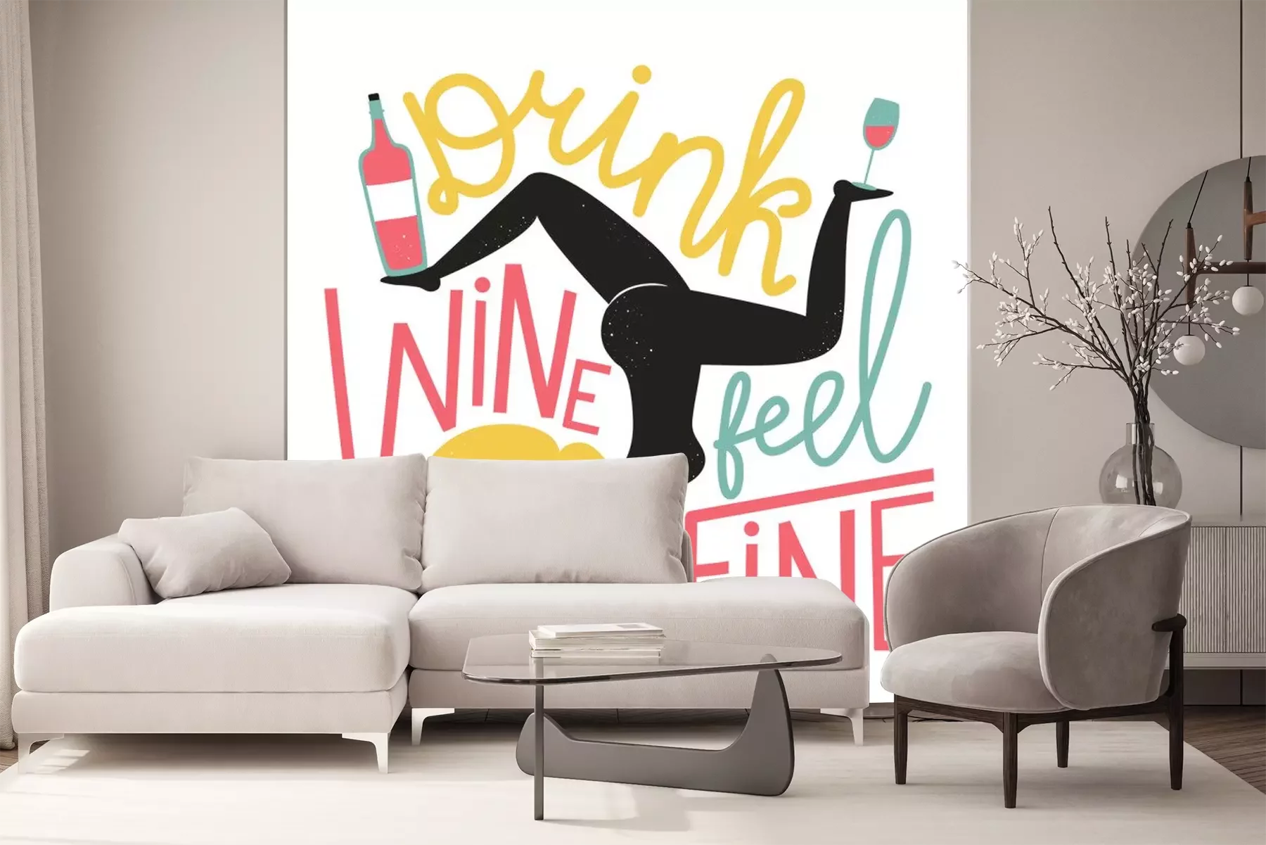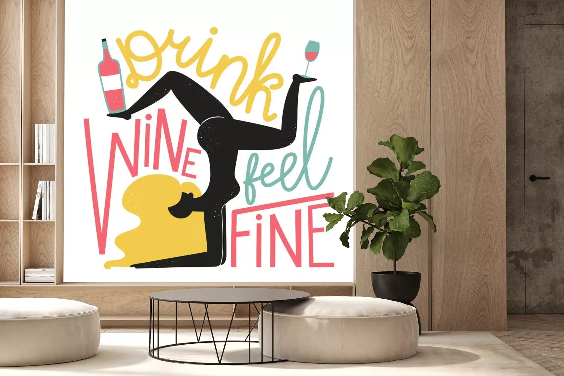 Sticker  Vector illustration with woman, wine bottle and glass. Drink wine feel fine lettering quote.