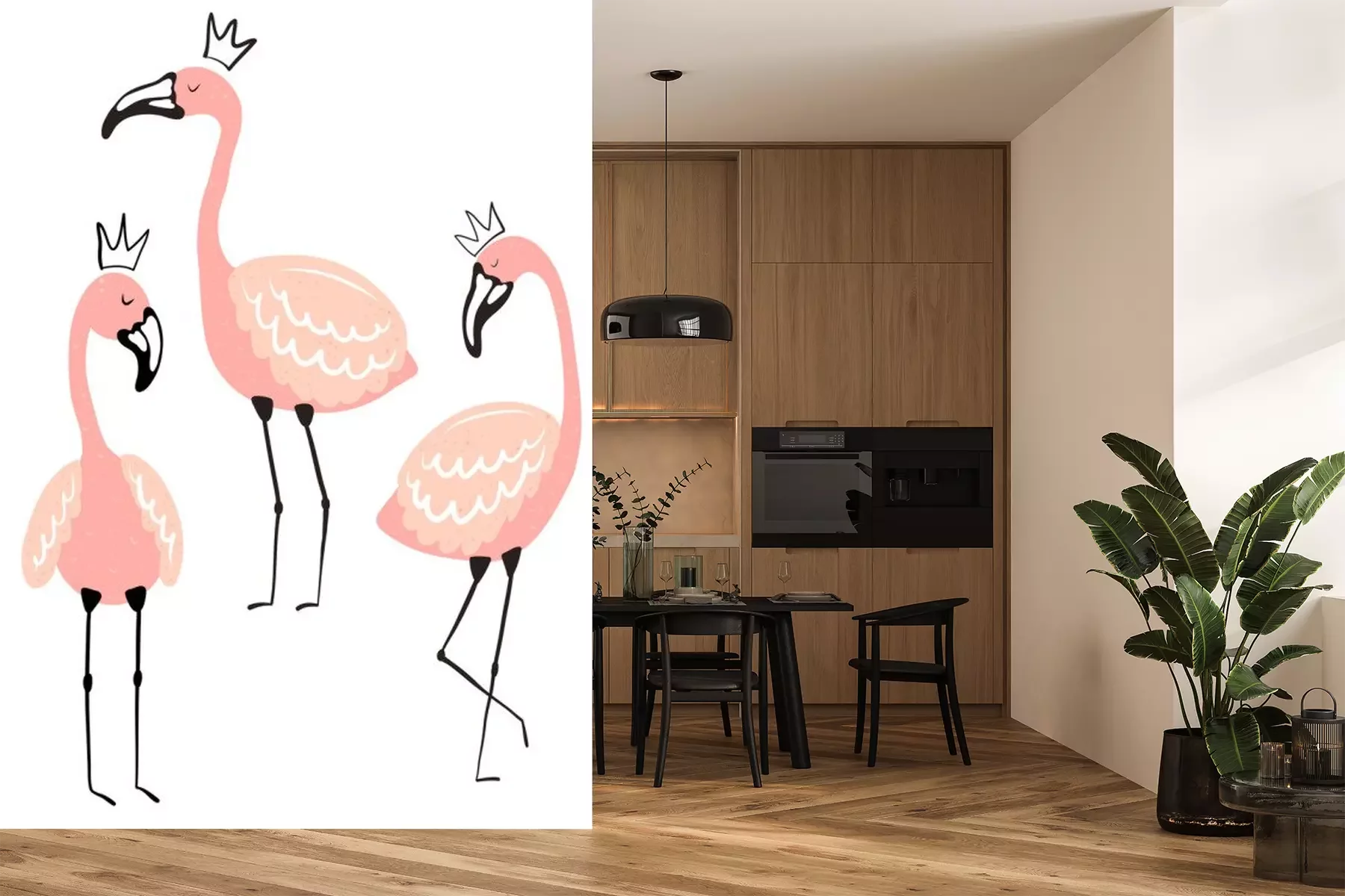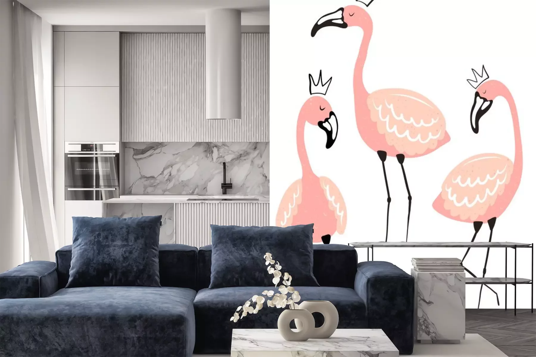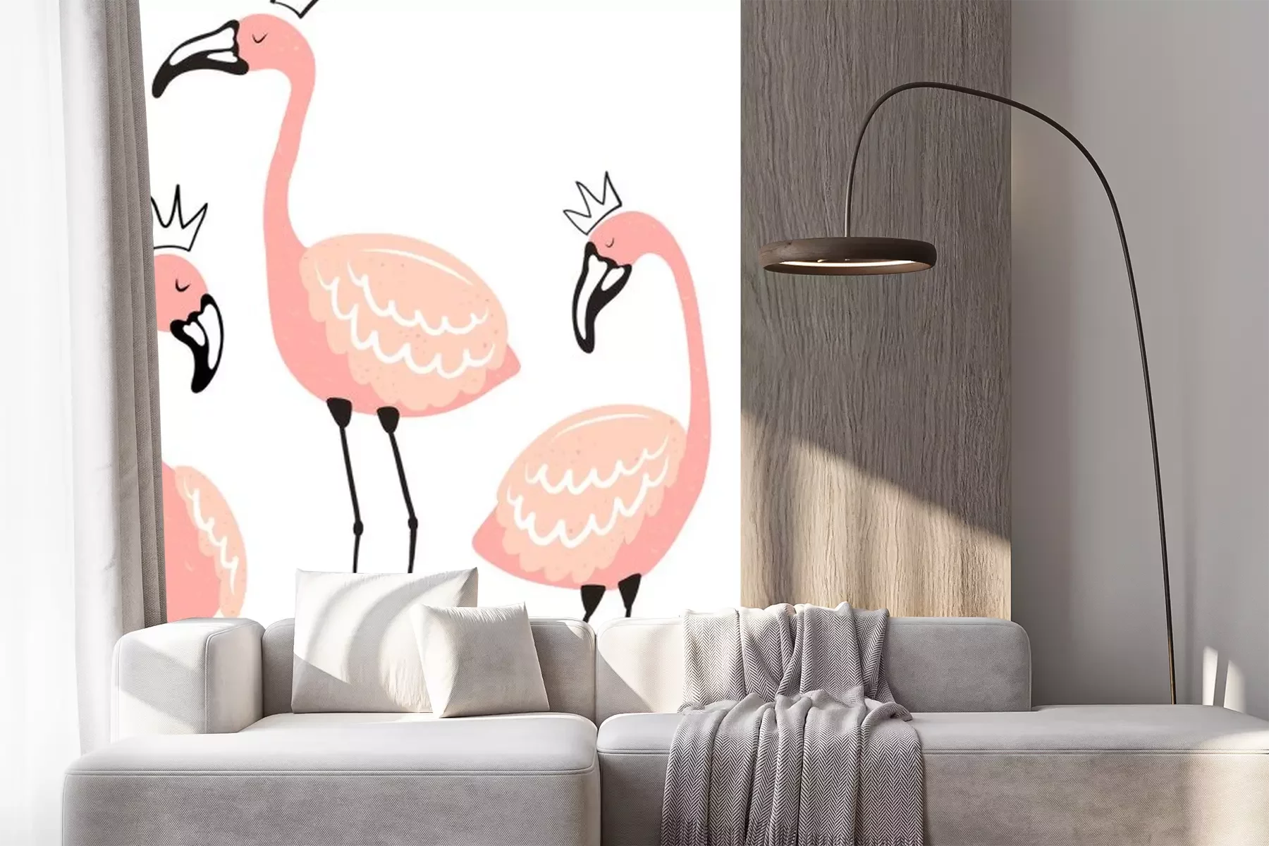 Sticker  Vector tropical illustration of cute isolated flamingos in the crown. Hand-drawn summer exotic poster for kids, holidays, clothes, decor, textile, fabric, card.