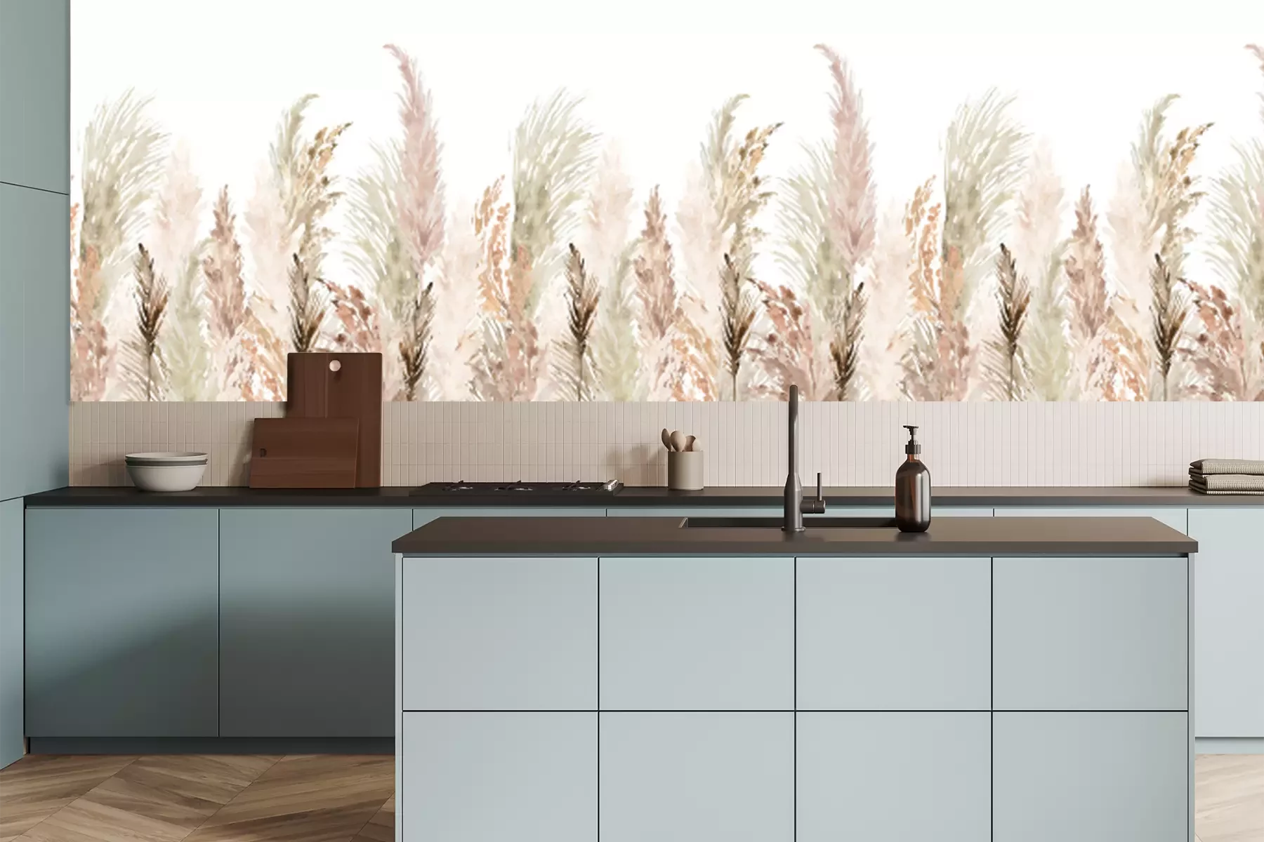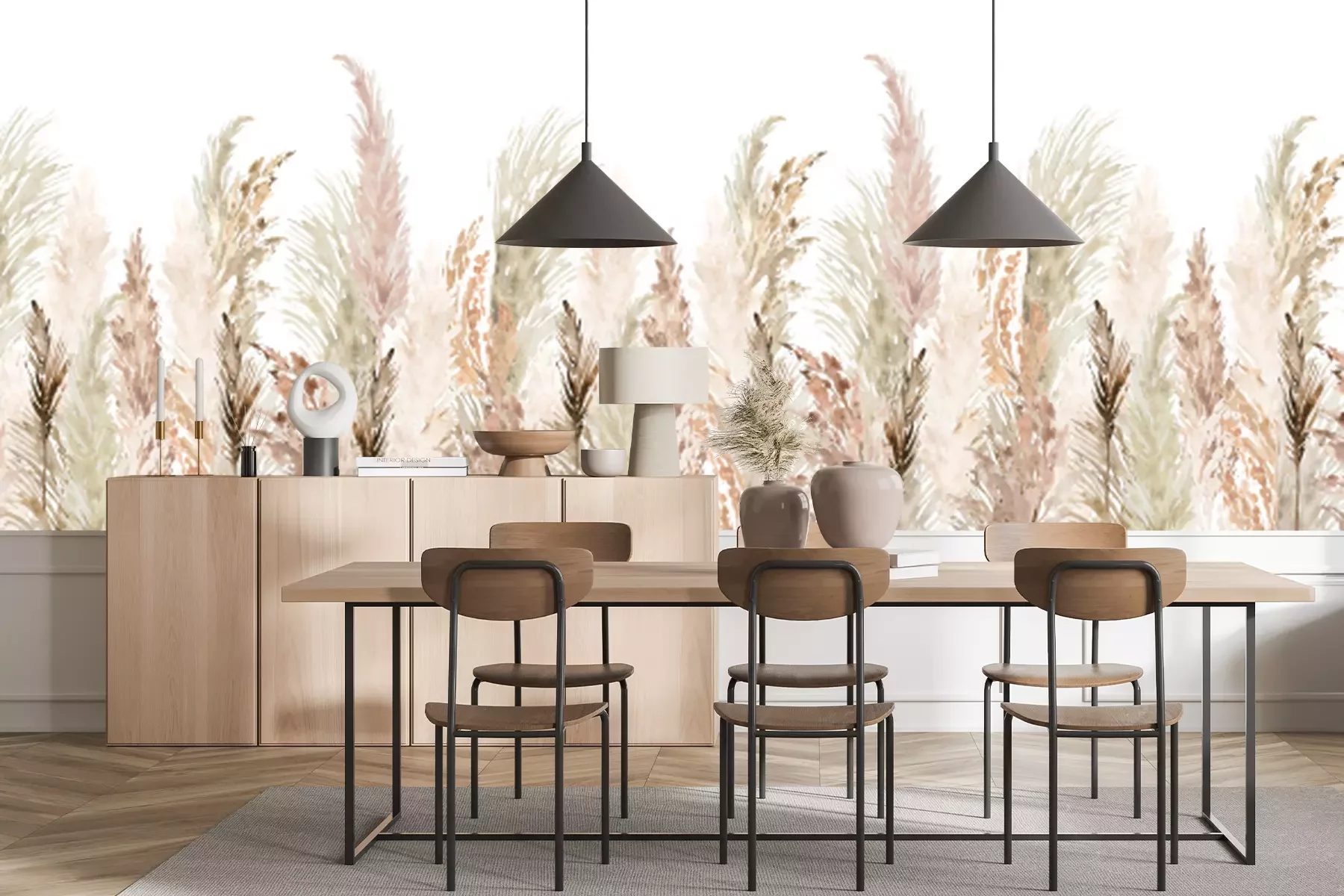 Sticker  Watercolor pampas grass seamless border. Boho dried grass and leaves neutral colors bouquet. Botanical nature design isolated on white. Bohemian style wedding invitation, greeting, card, postcard