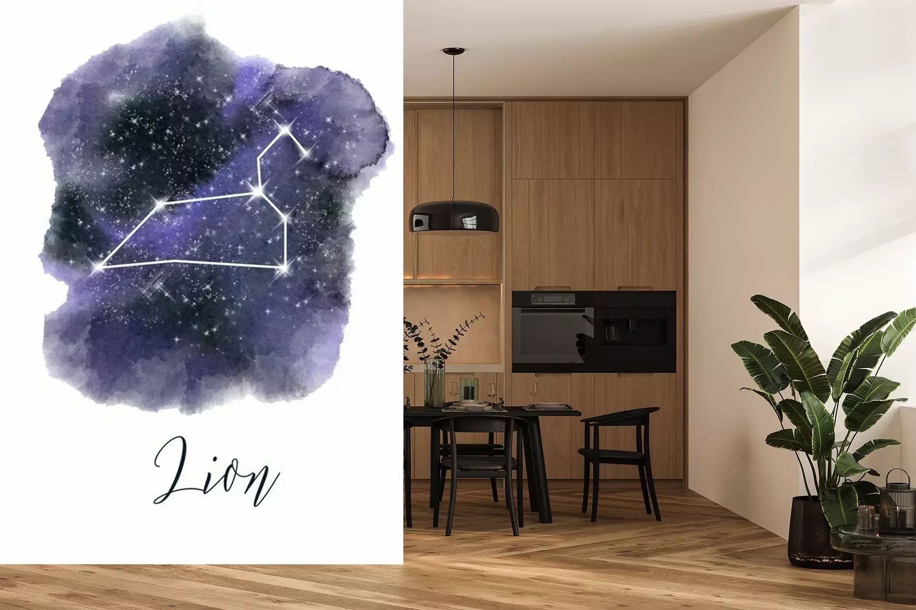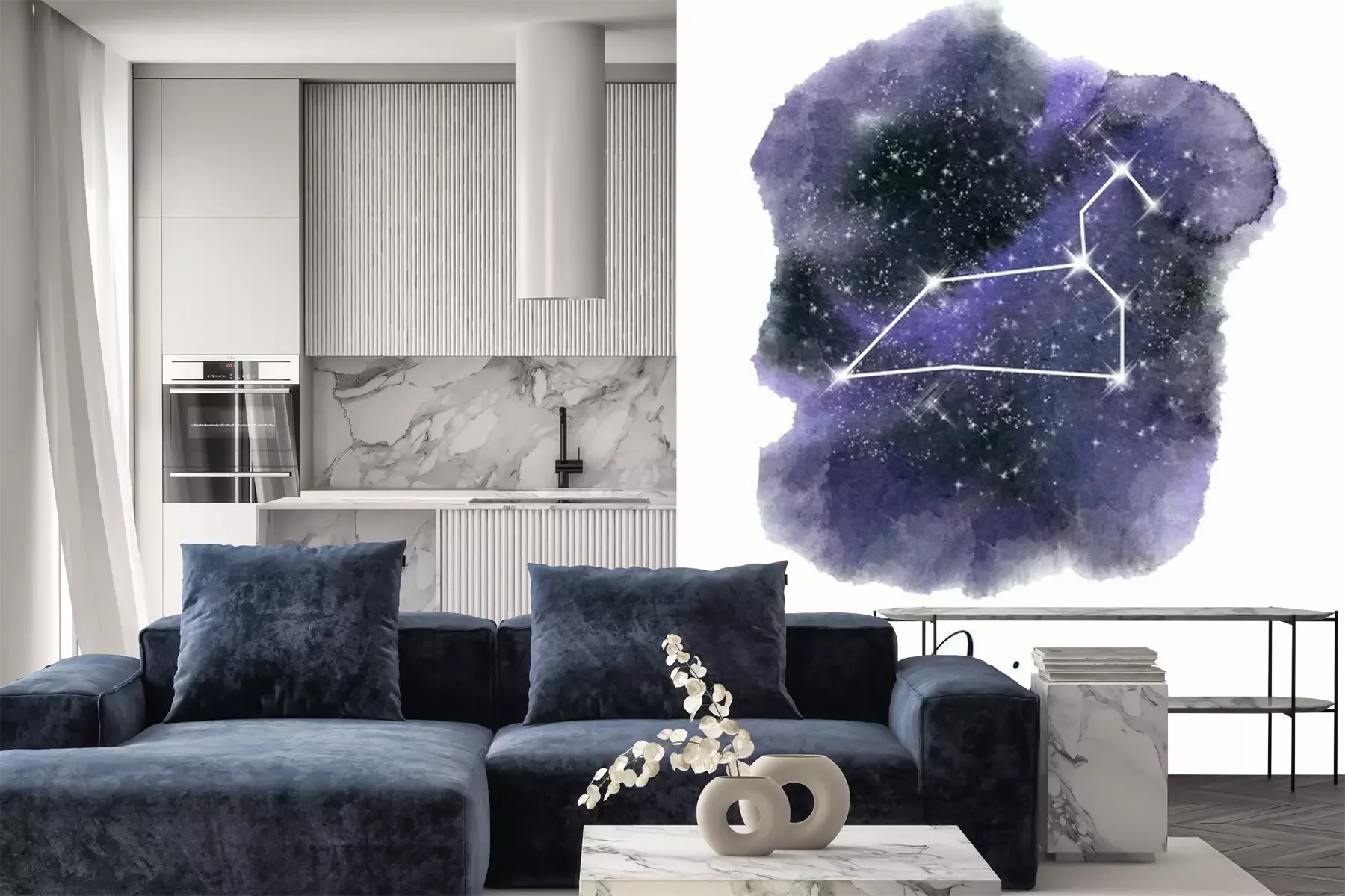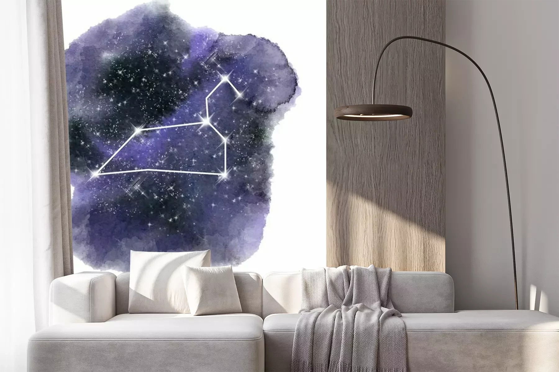 Sticker  Zodiac sign Leo. Dark blue hand drawn watercolor night sky with stars. Rough, artistic edges. Raster version.