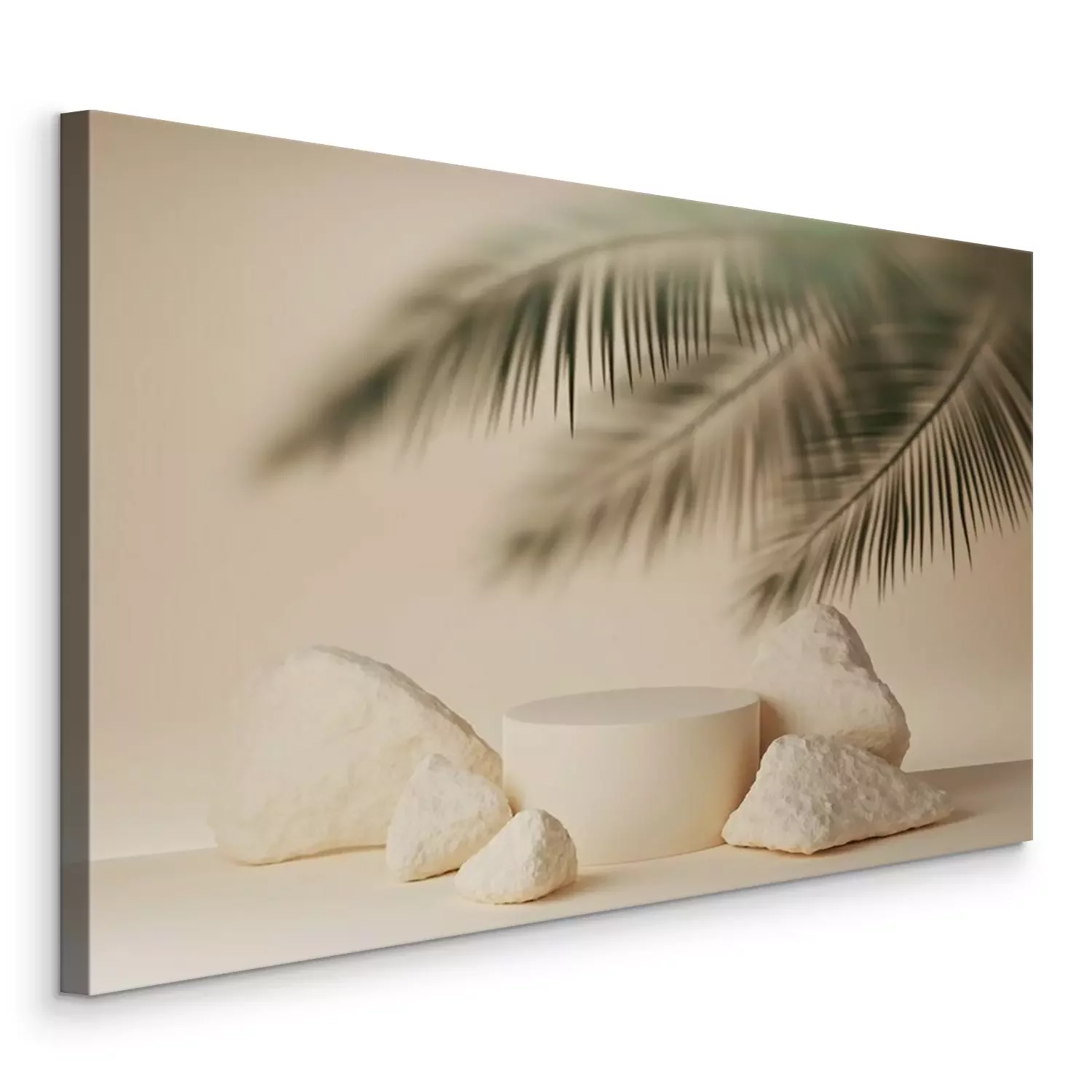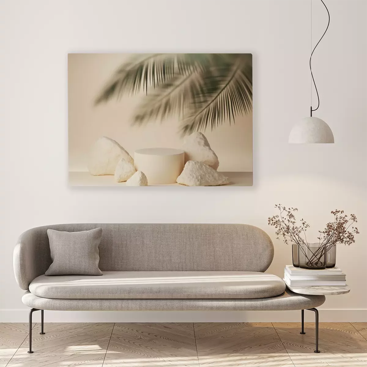 Tableau : 3D beige podium display with palm leaf behind frosted glass. Summer pastel background with stones and cylinder pedestal for product promotion. Beauty holiday mockup. 3D render trendy banner template