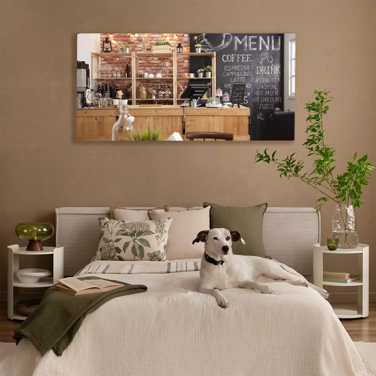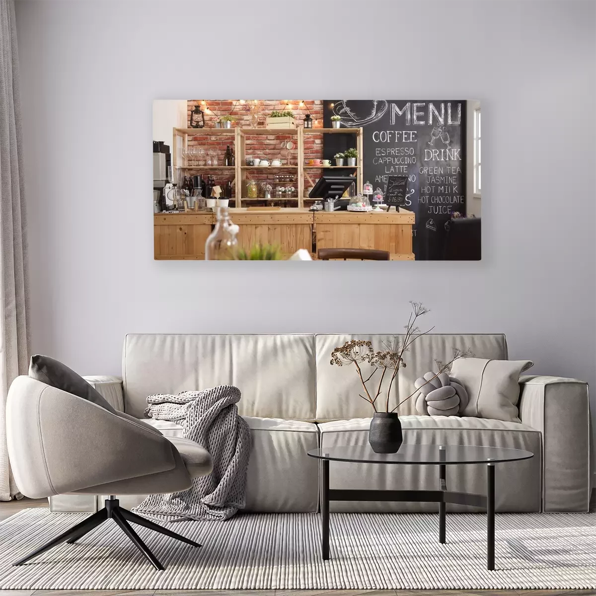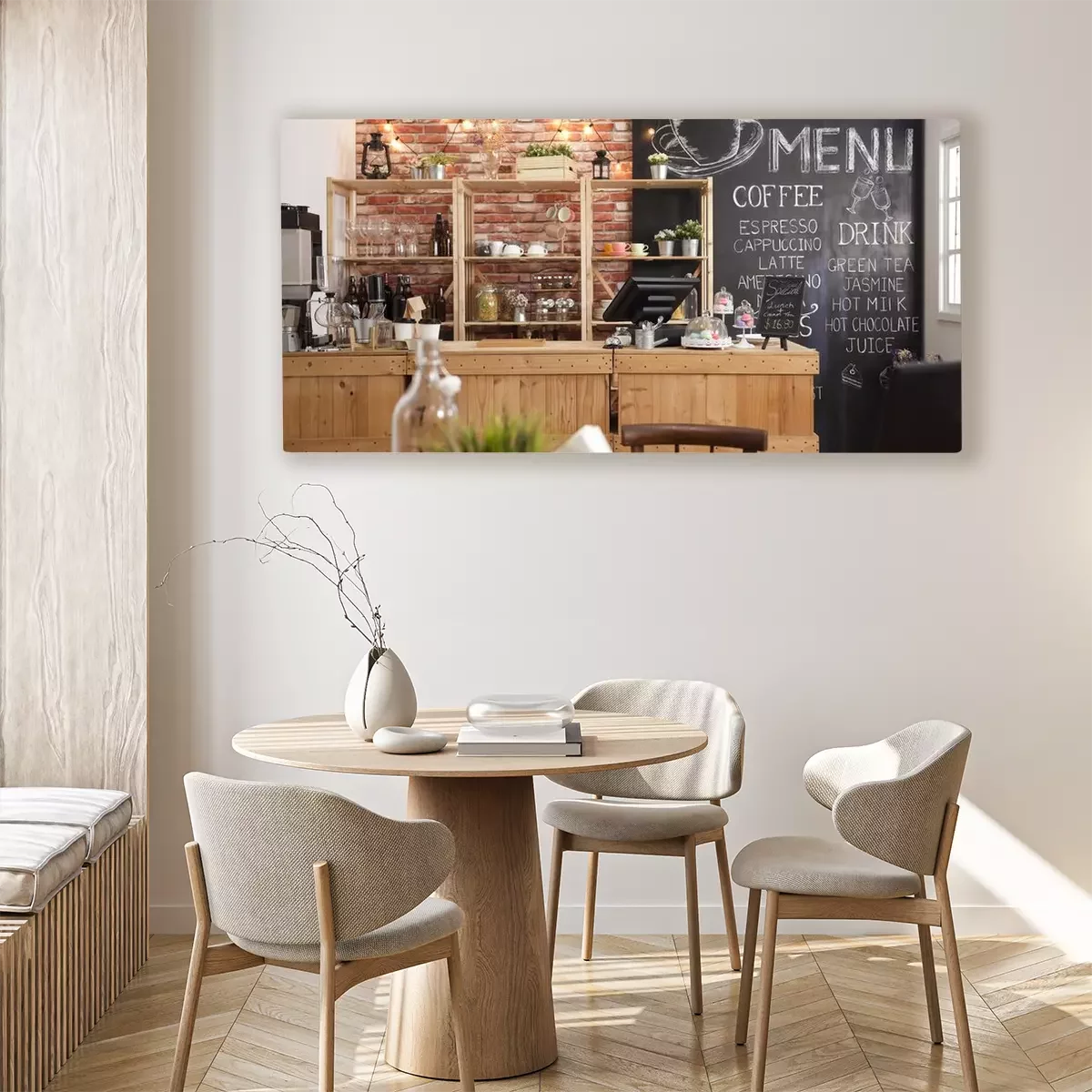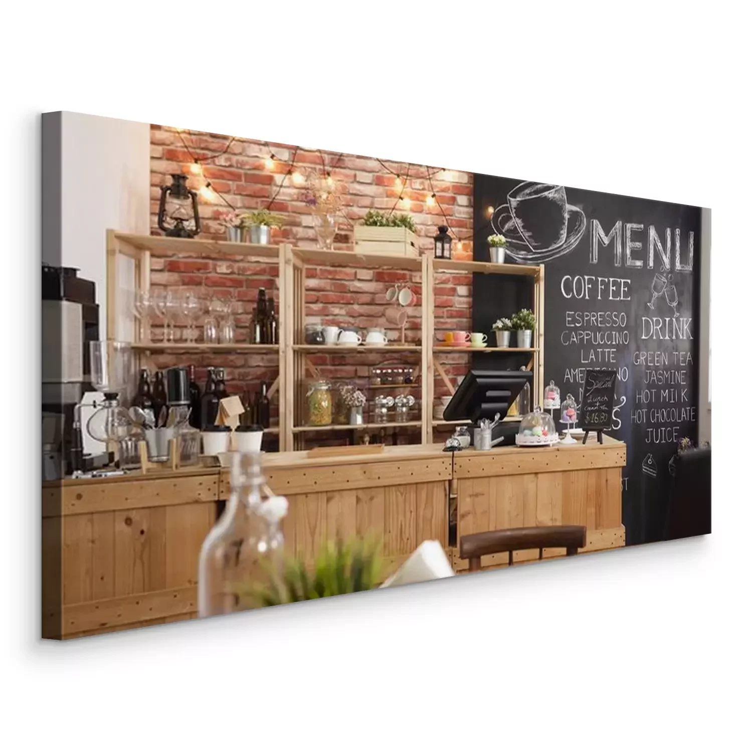 Tableau : 3d render of cafe bar restaurant nobody indoor. Empty coffee shop interior daytime with wooden design counter red brick wall in background. menu writing on blackboard with beautiful letters and cup.