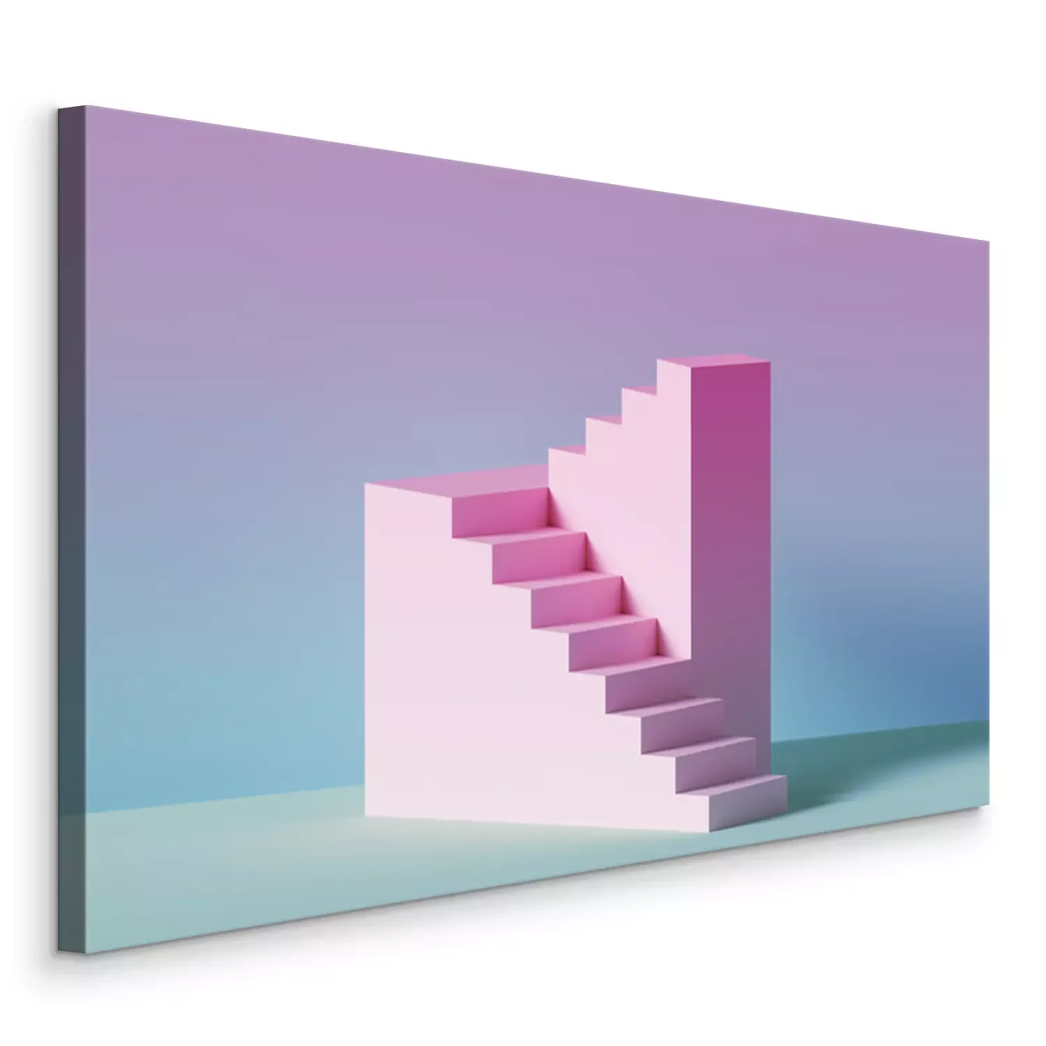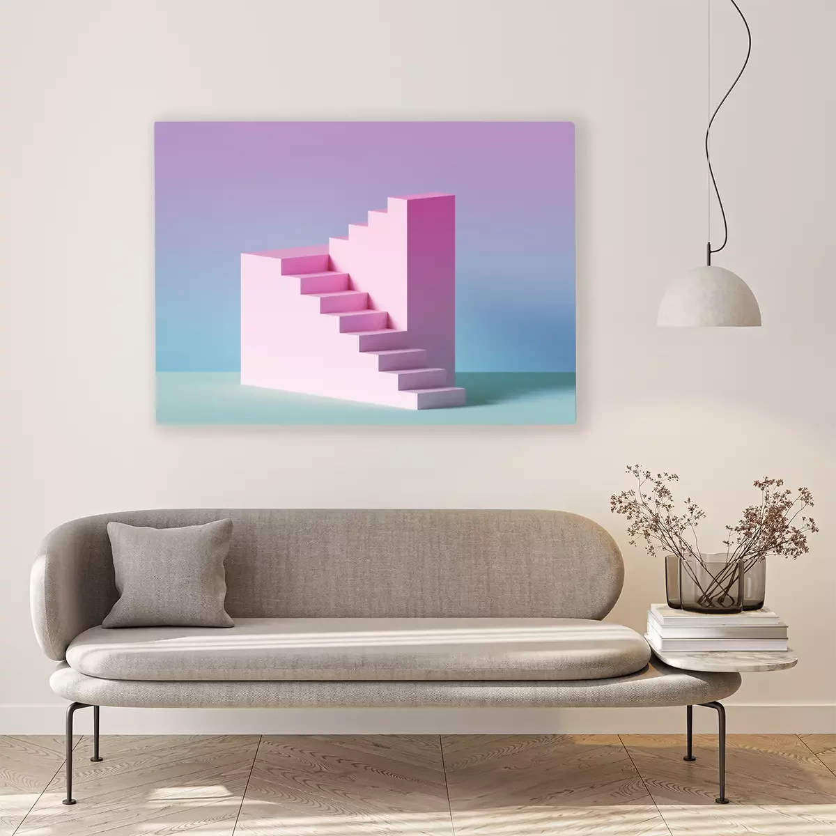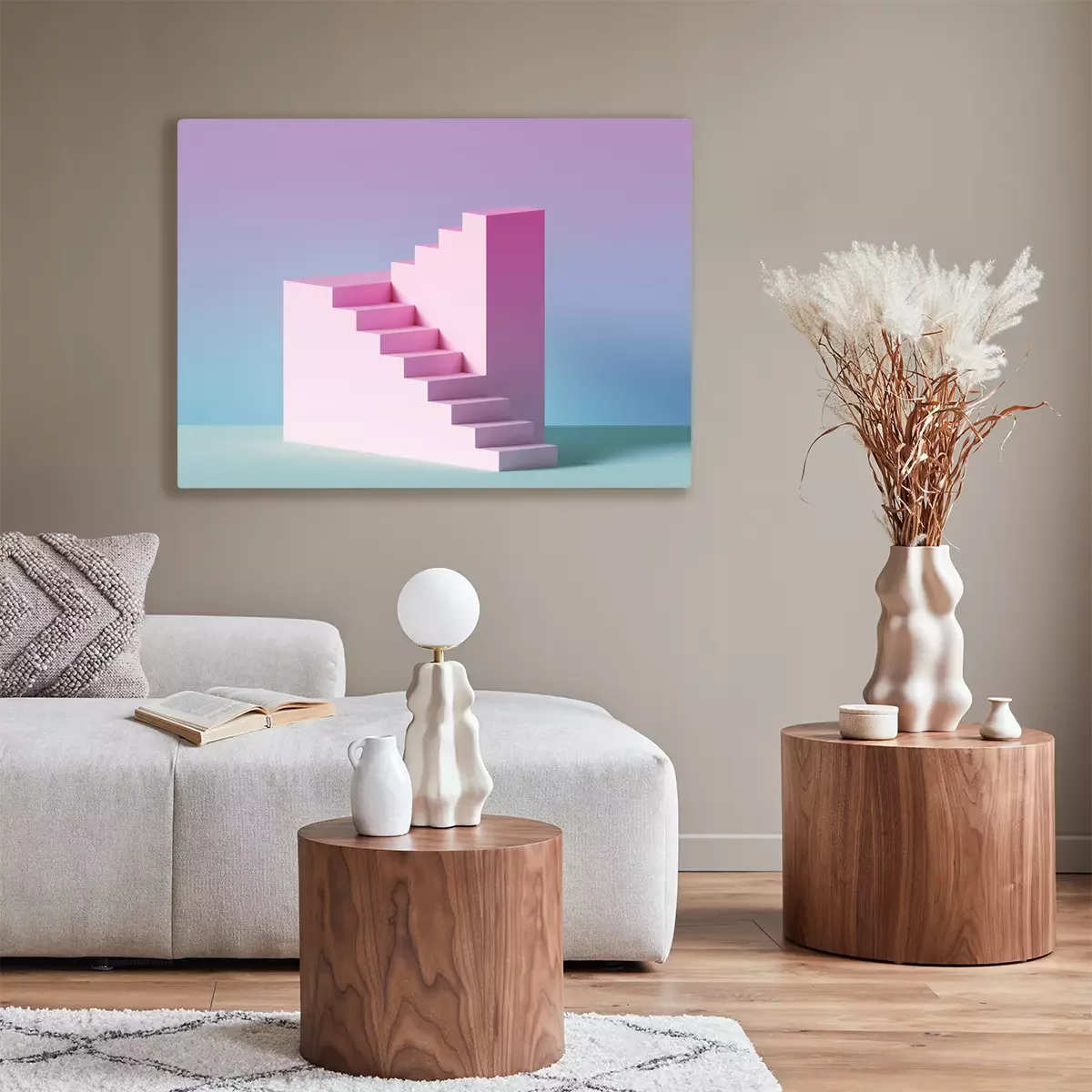 Tableau : 3d render, pink stairs, steps, abstract background in pastel colors, fashion podium, minimal scene, architectural block, design element