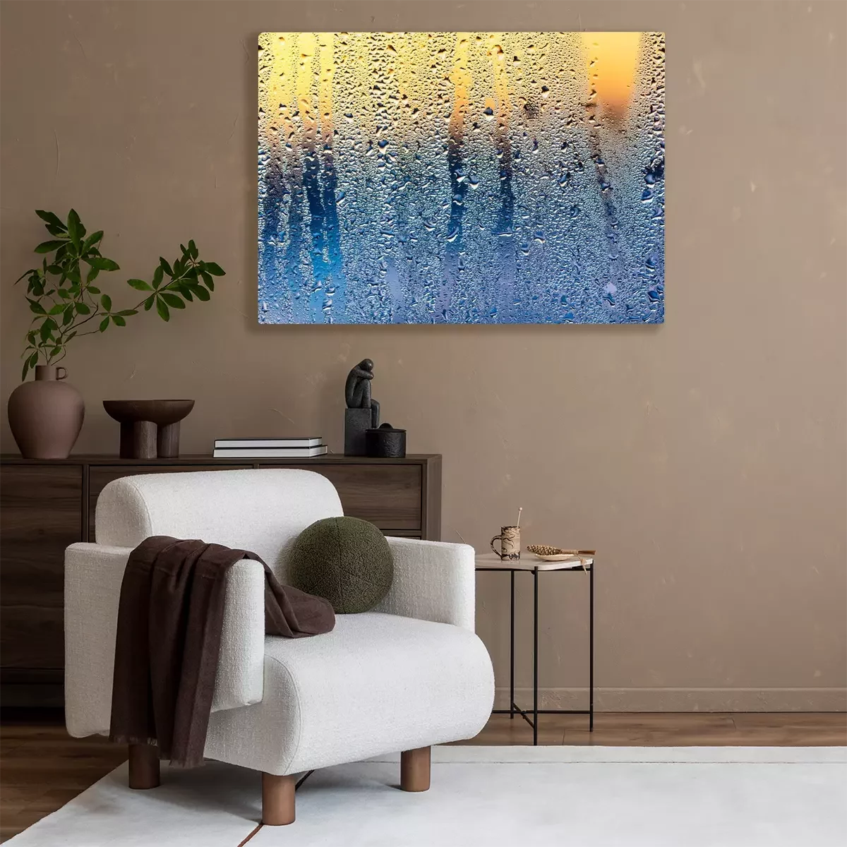 Tableau  A foggy window at sunset as an abstract background