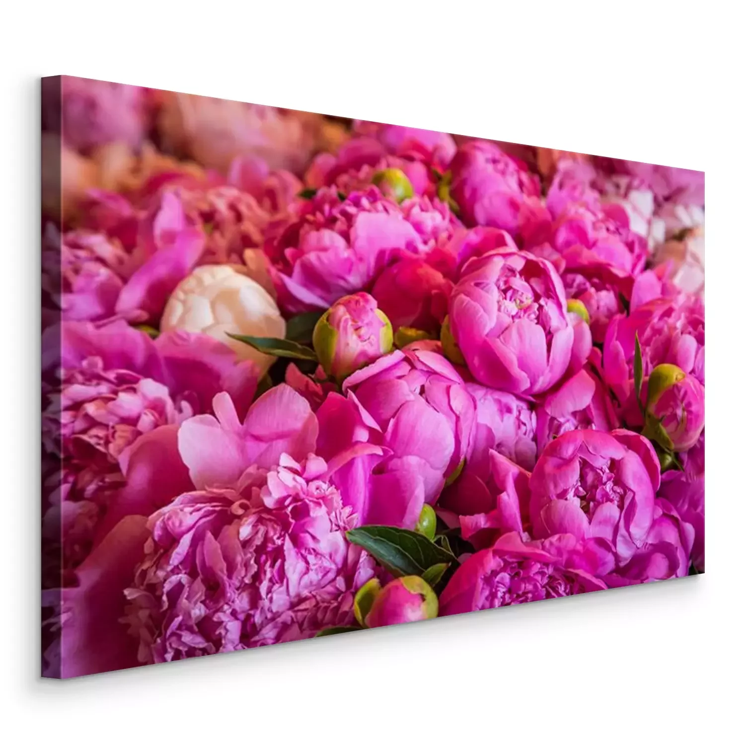 Tableau  A full frame photograph of pretty pink peonies for sale on a market stall, with a shallow depth of field