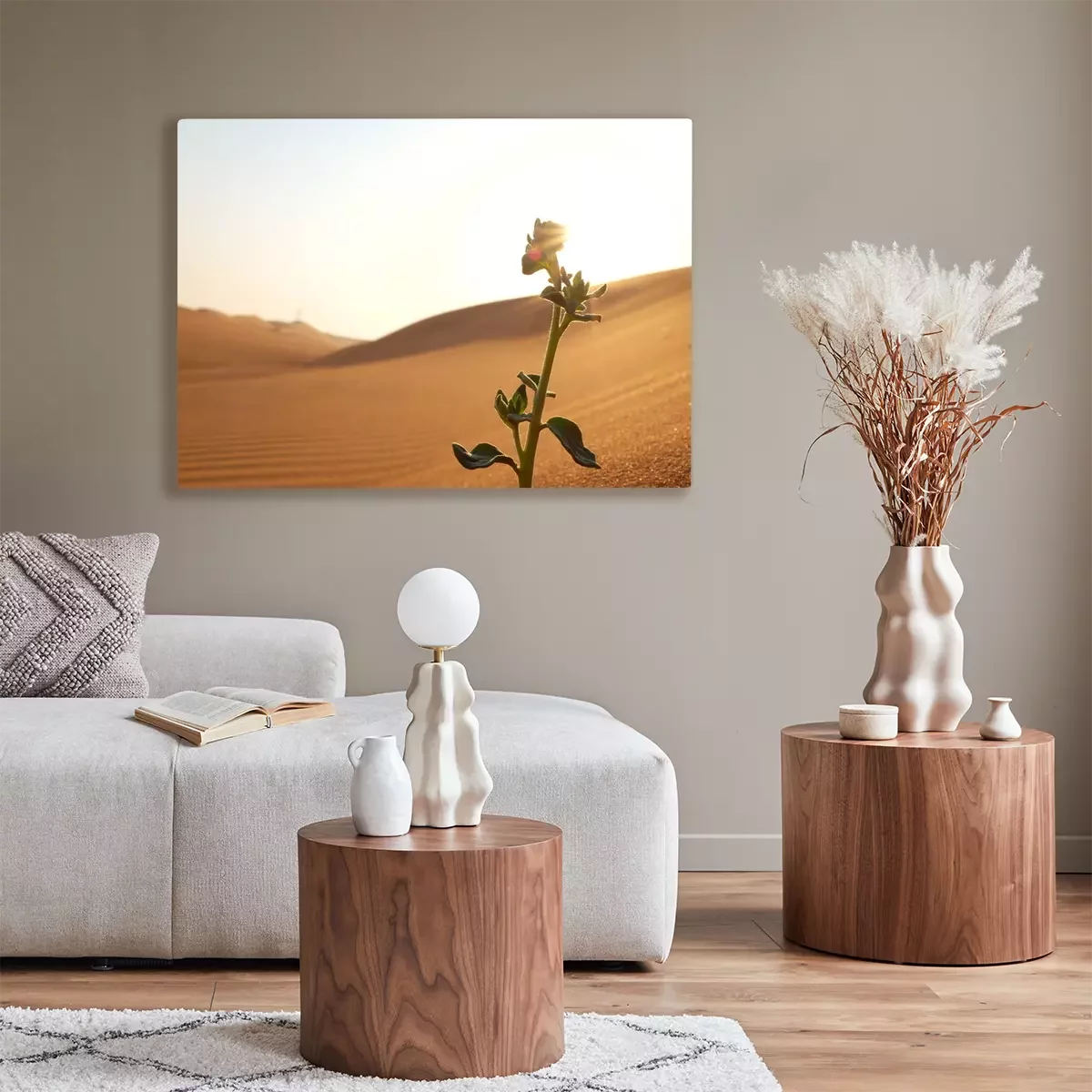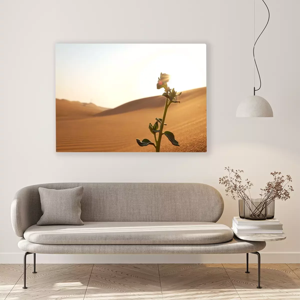 Tableau  A silhouette of a growing plant on a hot and dry desert land showing sprong season, hope and new life concept