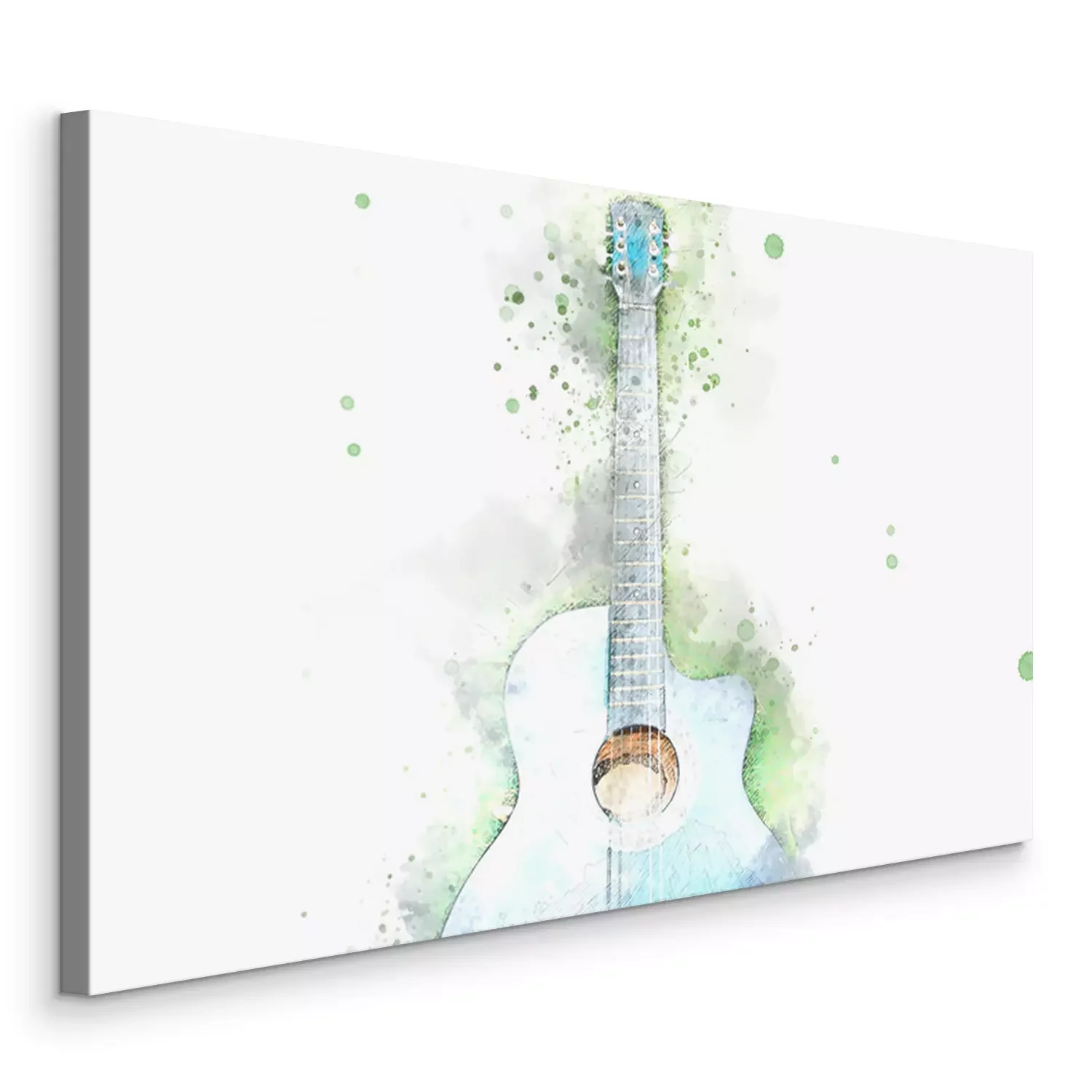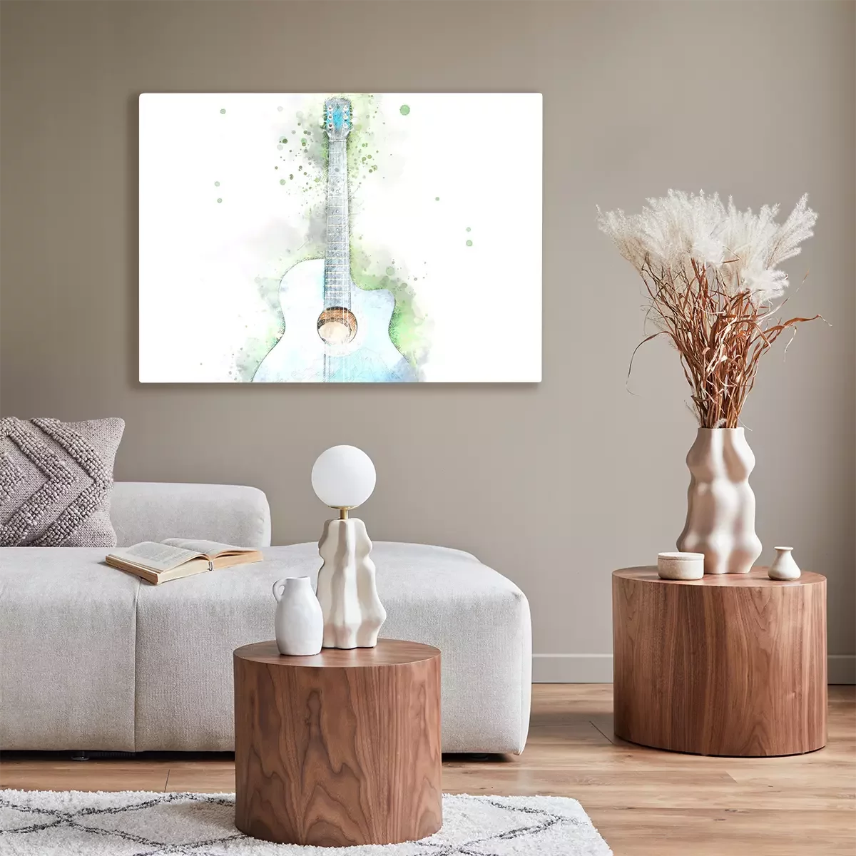 Tableau  Abstract acoustic guitar on green grass on watercolor illustration painting background.