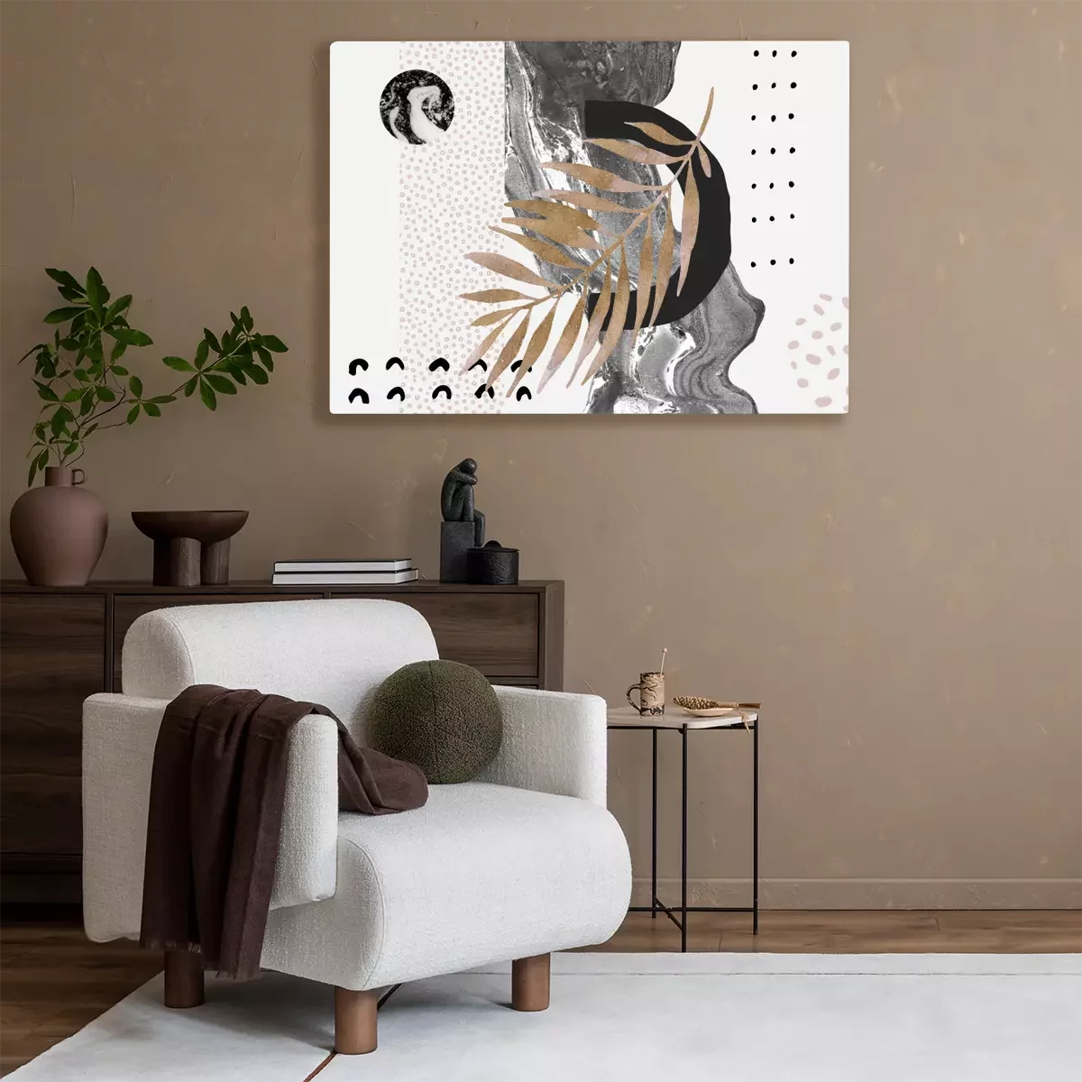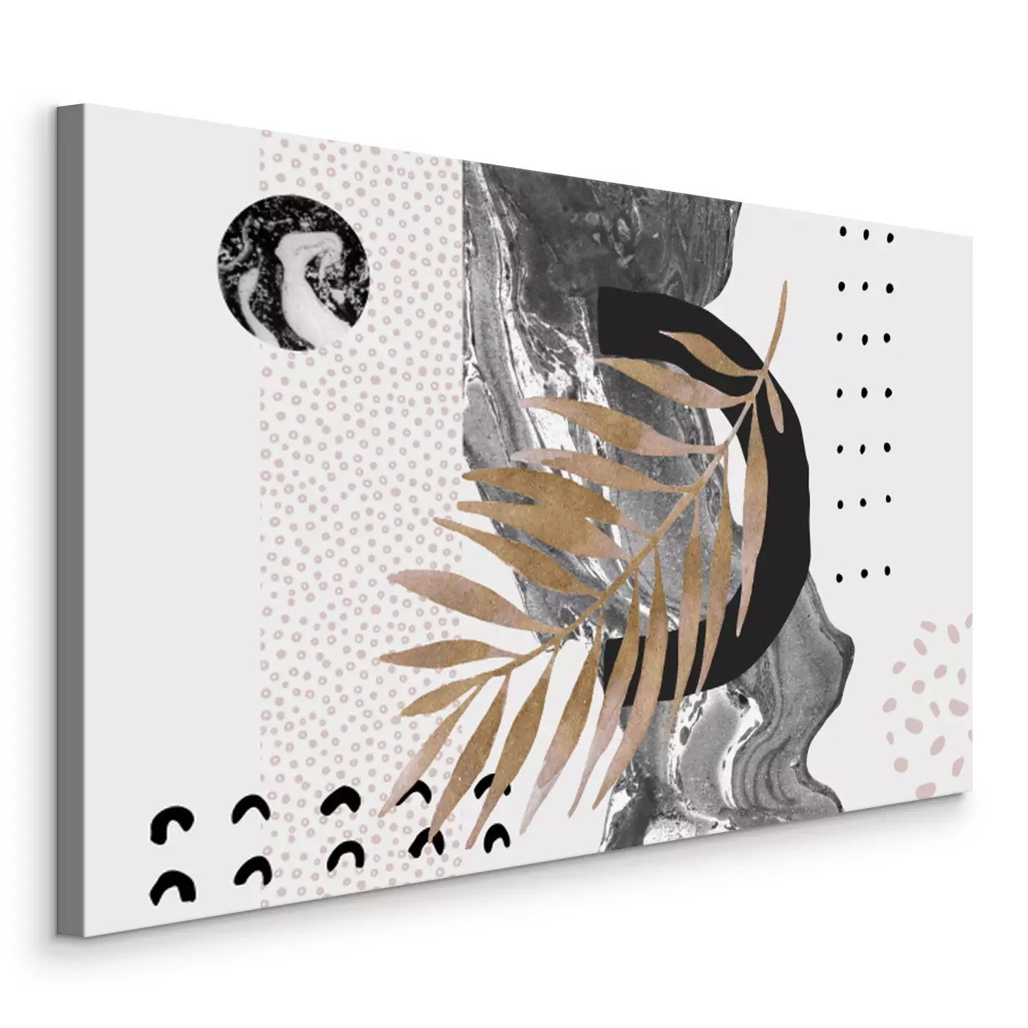 Tableau : Abstract background: dynamic marbling flow, minimal shapes, glossy golden tropical leaf