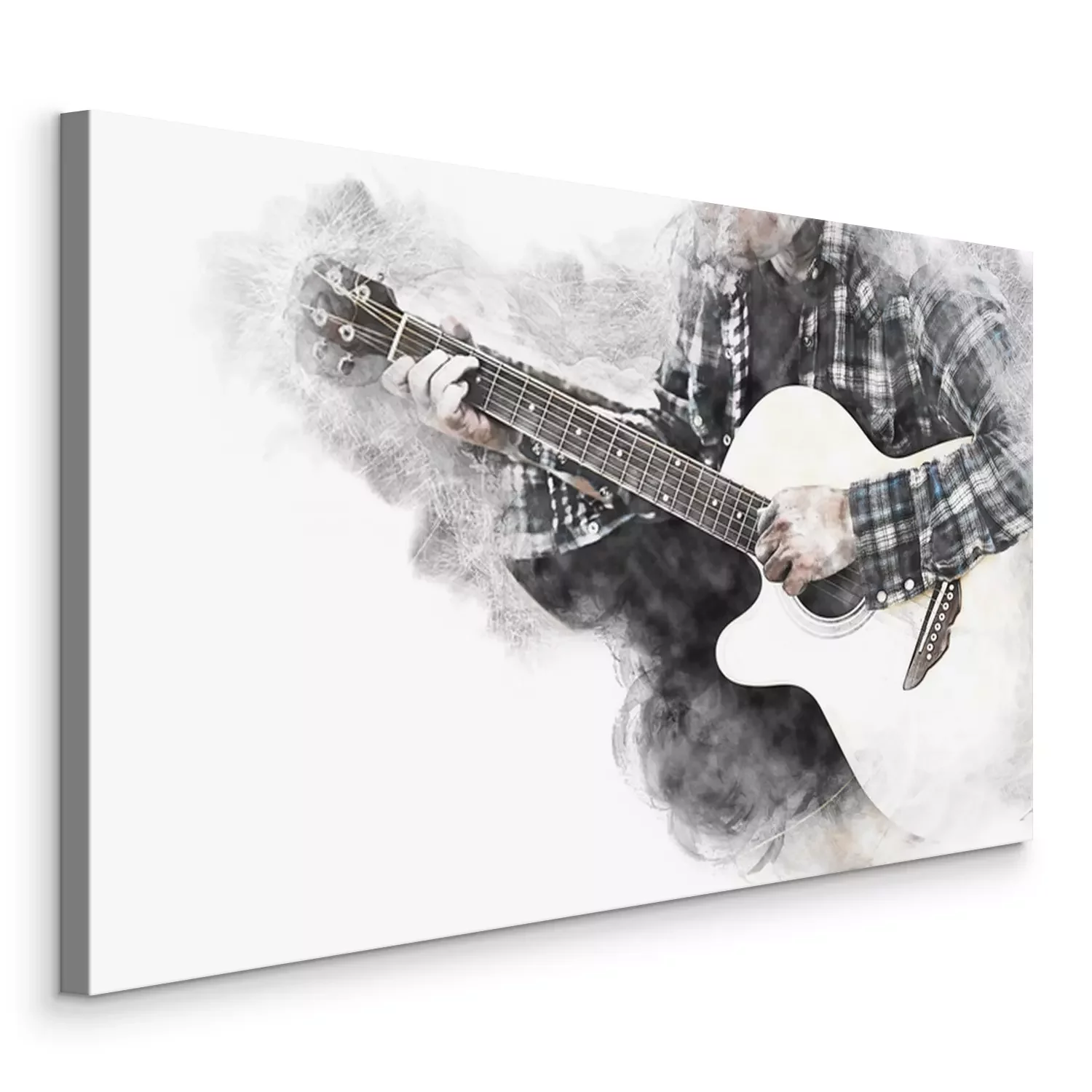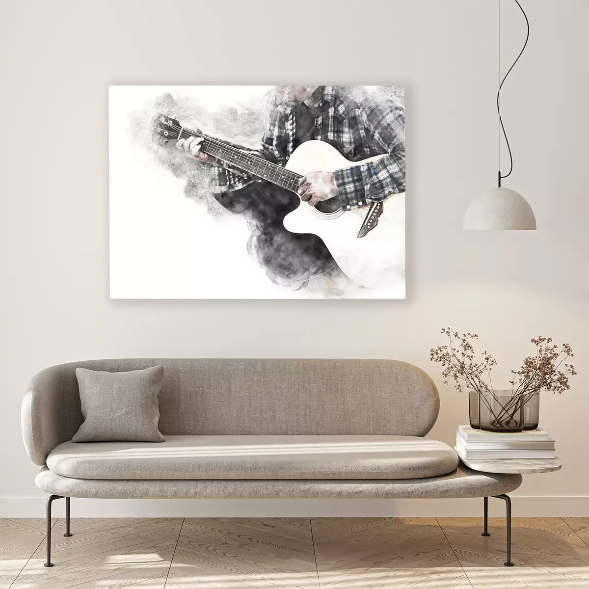 Tableau  Abstract beautiful man guitarist playing acoustic guitar in the foreground on Watercolor painting background and Digital illustration brush to art.