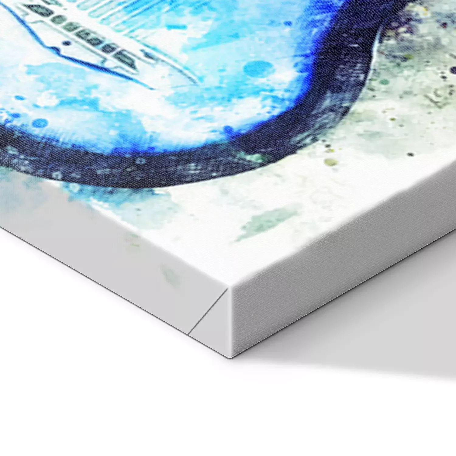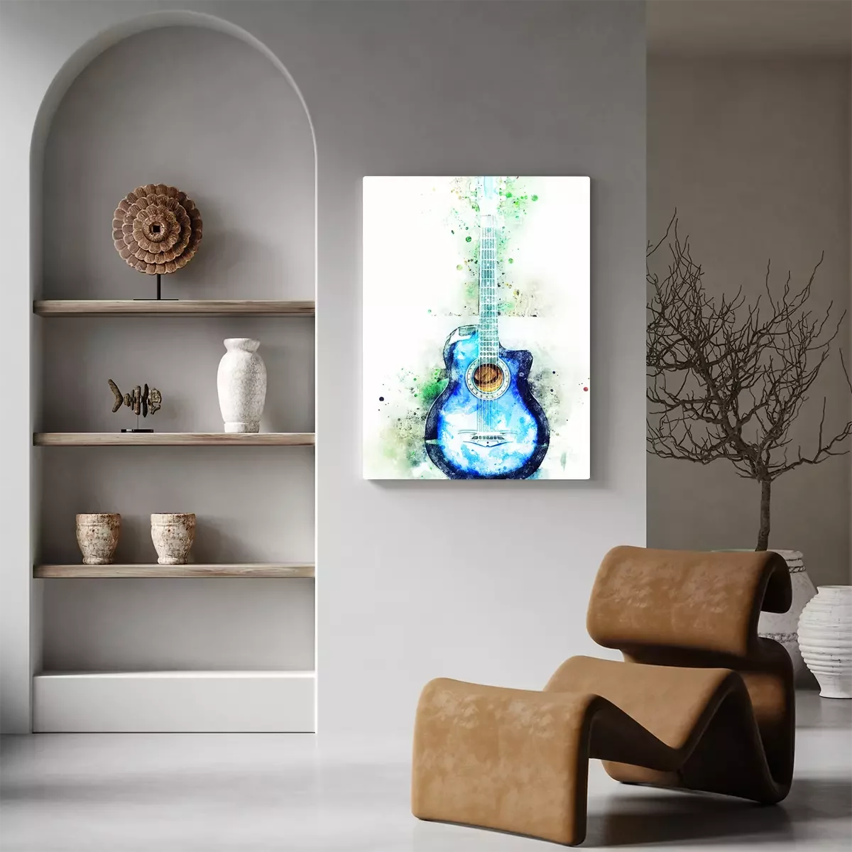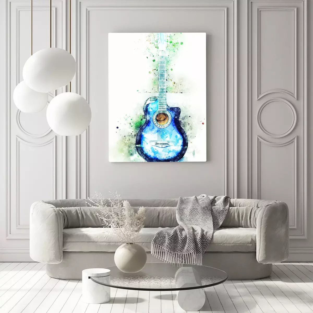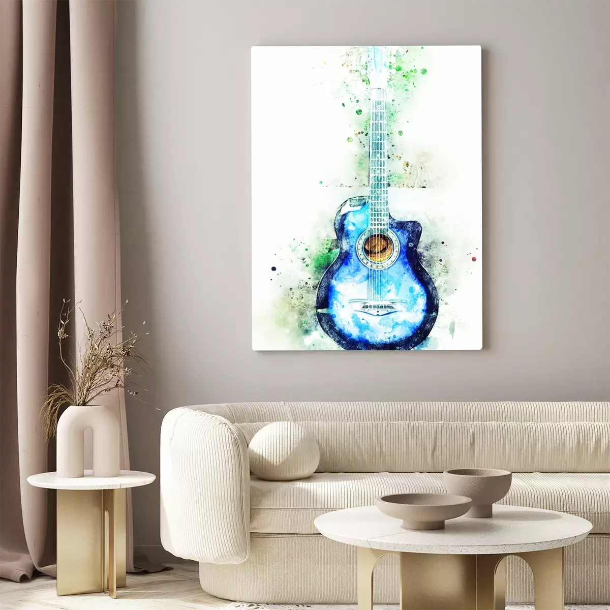 Tableau : Abstract colorful blue shape on acoustic guitar in the foreground Close up on Watercolor illustration painting background.