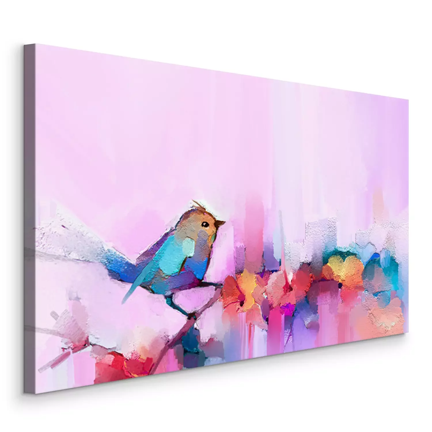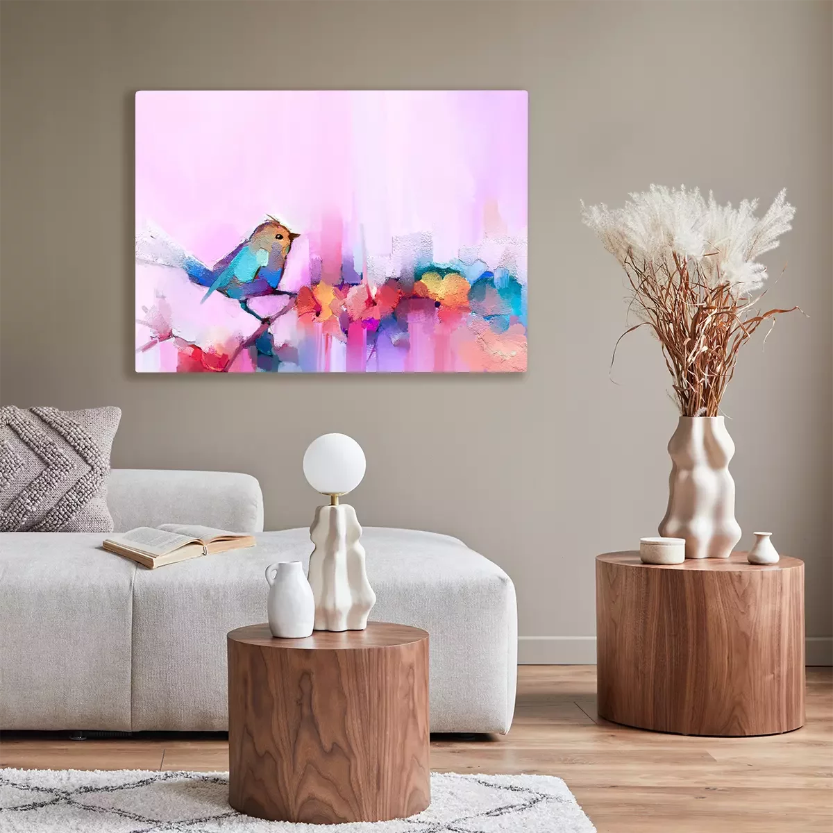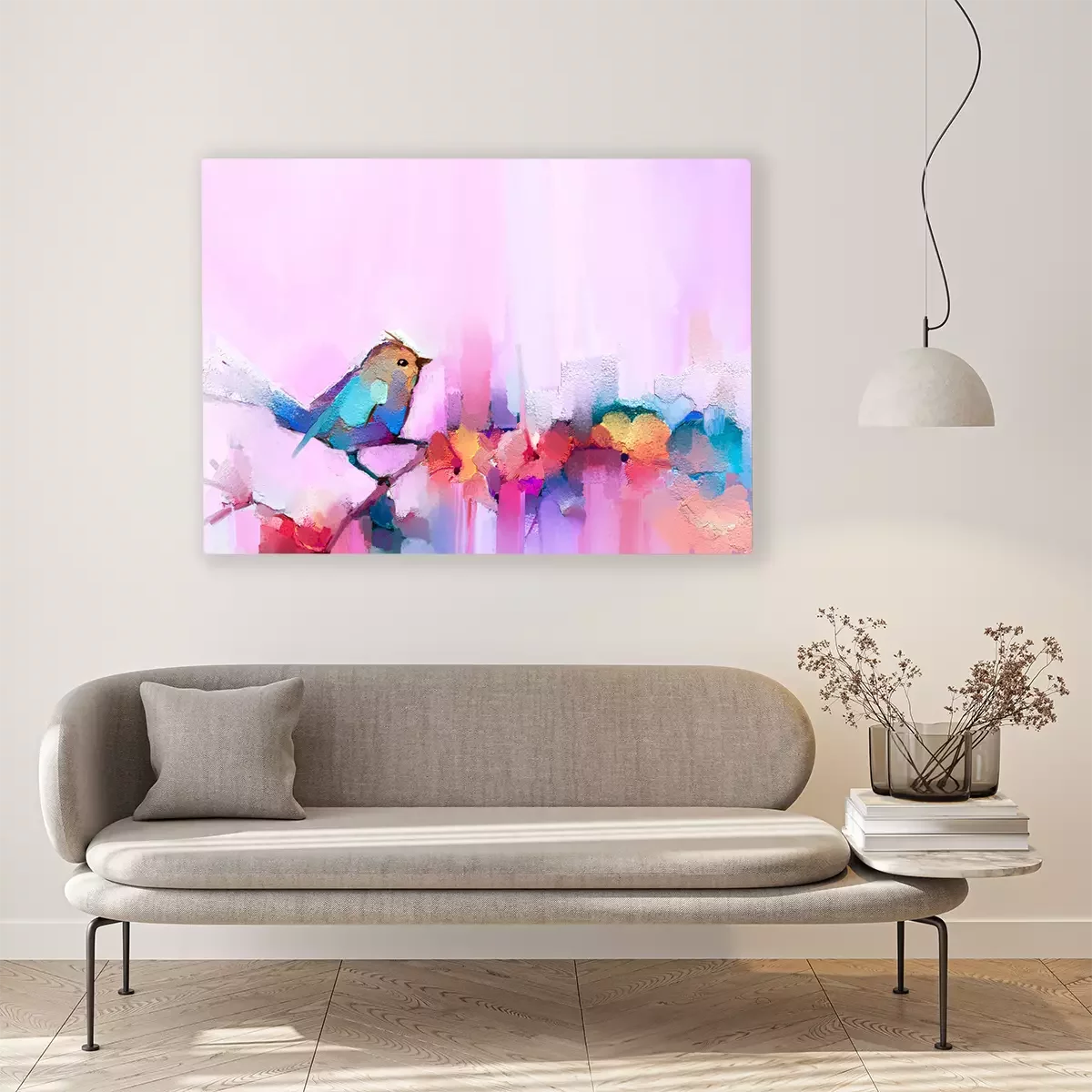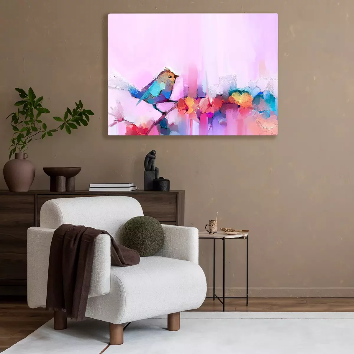 Tableau  Abstract colorful oil, acrylic painting of bird and spring flower. Modern art paintings brush stroke on canvas. Illustration oil painting, animal and floral for background.