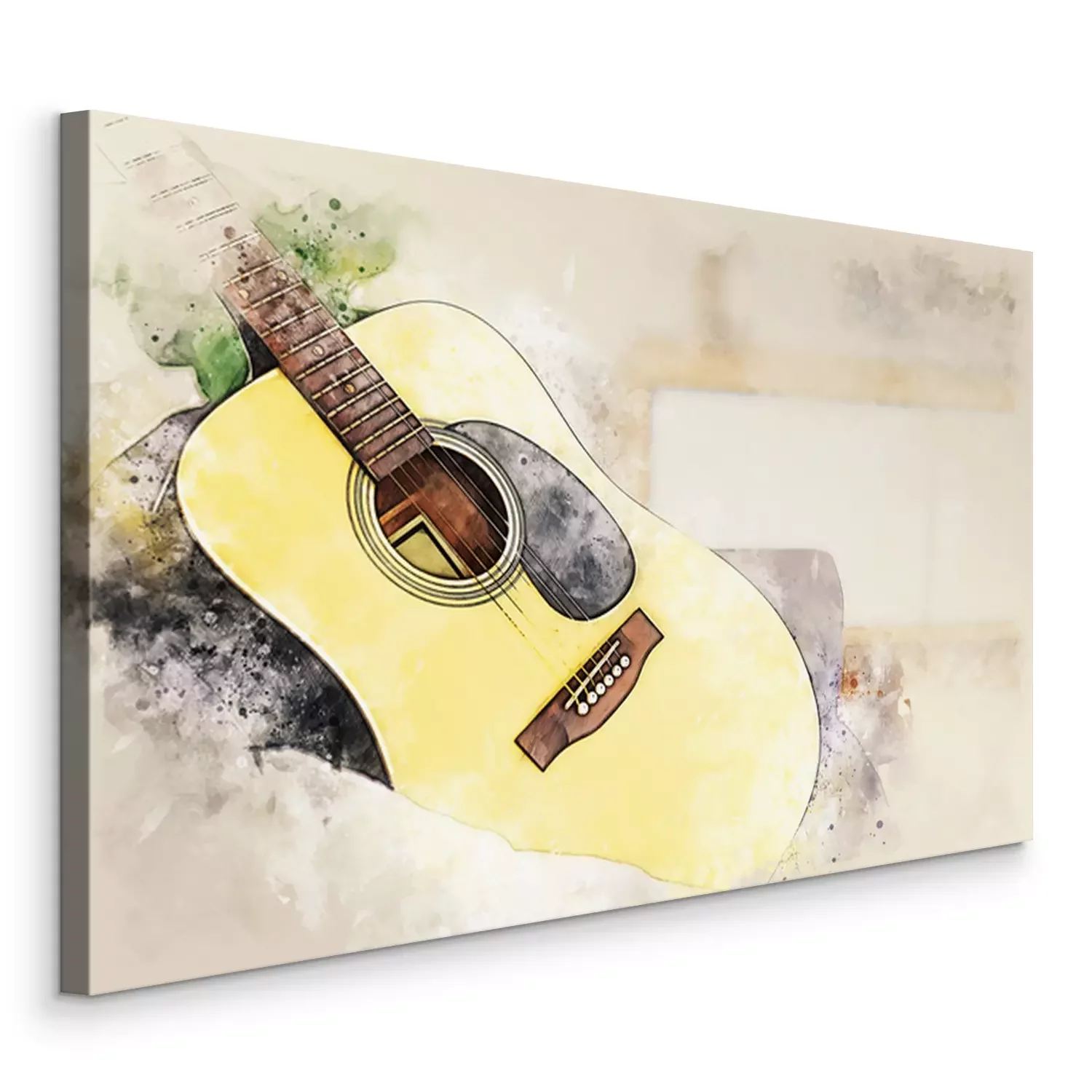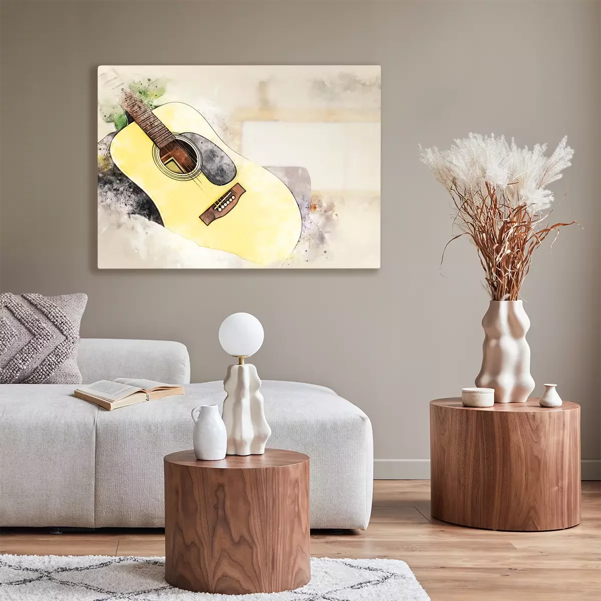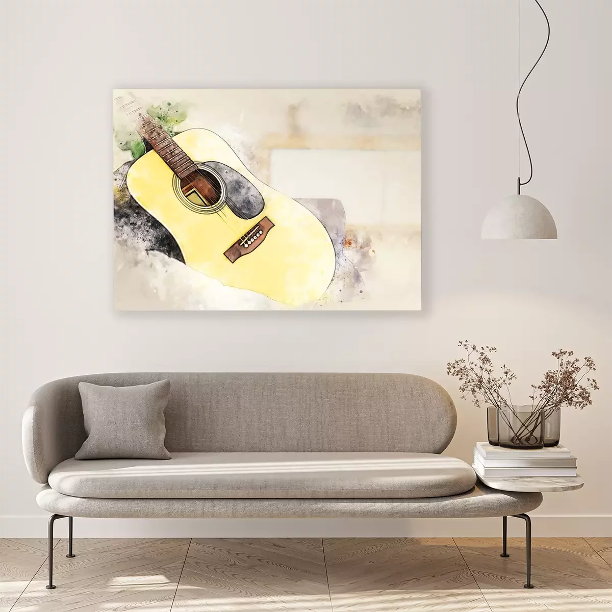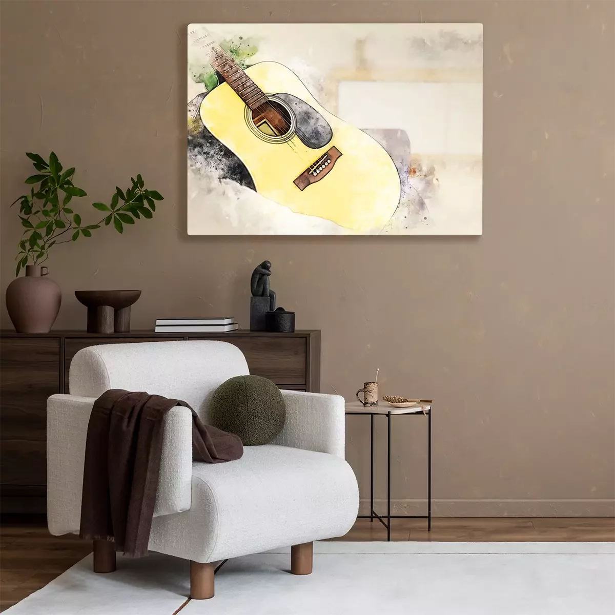 Tableau : Abstract colorful shape on acoustic guitar in the foreground on watercolor painting background and digital illustration brush to art.