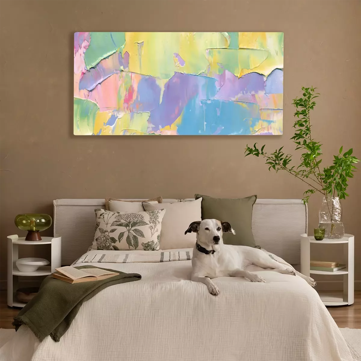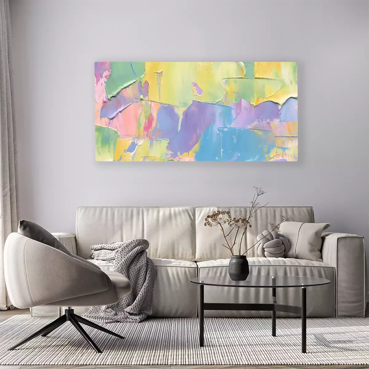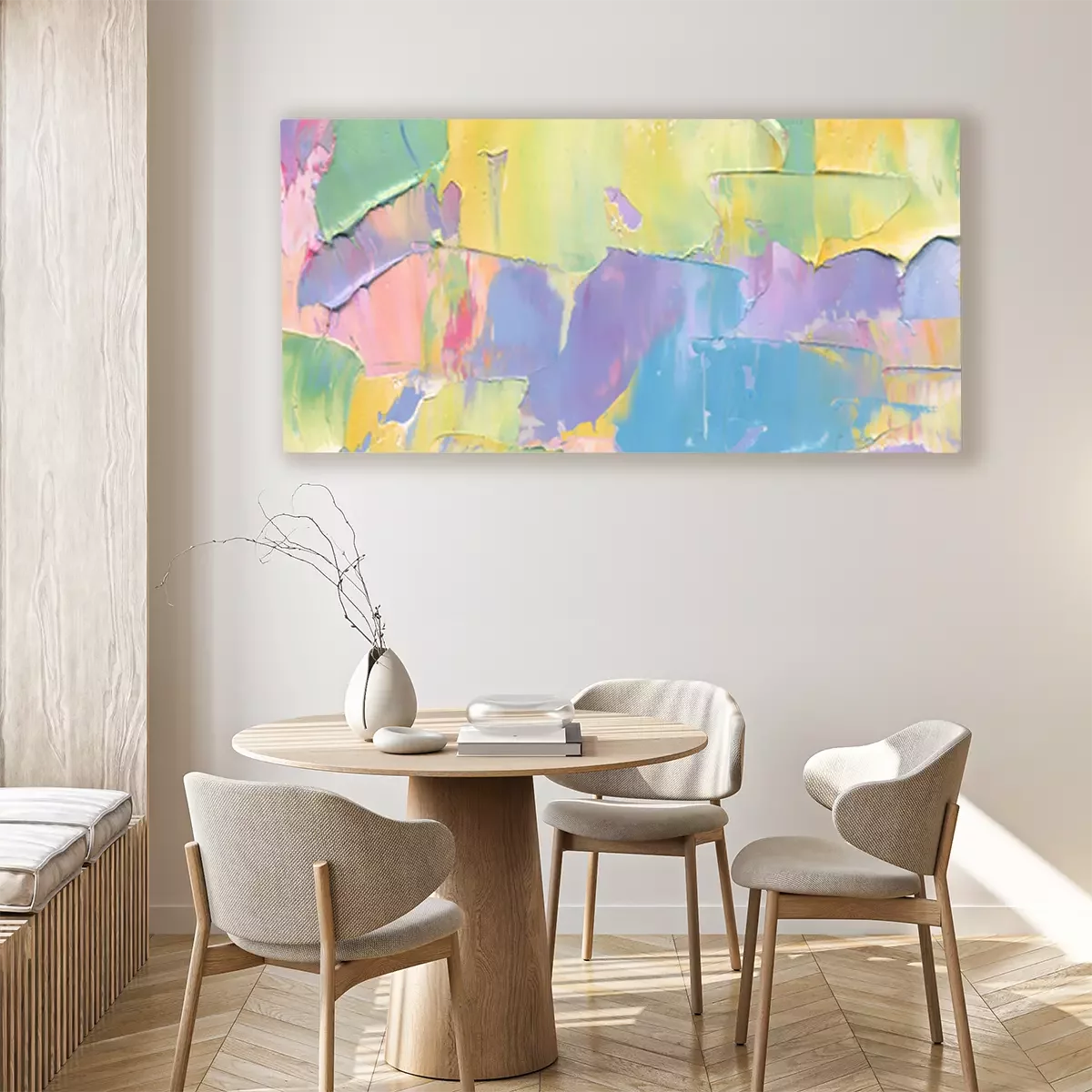 Tableau : Abstract painting background in pastel positive color as wallpaper, pattern, art print, textured fonts, shapes etc. Natural texture of oil paint. High quality details.