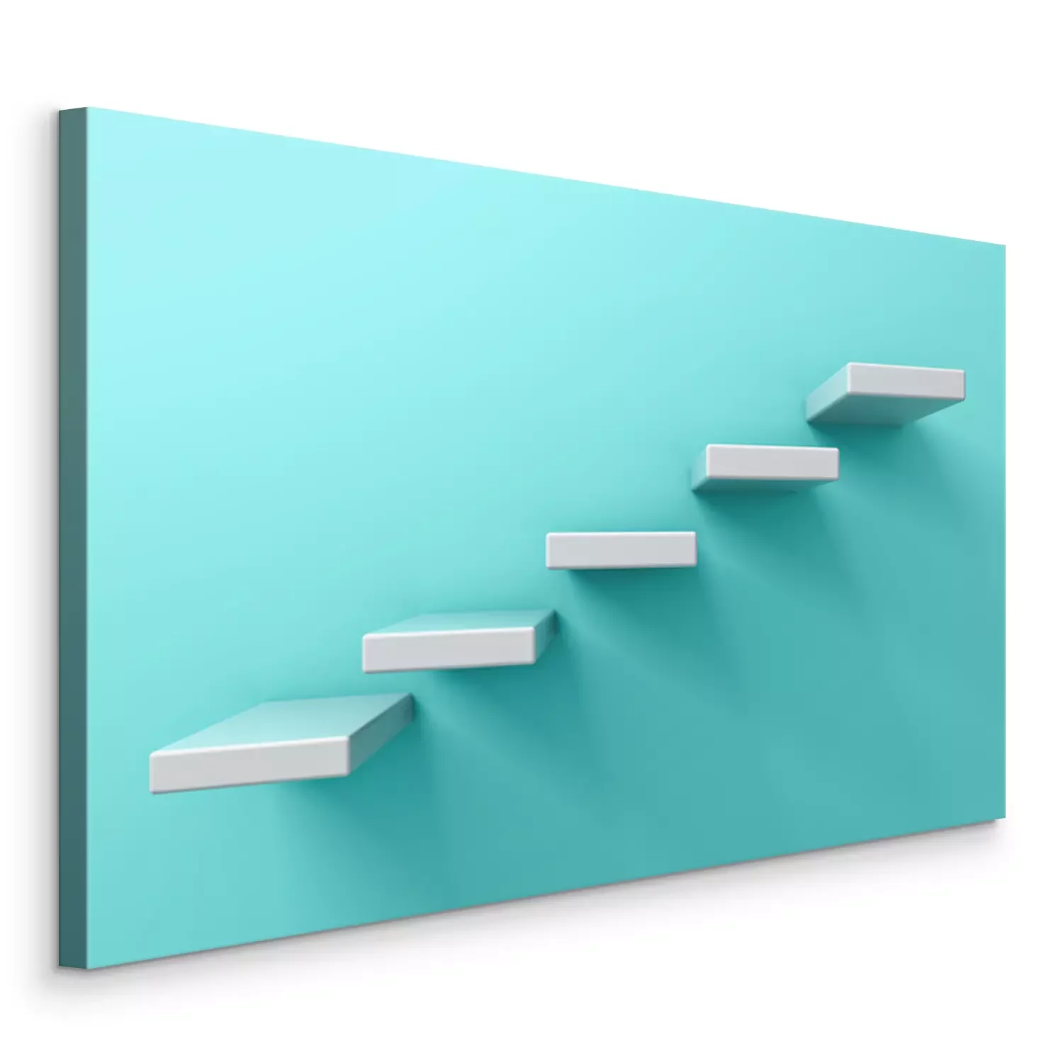 Tableau : Abstract white stairs or five steps business concept on blue green pastel color wall background with shadow 3D rendering