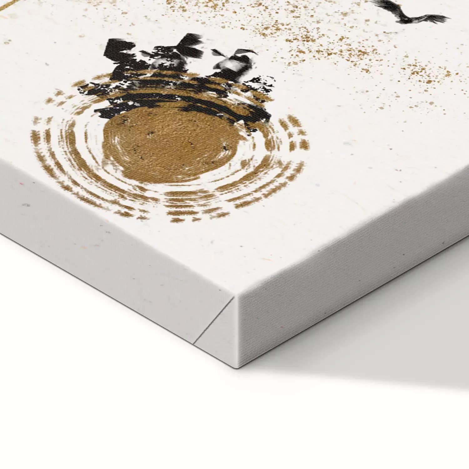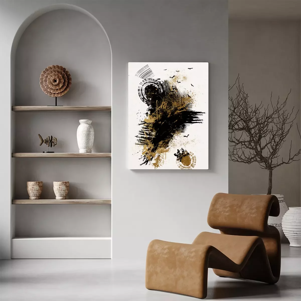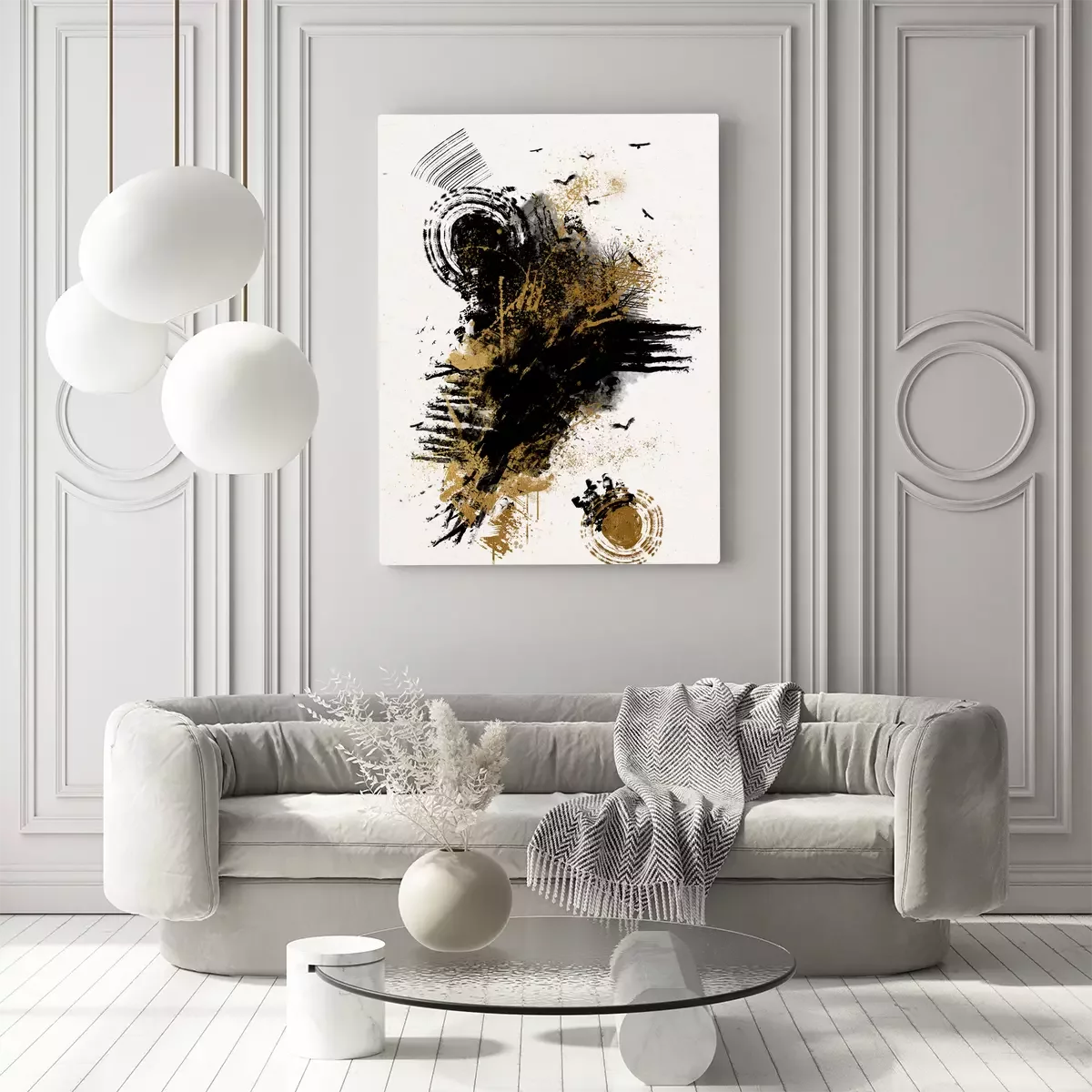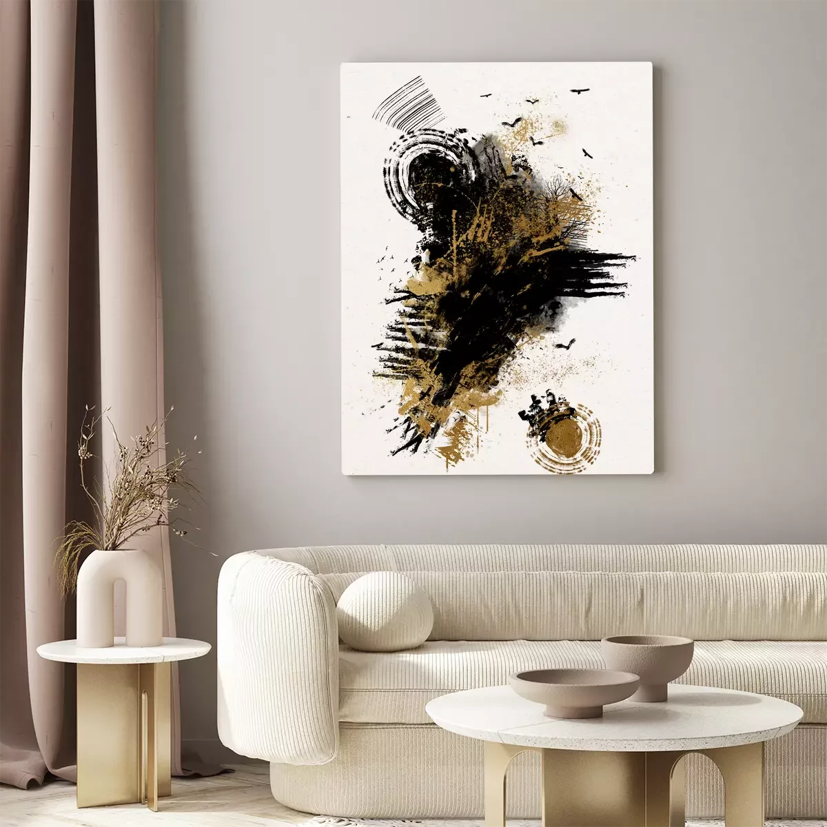 Abstraction noire et or avec des oiseaux dans un style dynamique