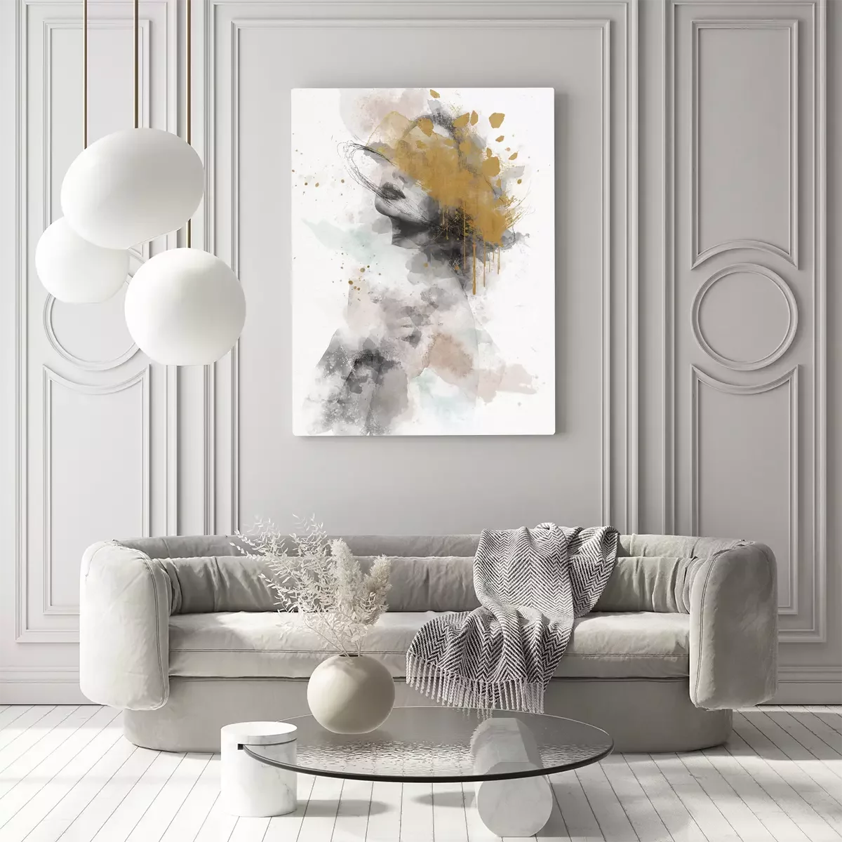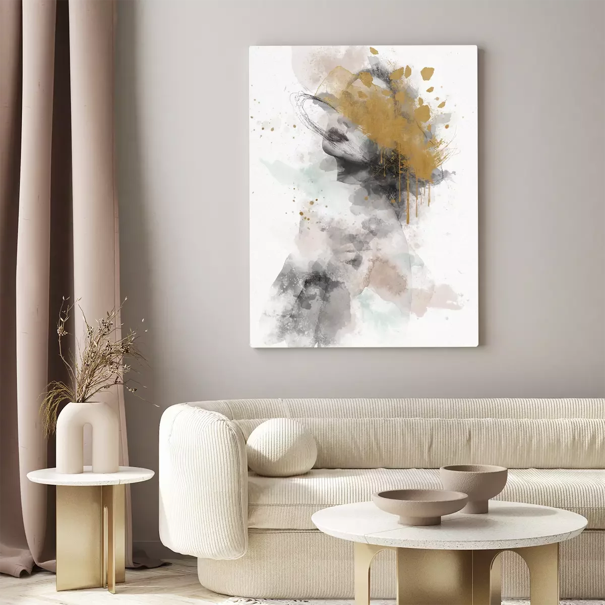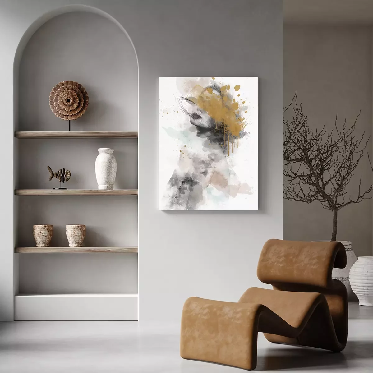Abstraction représentant un visage de femme aux couleurs vives et aux reflets dorés.