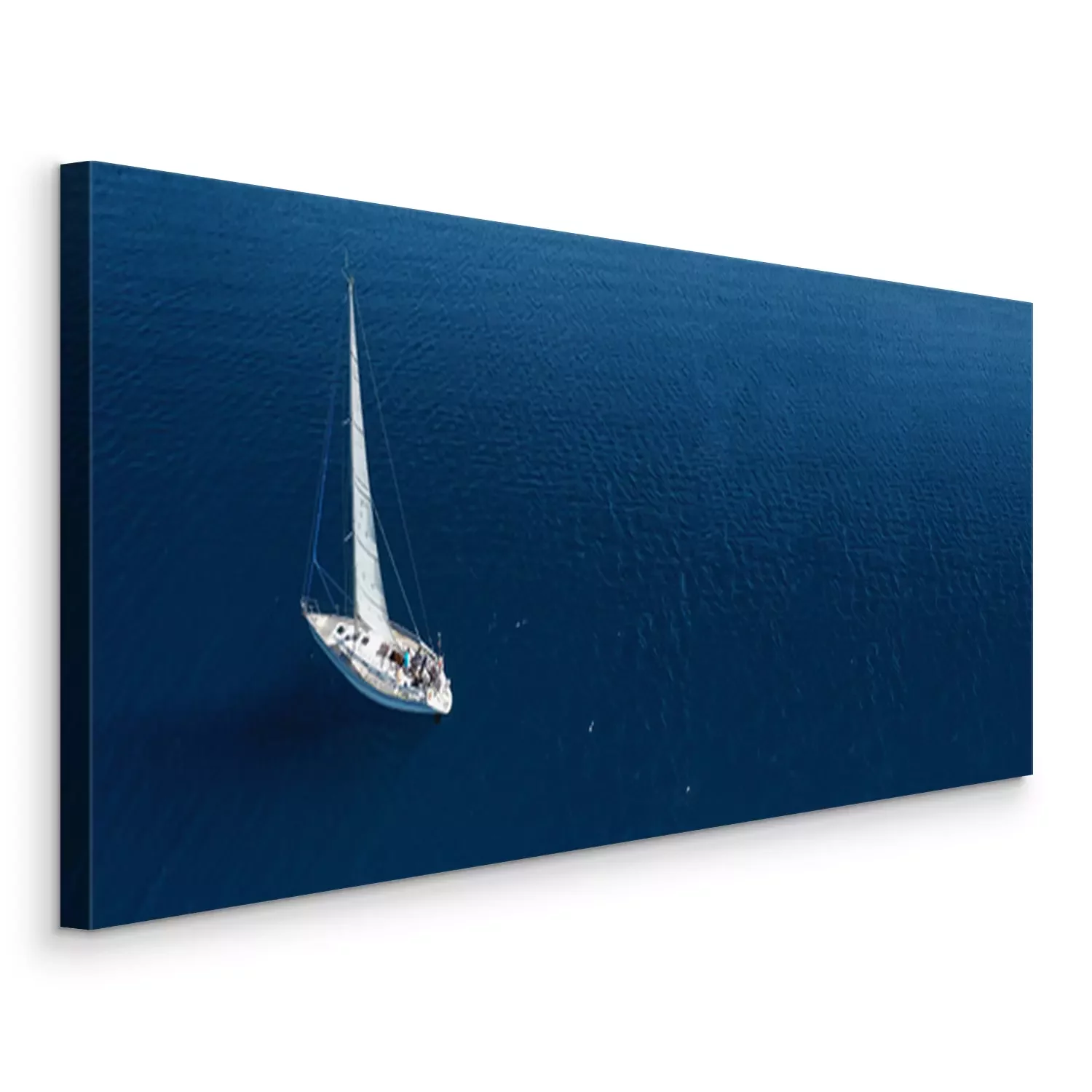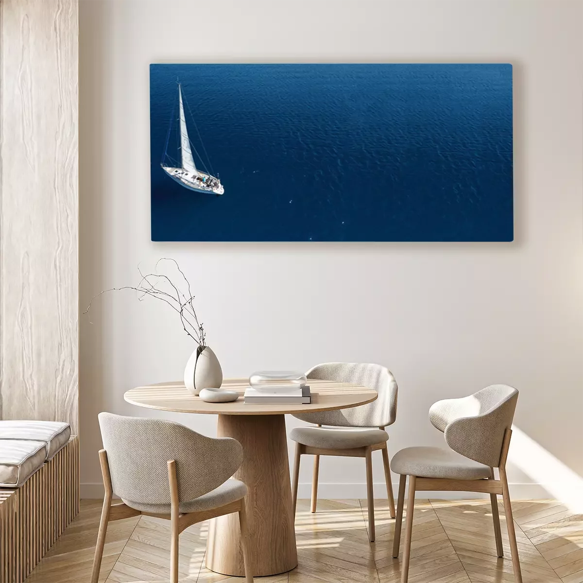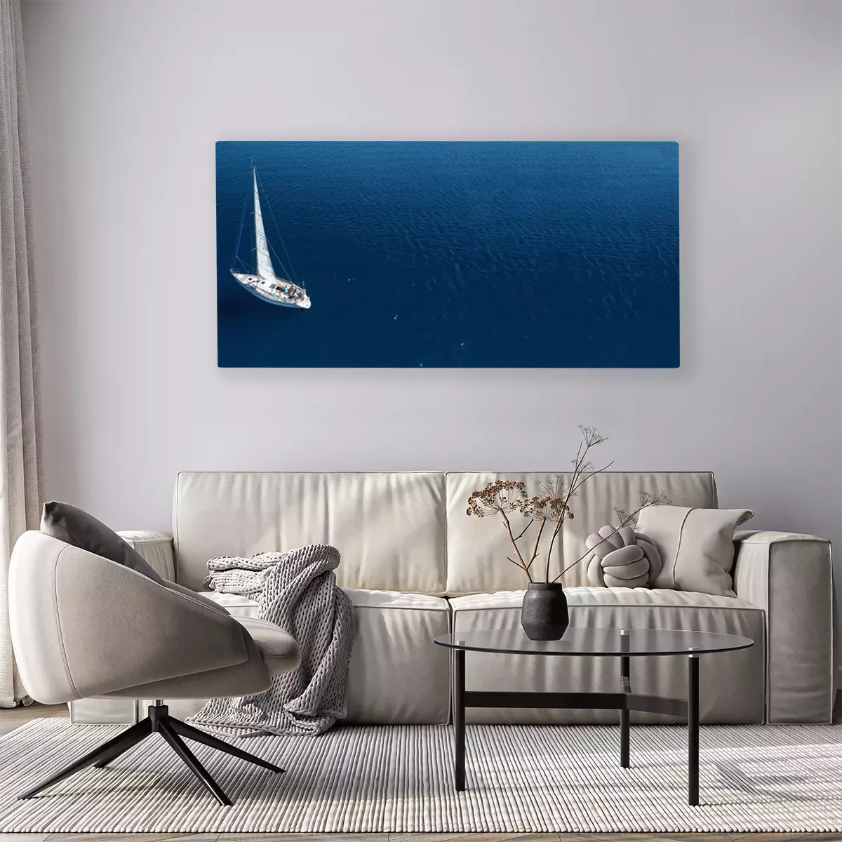 Tableau : Aerial drone ultra wide photo of beautiful sail boat cruising in Aegean deep blue sea