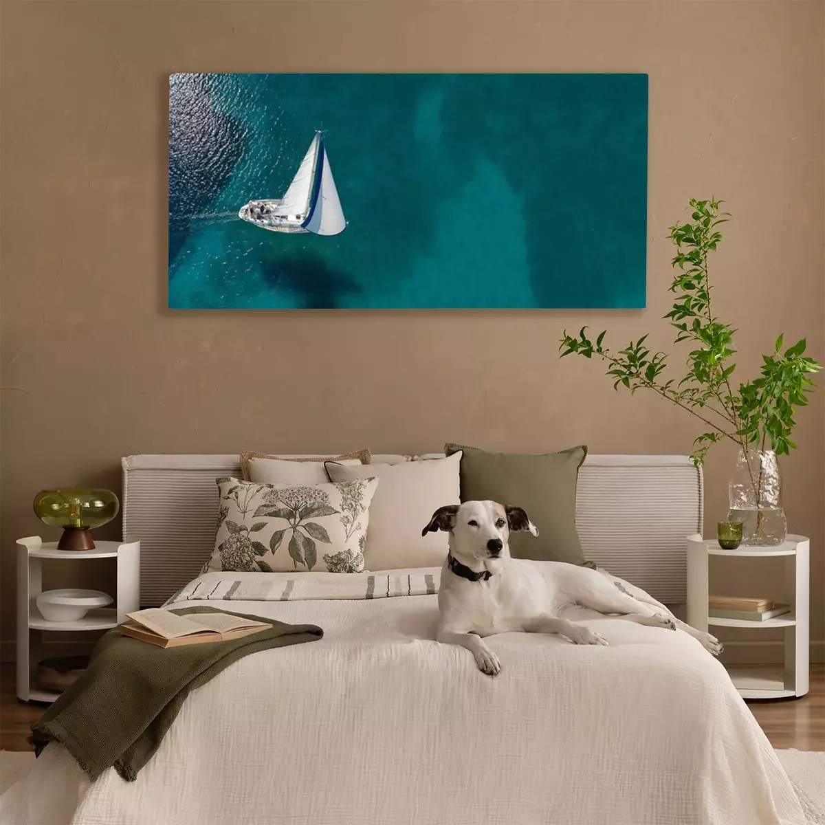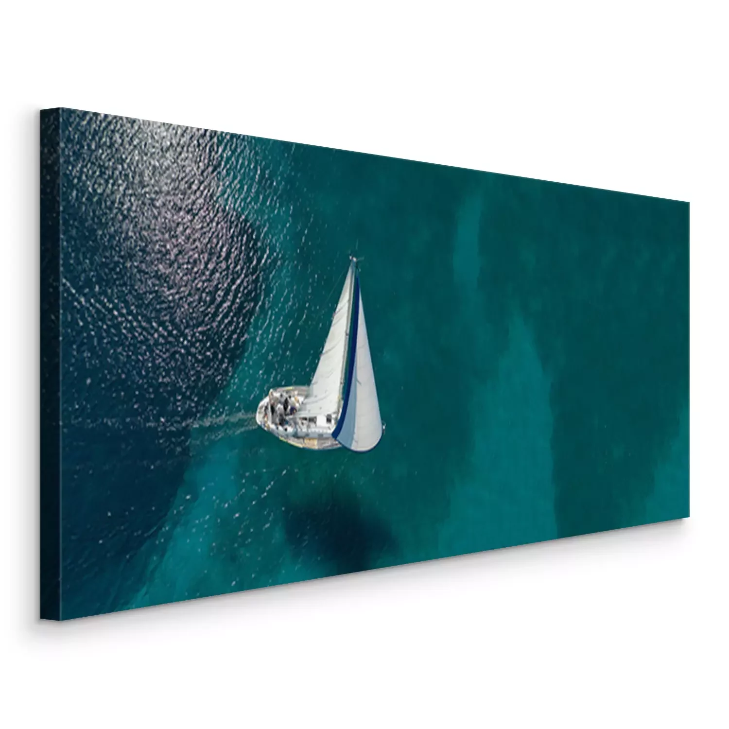 Tableau  Aerial drone ultra wide photo of beautiful sail boat sailing in tropical exotic bay with emerald clear sea