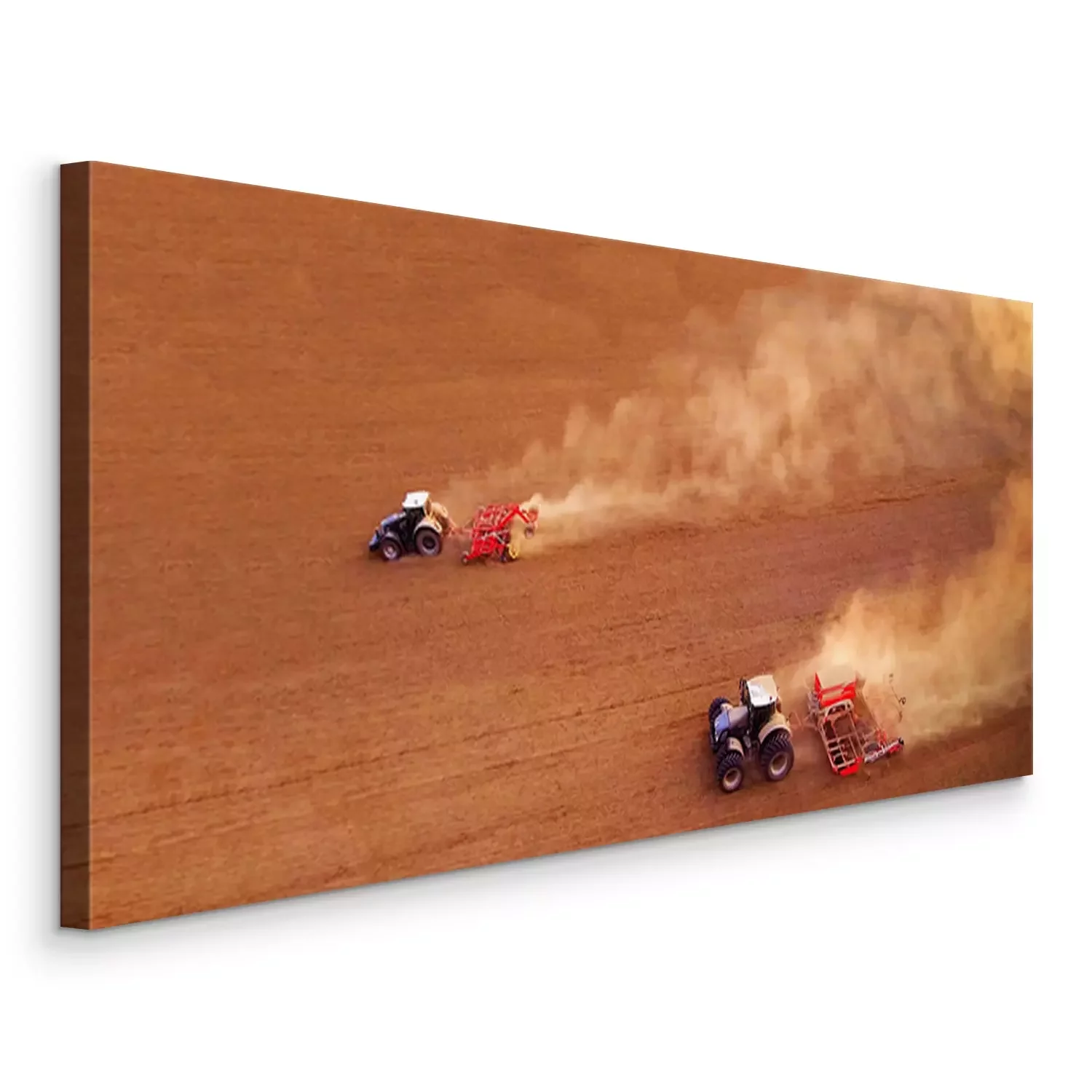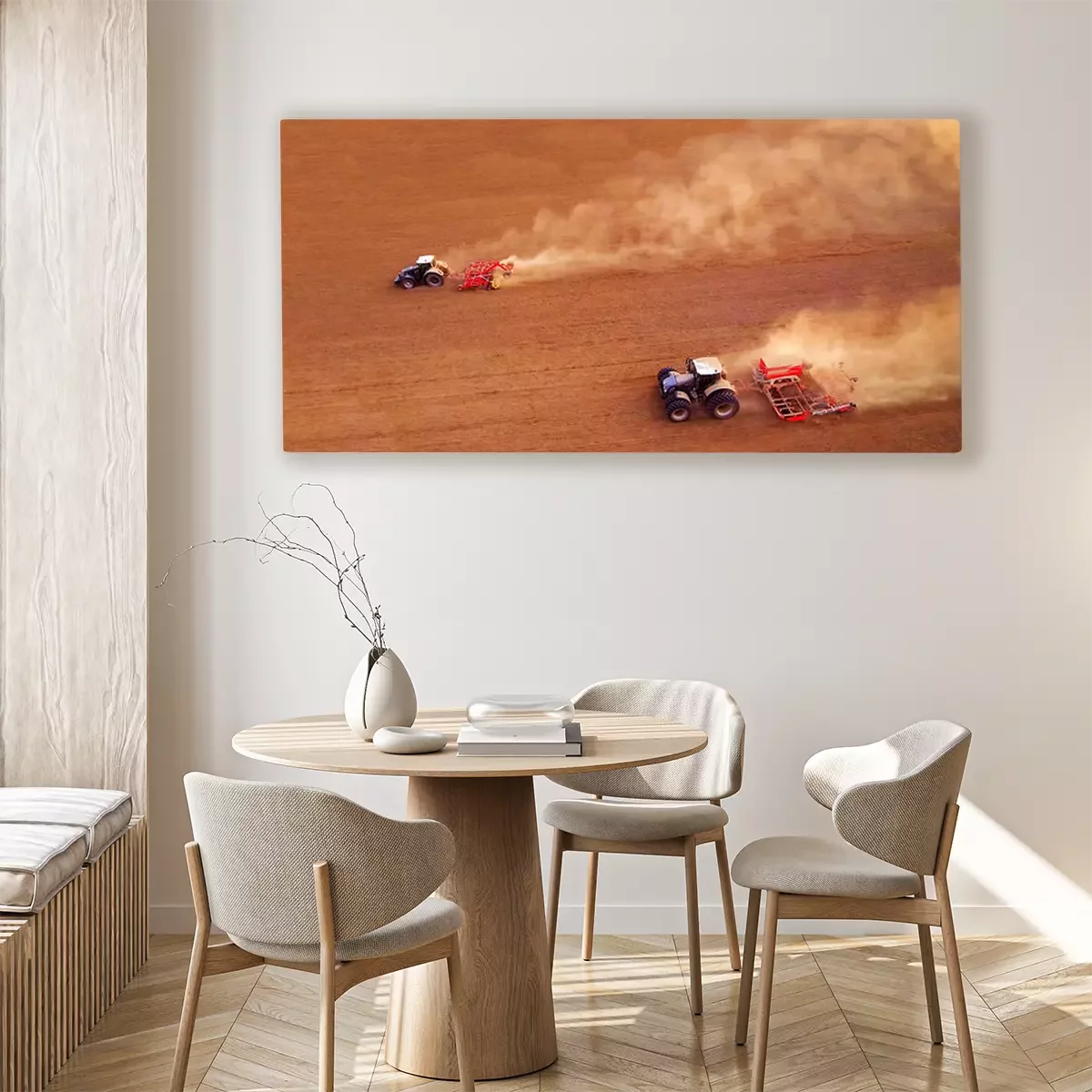 Tableau : aerial view of two agriculture tractors with plows. Plowing the field