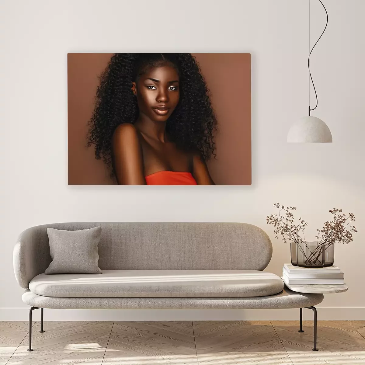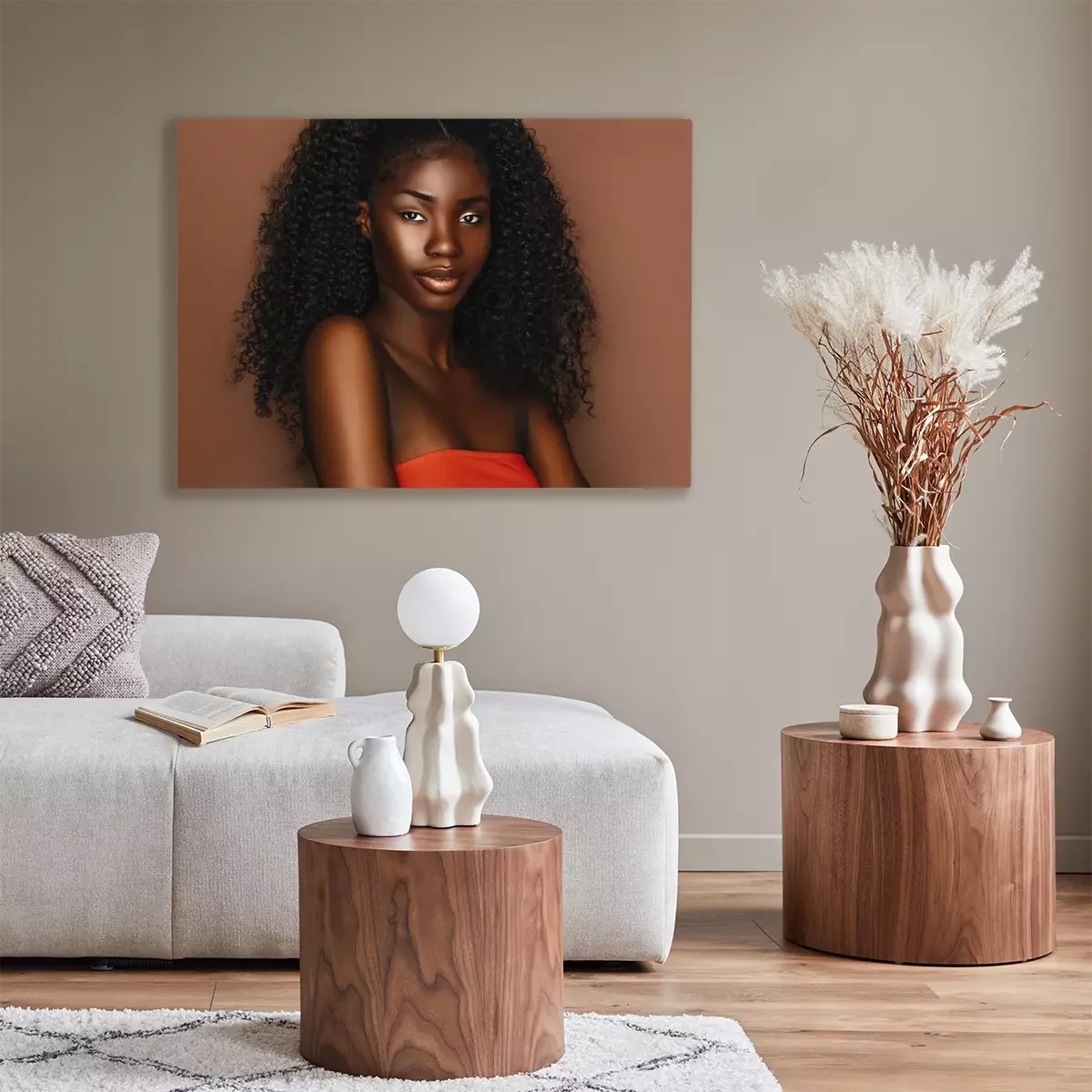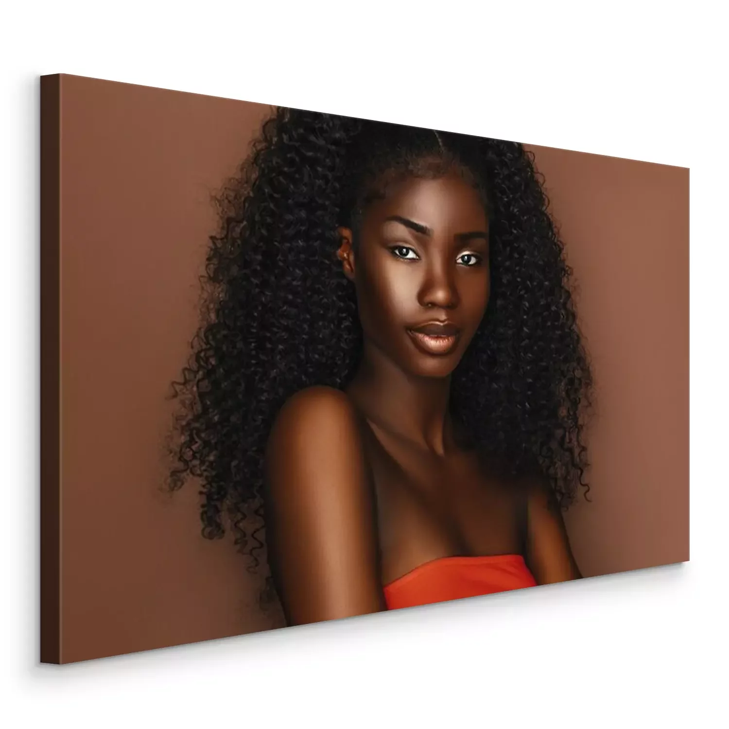 Tableau : African beautiful woman portrait. Brunette curly haired young model with dark skin and perfect smile
