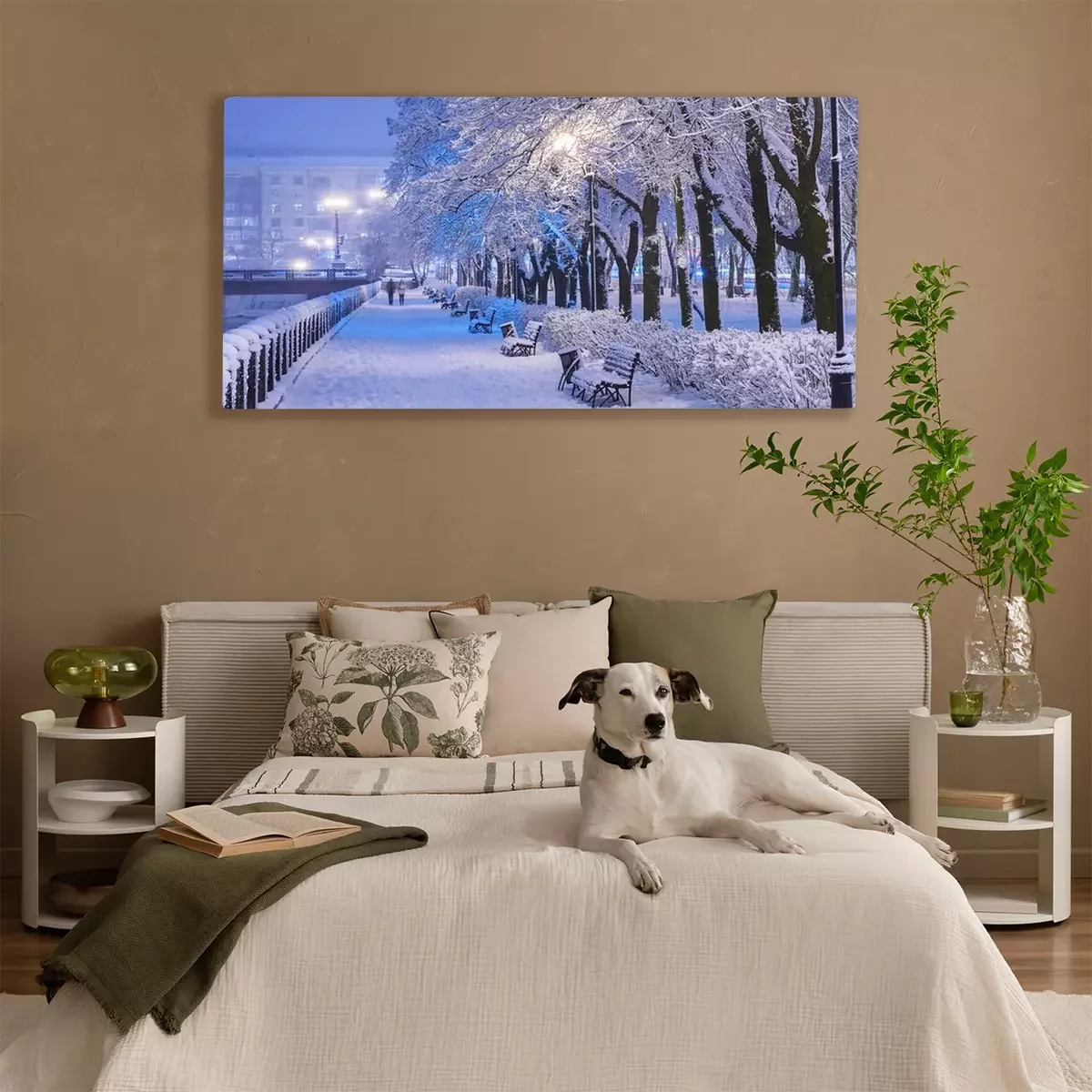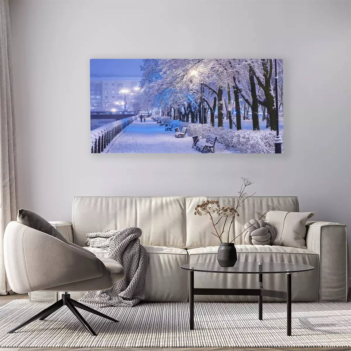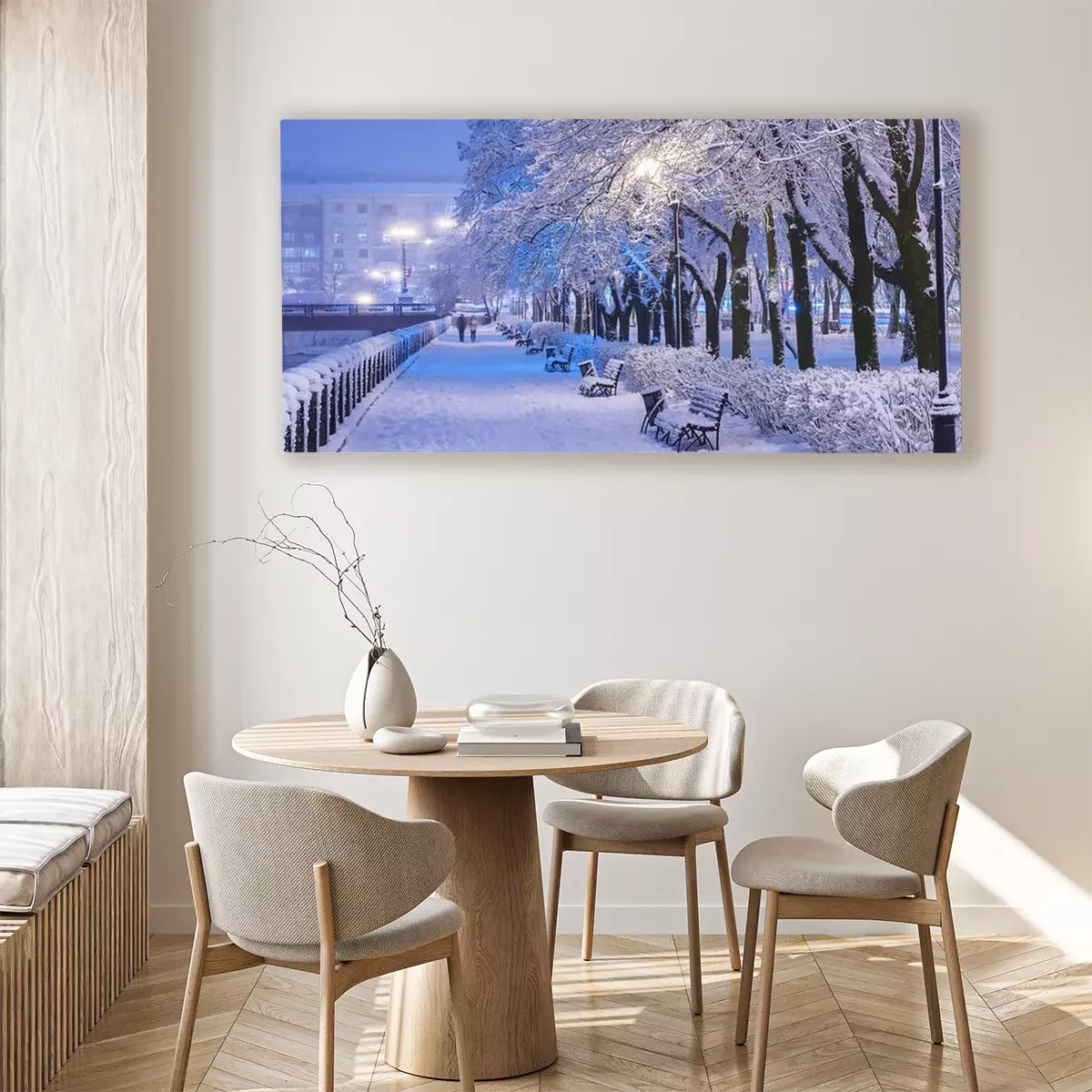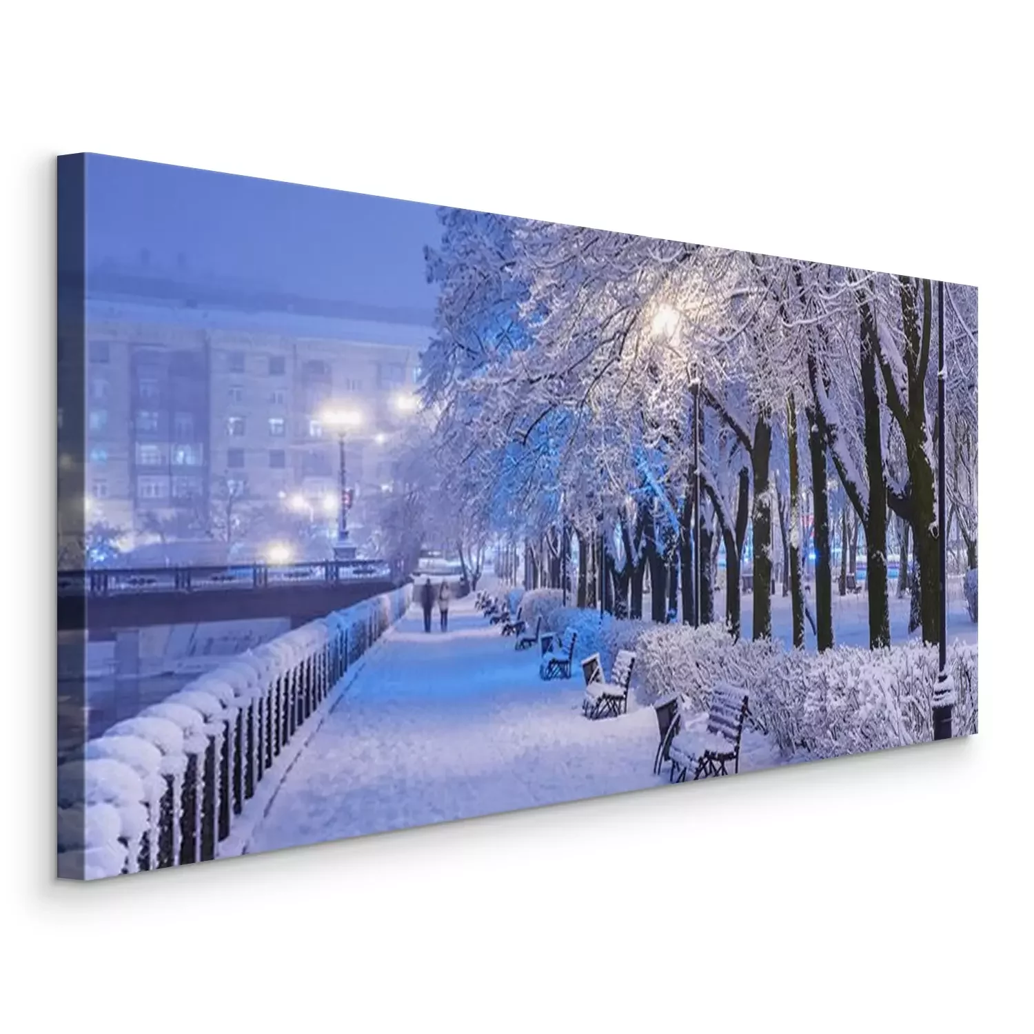 Tableau  Amazing winter night landscape of snow covered bench among snowy trees and shining lights during the snowfall. Artistic picture. Beauty world. Panorama