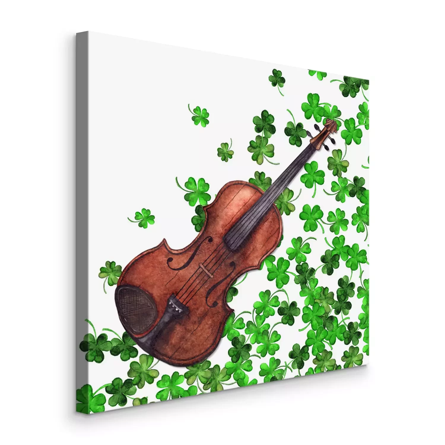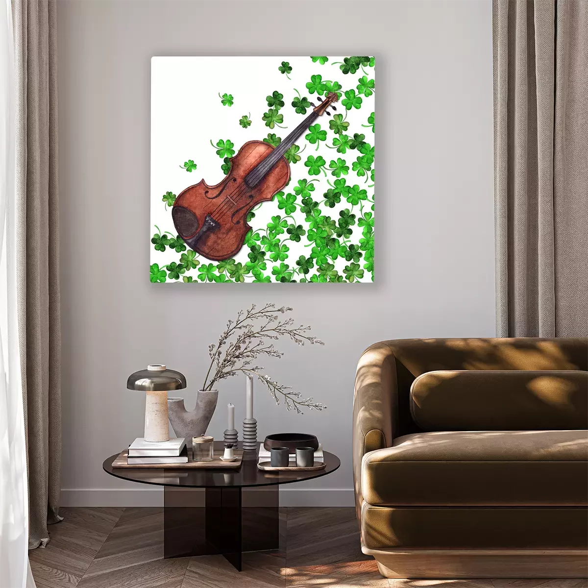 Tableau : Aquarelle en bois vintage violon fiddle instrument de musique trèfle shamrock feuille plante de fond