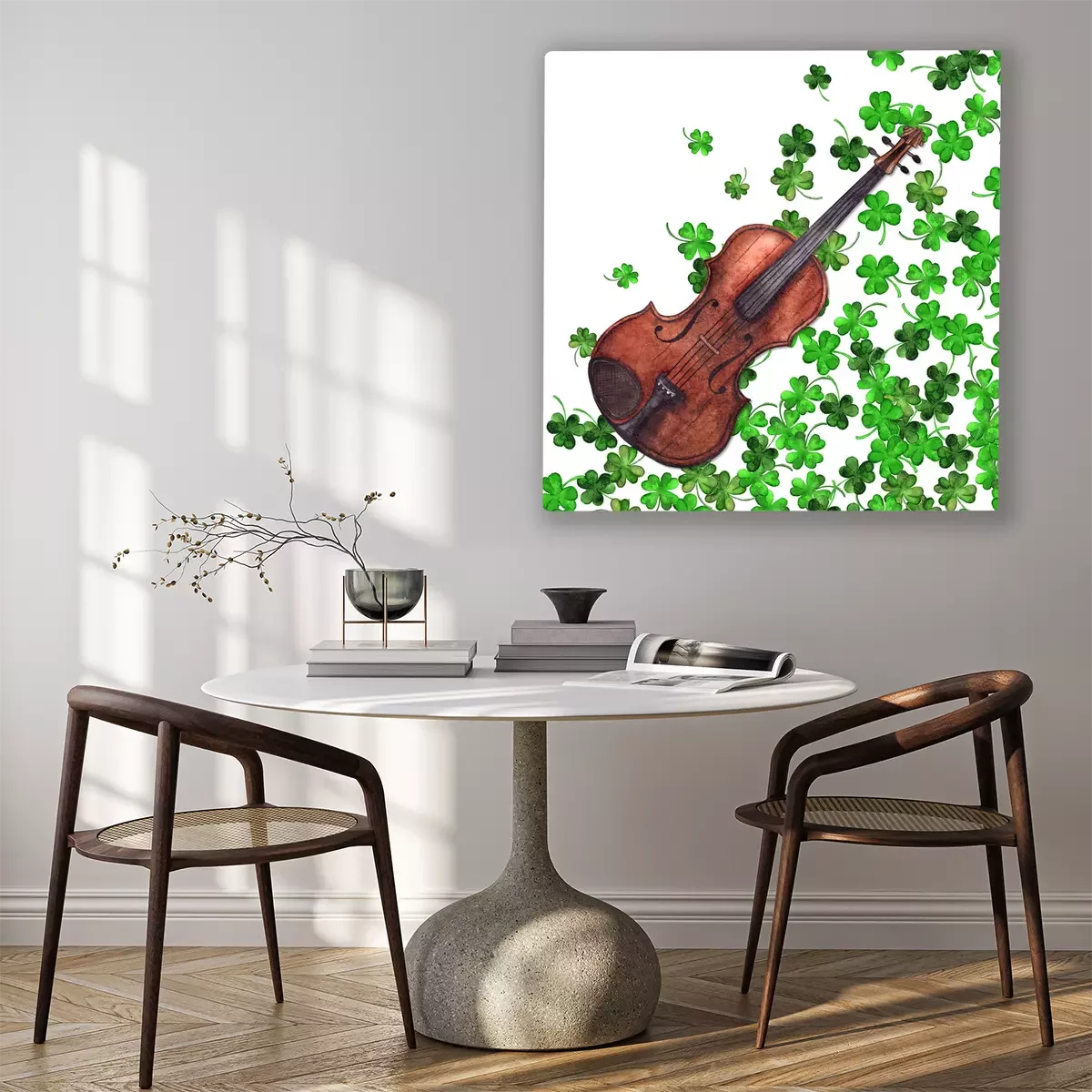 Tableau  Aquarelle en bois vintage violon fiddle instrument de musique trèfle shamrock feuille plante de fond