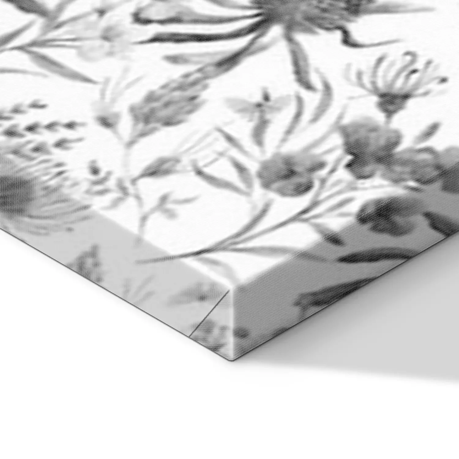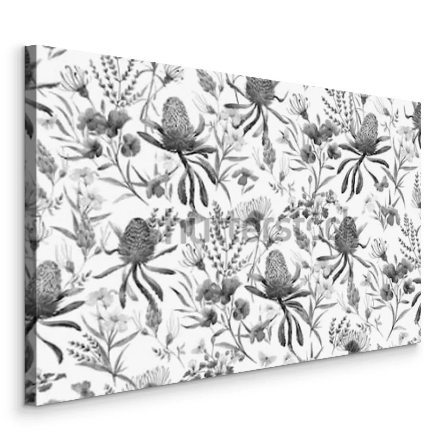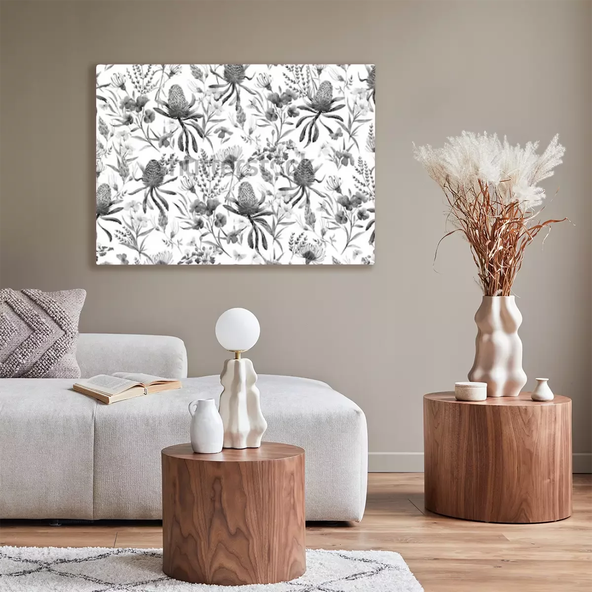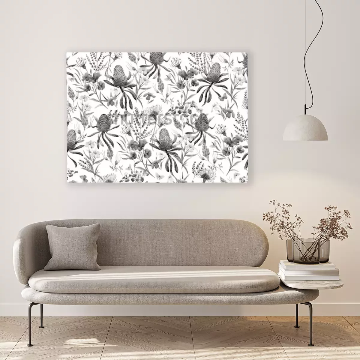 Tableau : Aquarelle motif tropical, fleurs, orange banksias, rose laurier, fleurs exotiques australiennes, fleurs rouges Eremophila dichroantha. motif noir et blanc monochrome