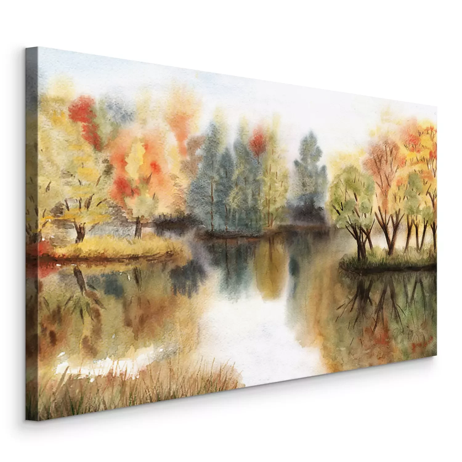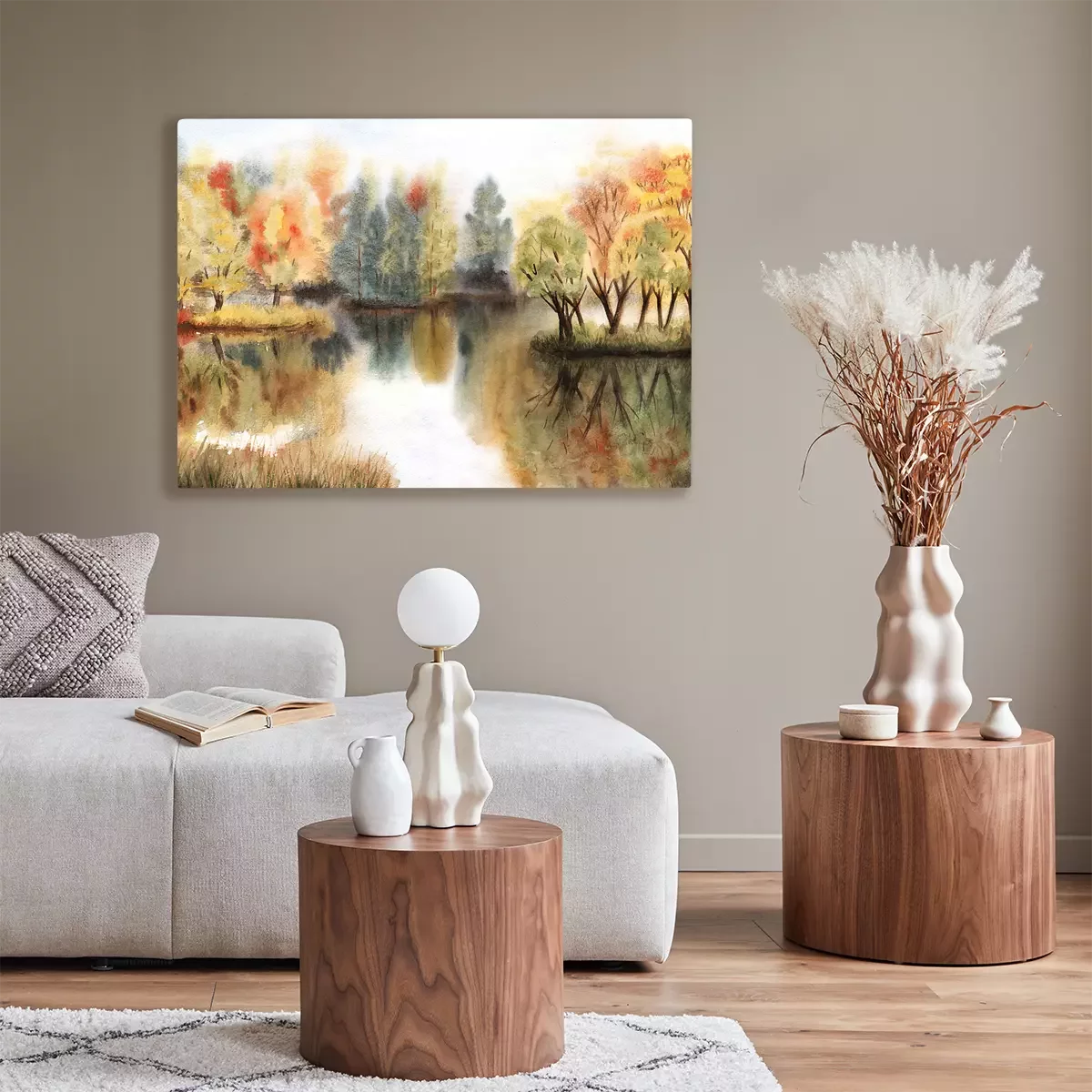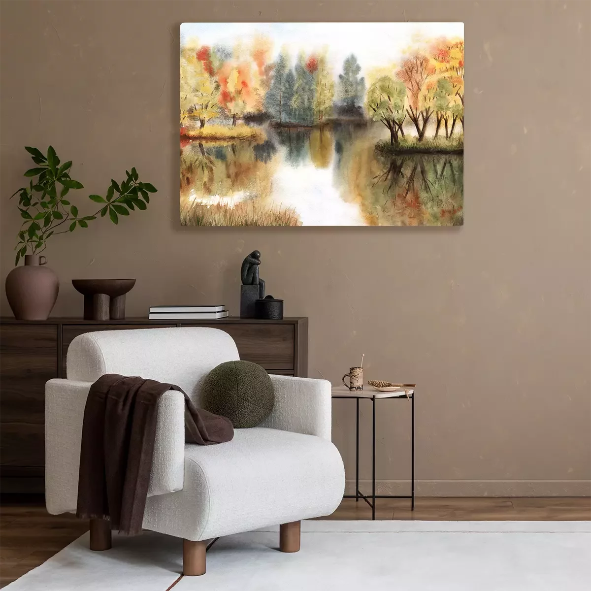 Tableau  Aquarelle paysage d'automne avec des arbres sur les îles et leurs reflets dans un lac