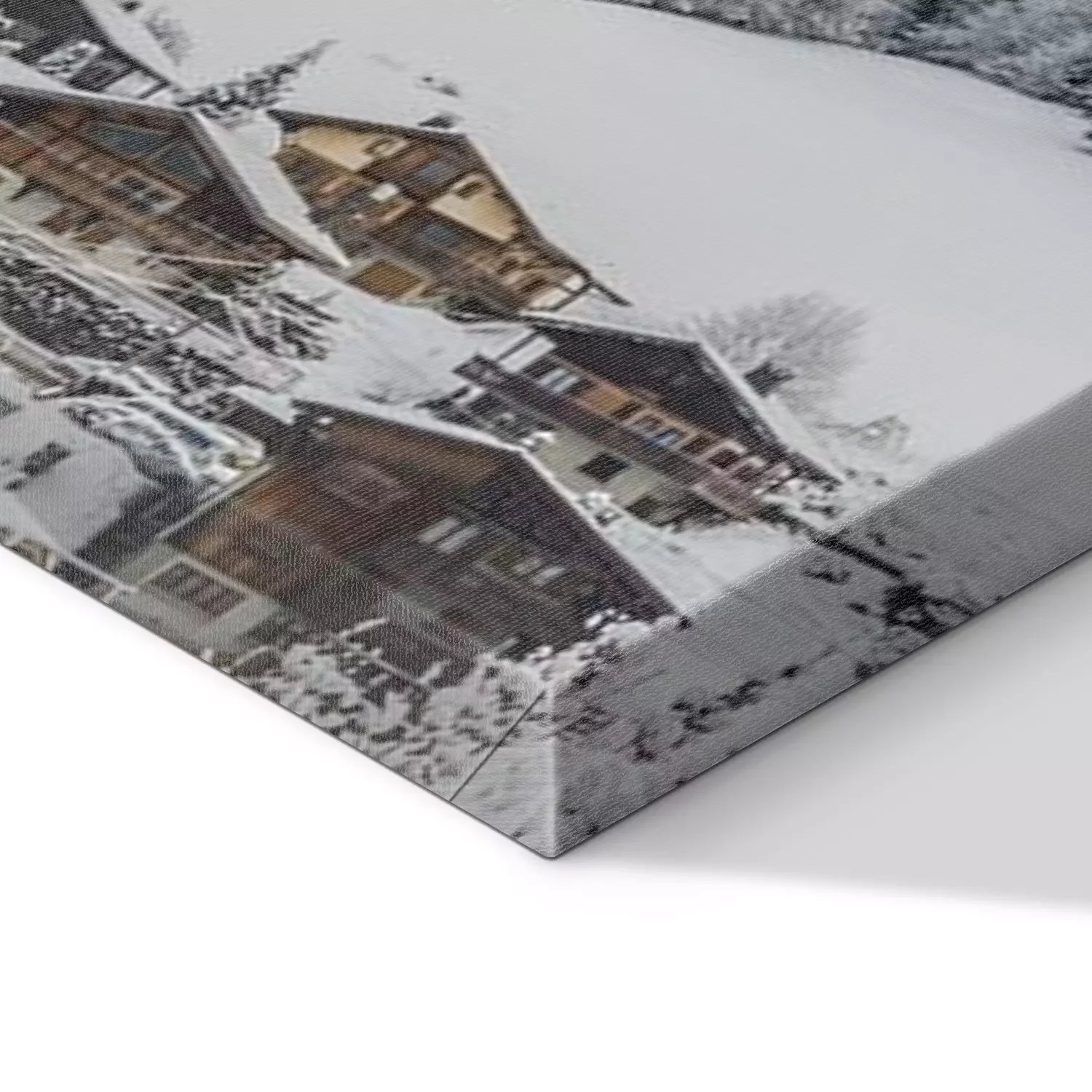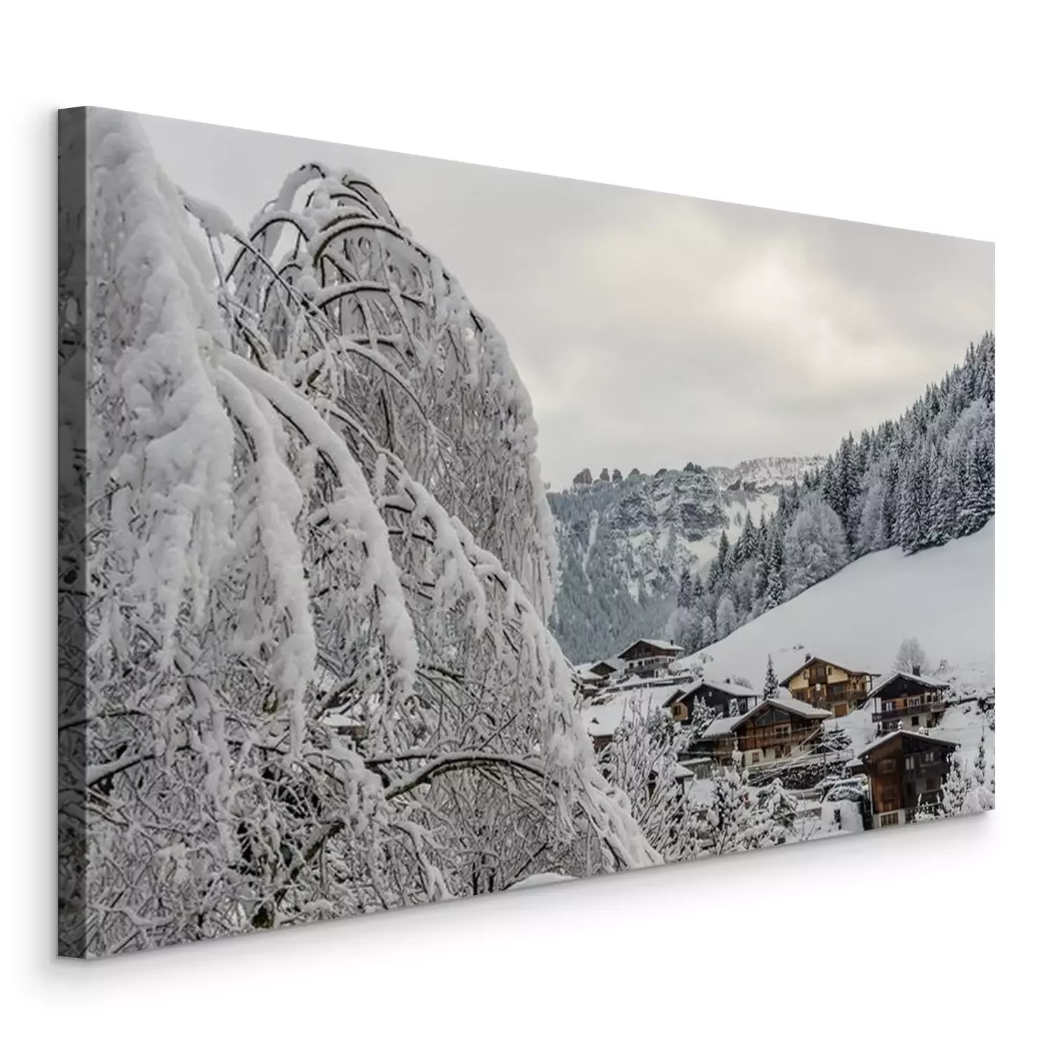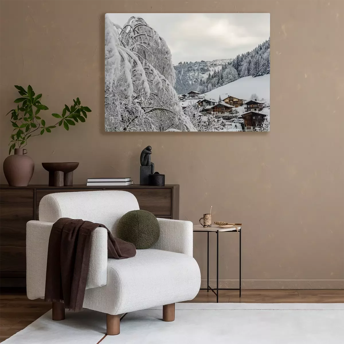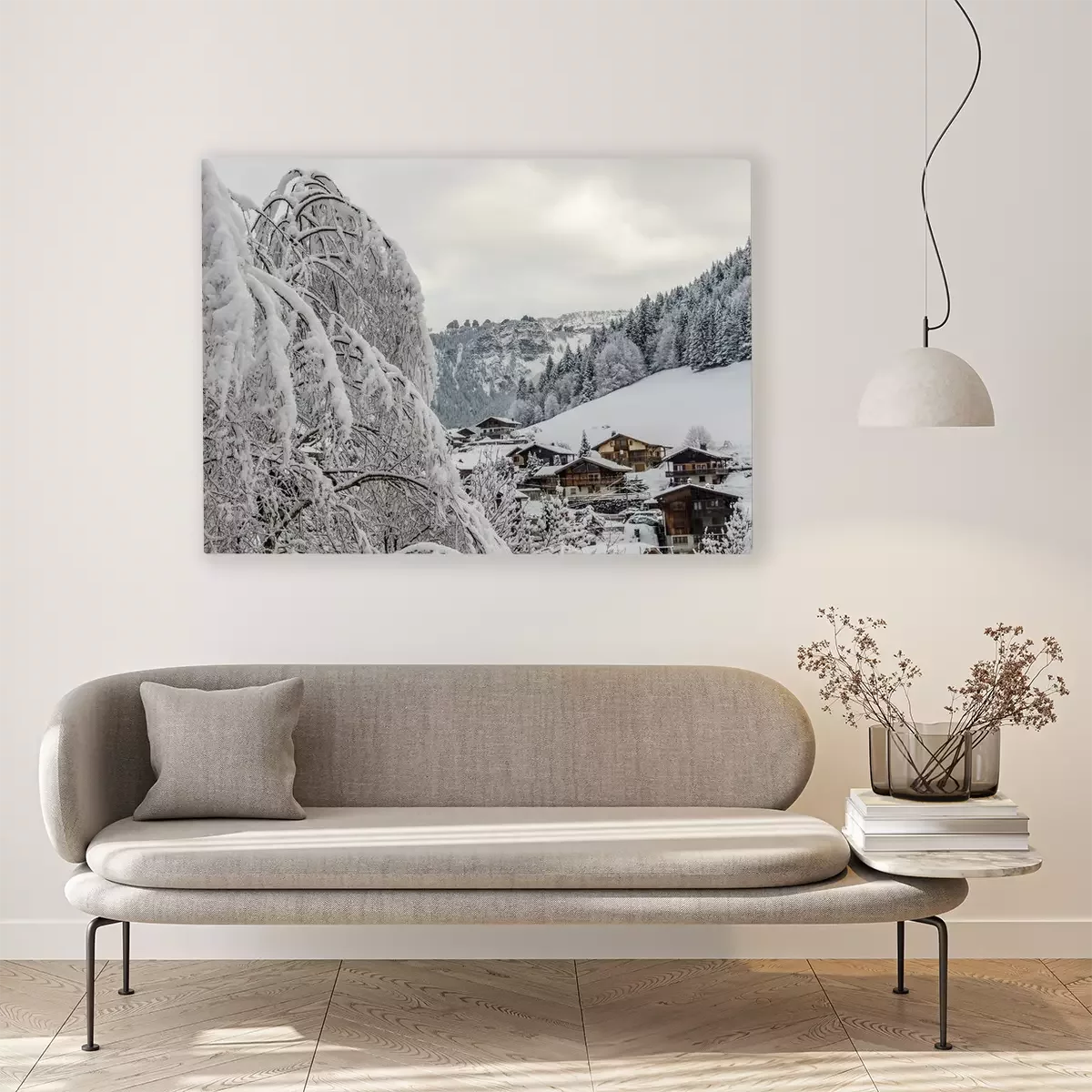 Tableau  Arbre enneigé et Morzine vilage chalets