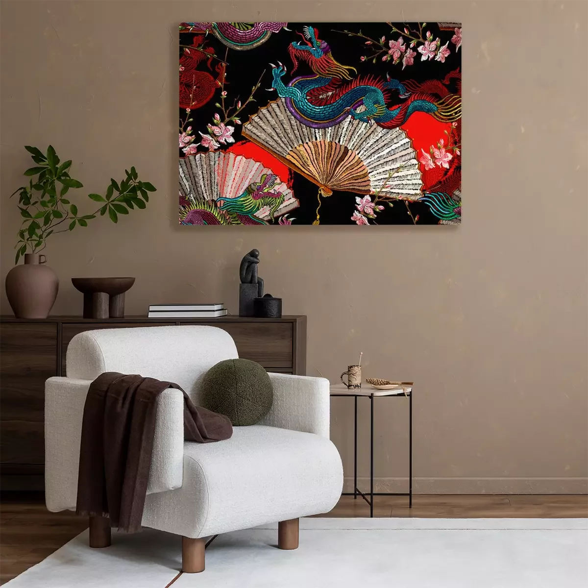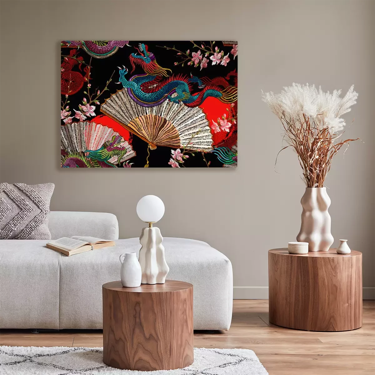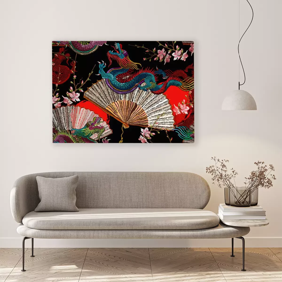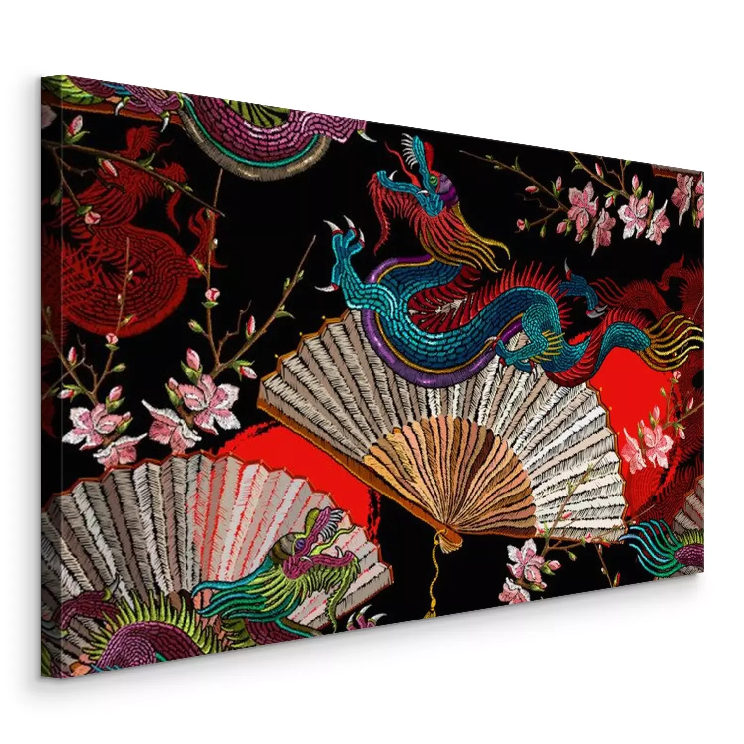 Tableau  Asian dragons, rising sun, japan fan and sakura flowers. Fashion japanese and chinese style. Template for clothes. Ethnic horizontal seamless pattern. Oriental art