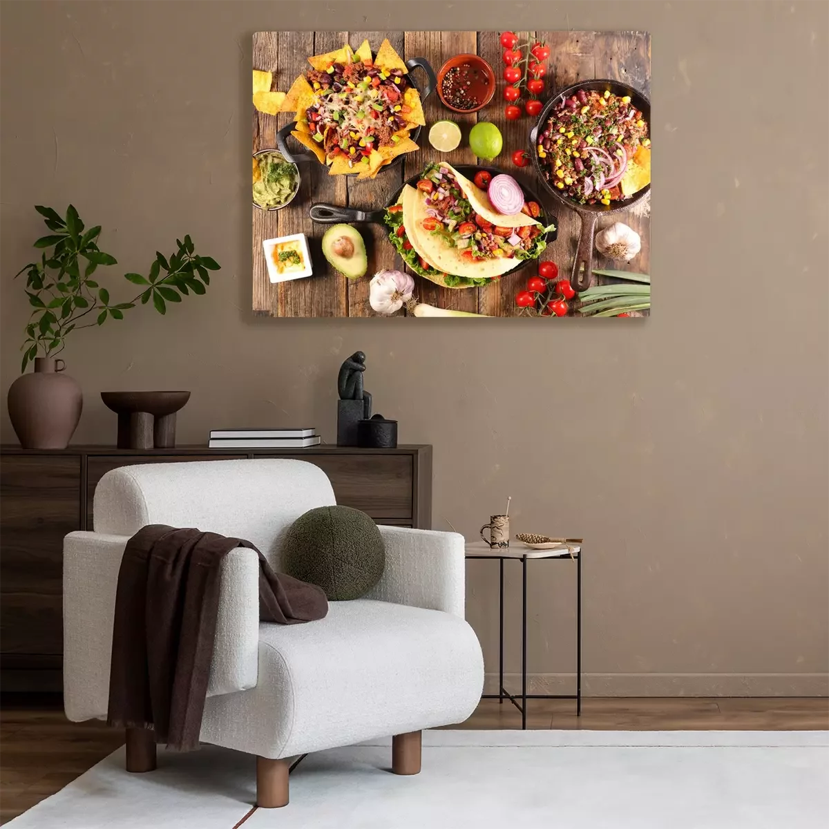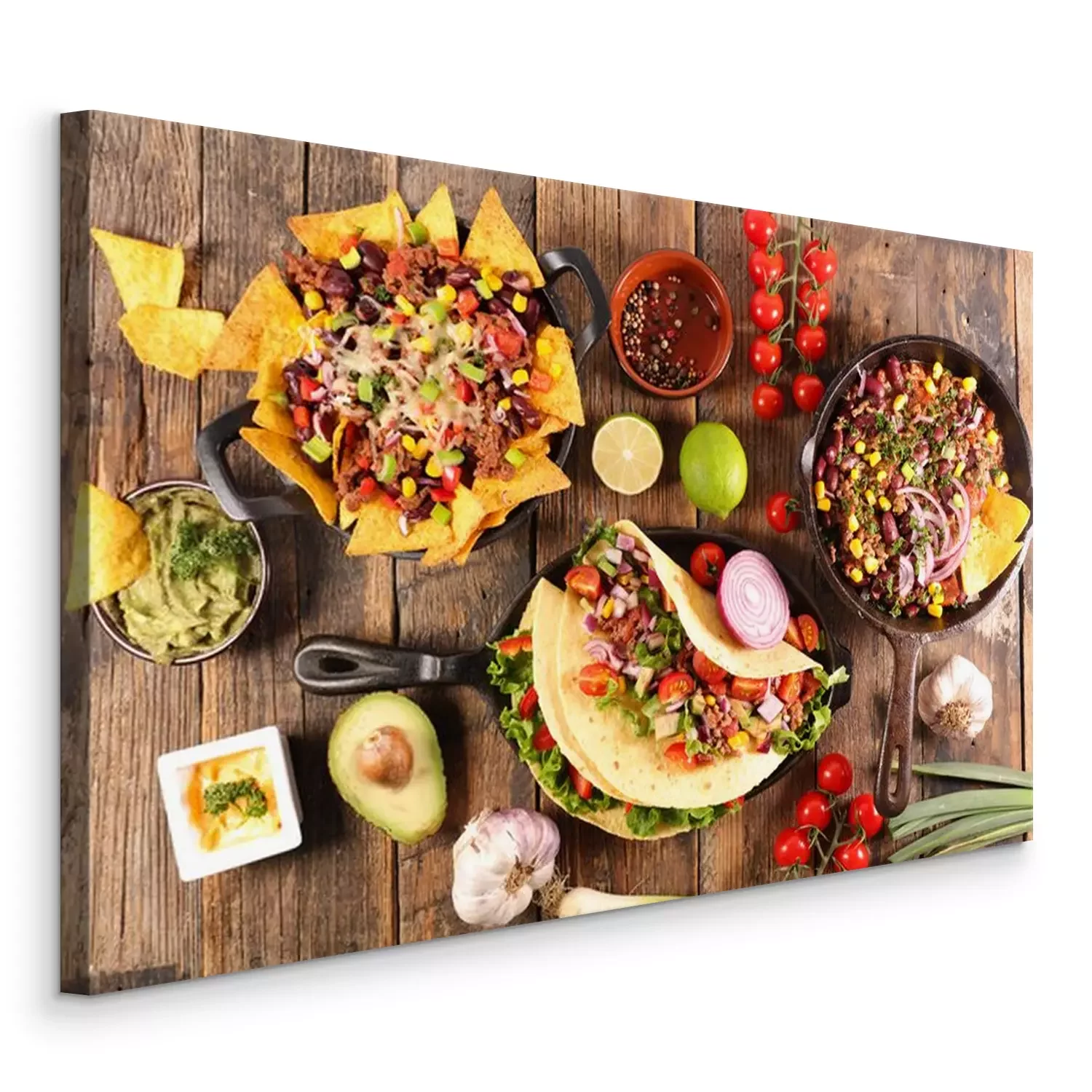 Tableau : assorted of mexican food with fajitas, chili con carne and nachos with avocado, beef and cheese