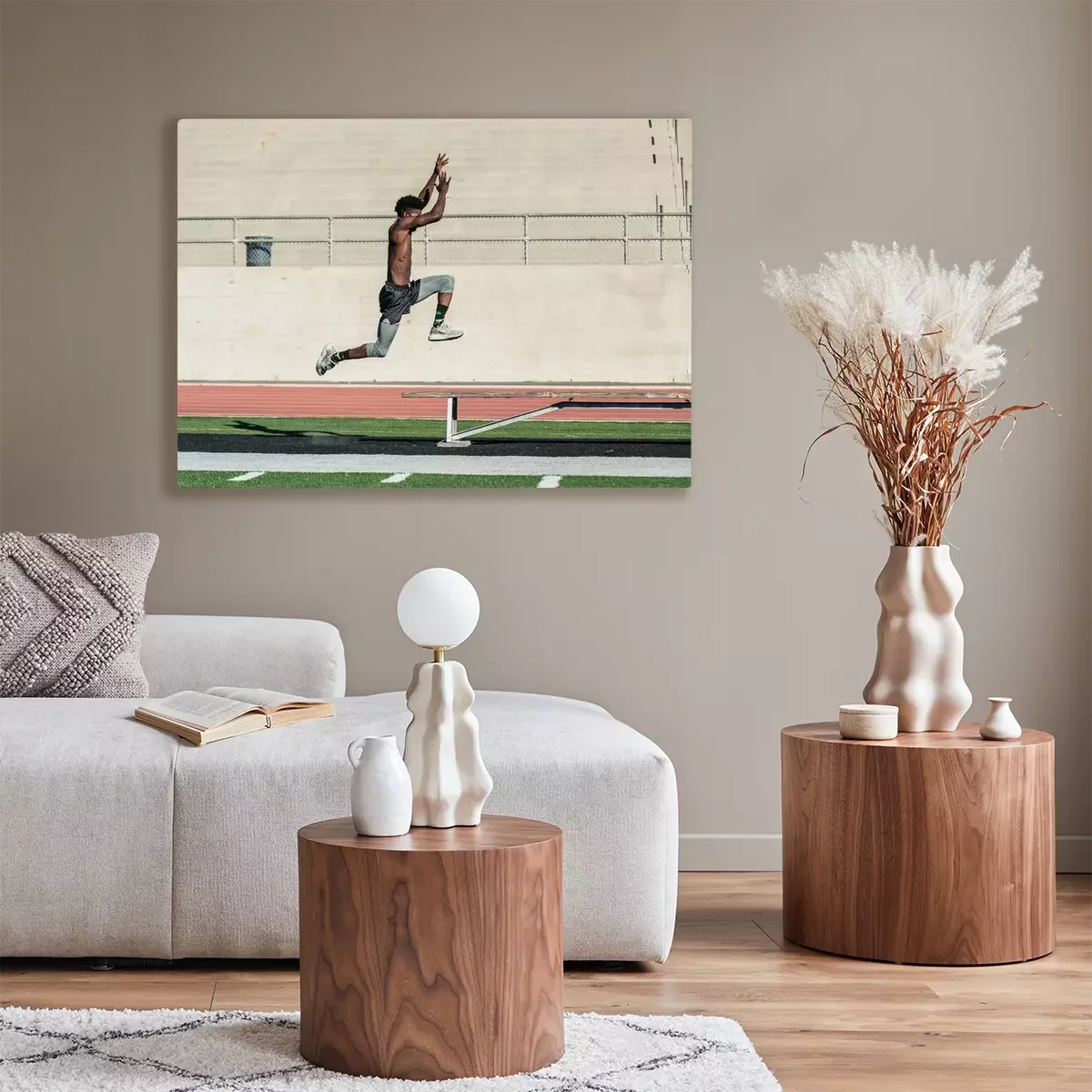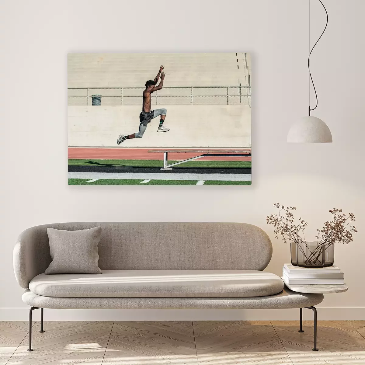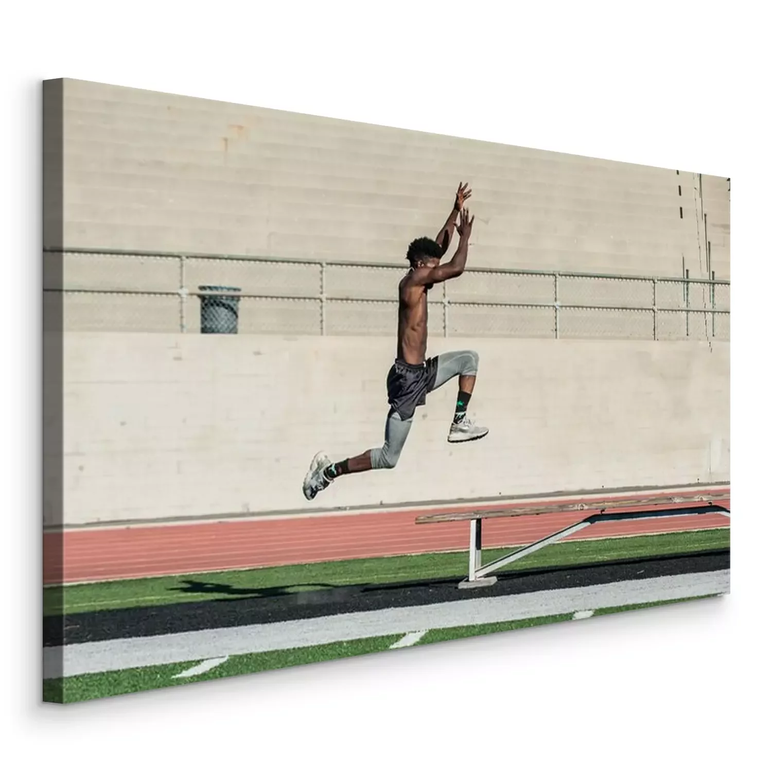 Tableau : Athlète de piste jamaïcain effectuant saut en longueur explosif sur banc au stade.