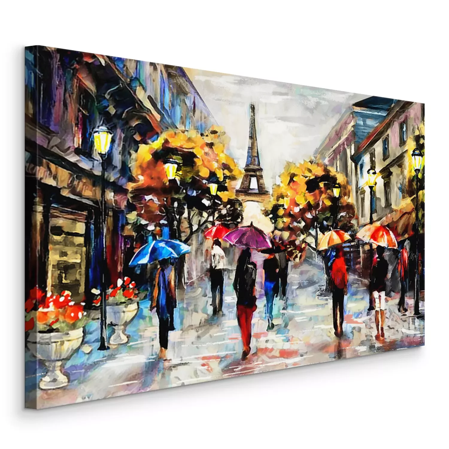 Peinture à l'huile sur toile, vue sur la rue de Paris. Ouvrages d'art. tour Eiffel . Personnes sous un parapluie rouge. Arbre. France