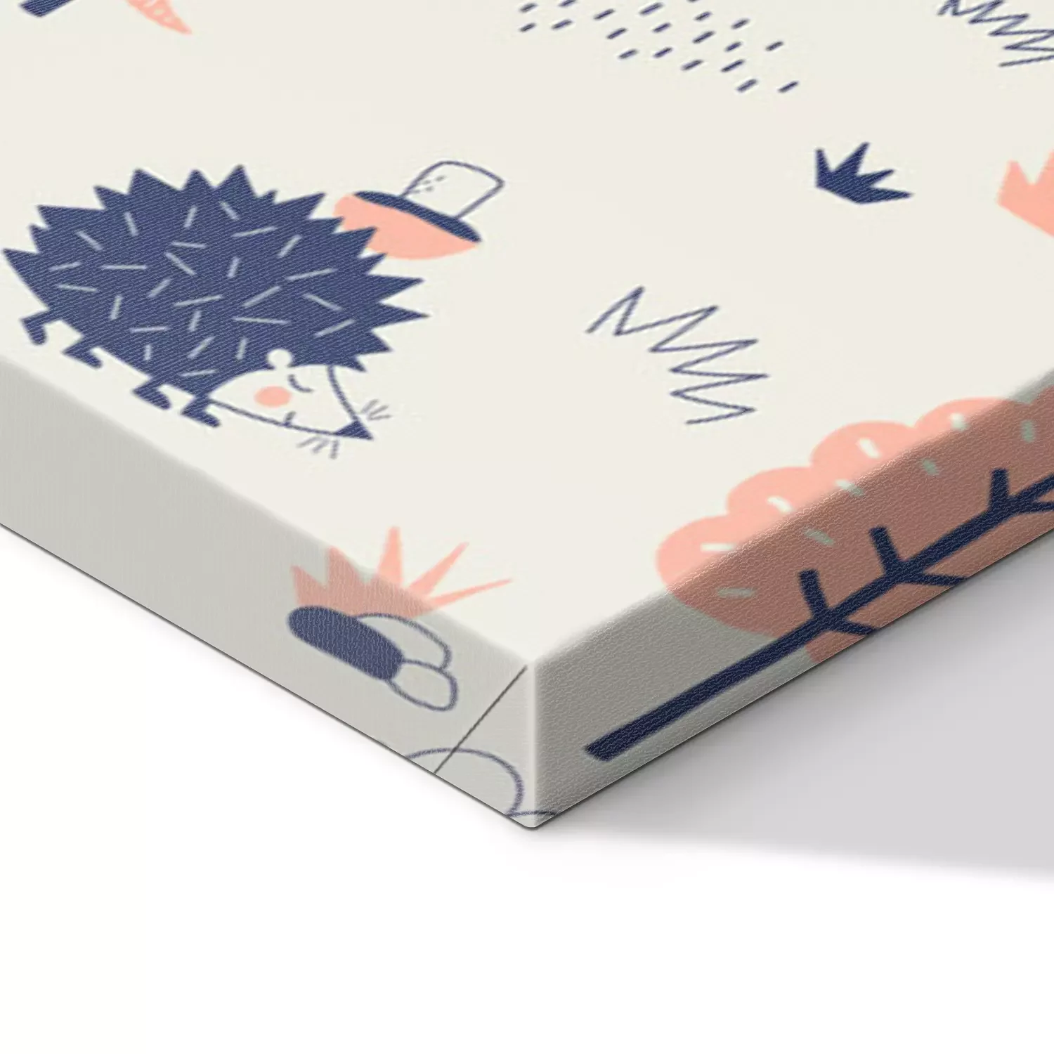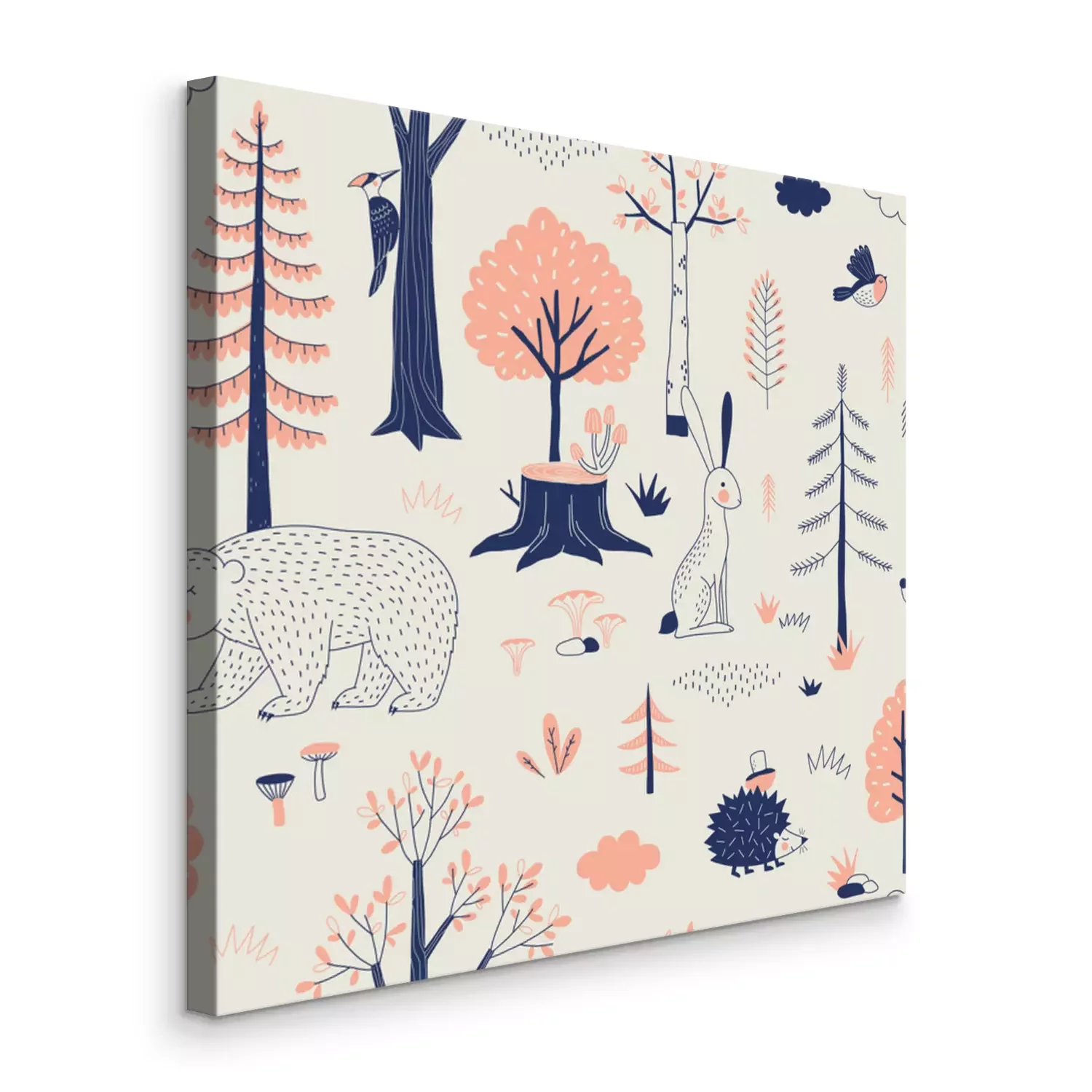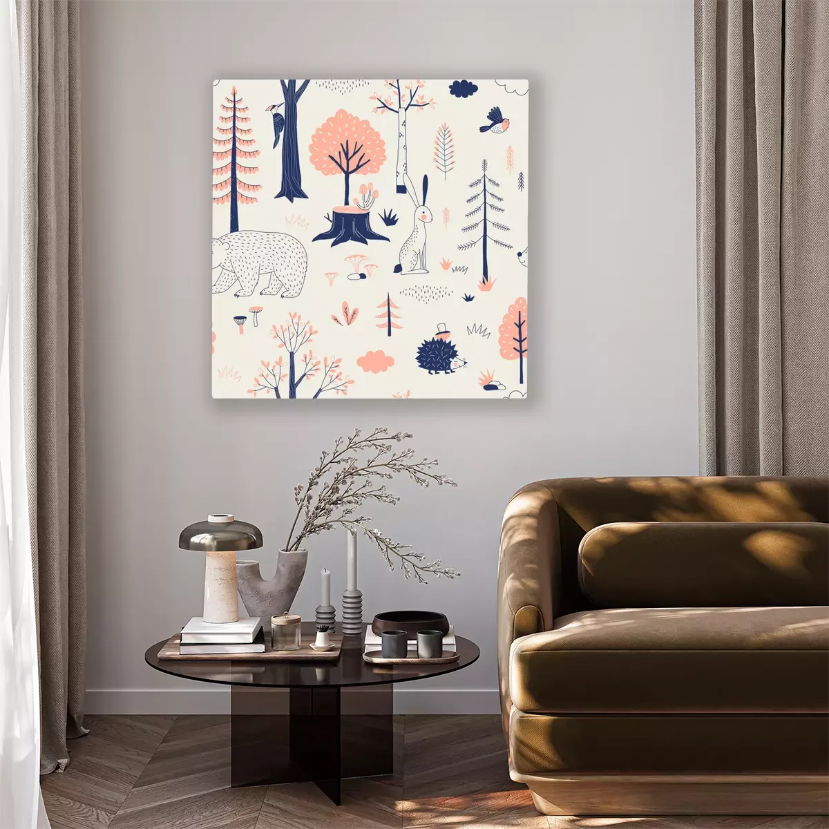 Tableau  Autumn Forest seamless vector pattern. Woody landscape with Hedgehog Bear Hare creatures repeatable background. Woodland childish print in Scandinavian decorative style. Cute forest animal backdrop.