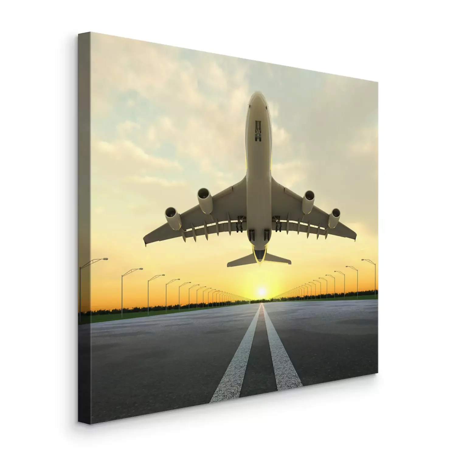 Tableau  avion au décollage à l'aéroport au coucher du soleil