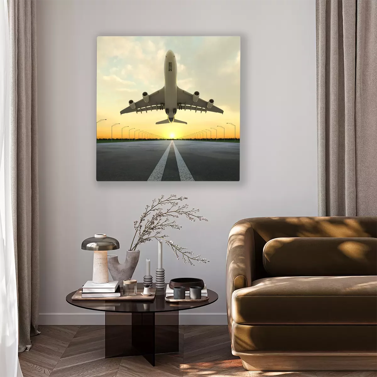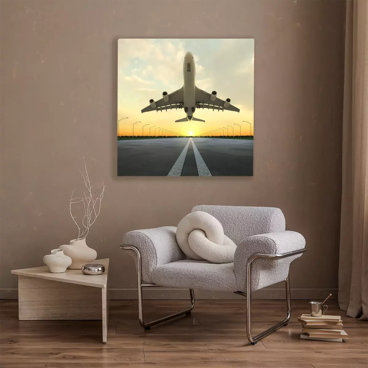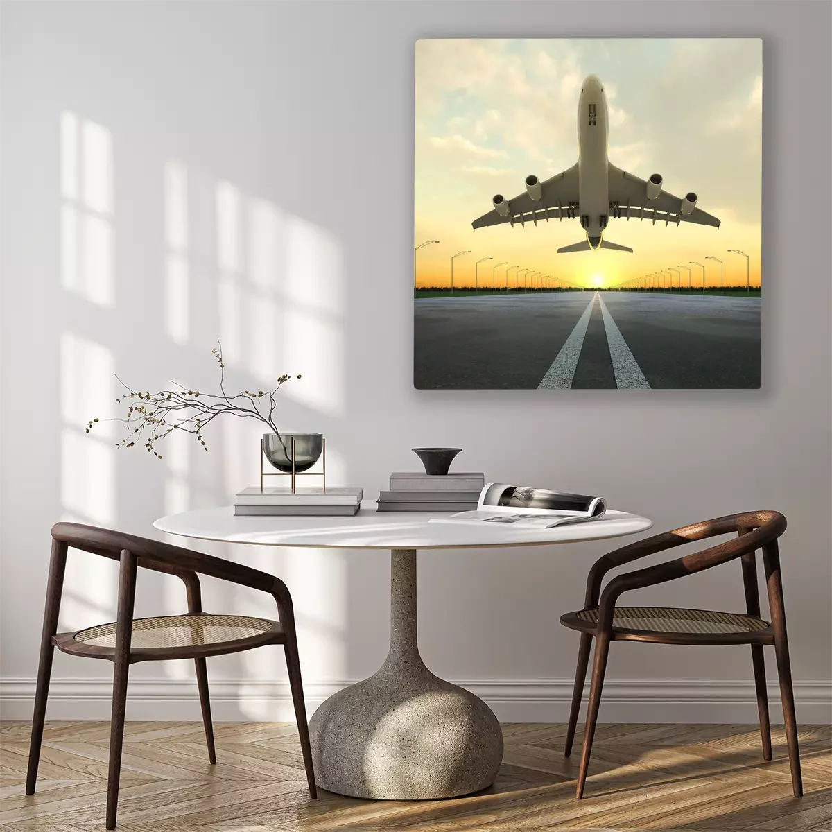 Tableau : avion au décollage à l'aéroport au coucher du soleil