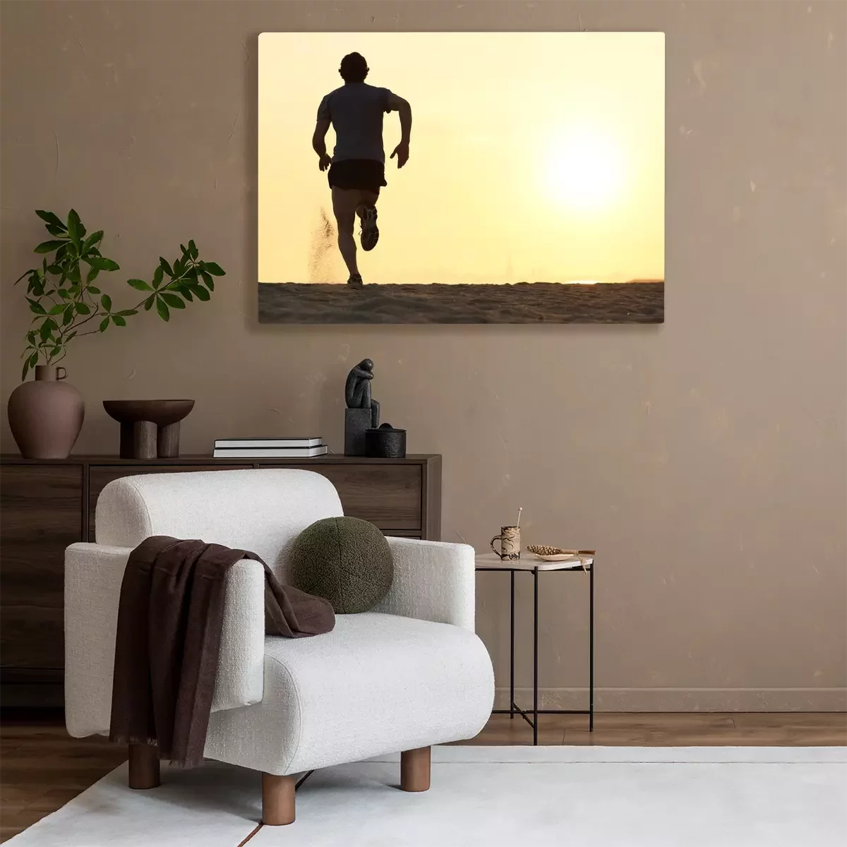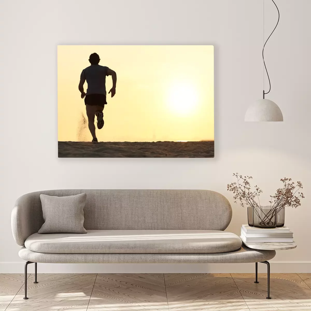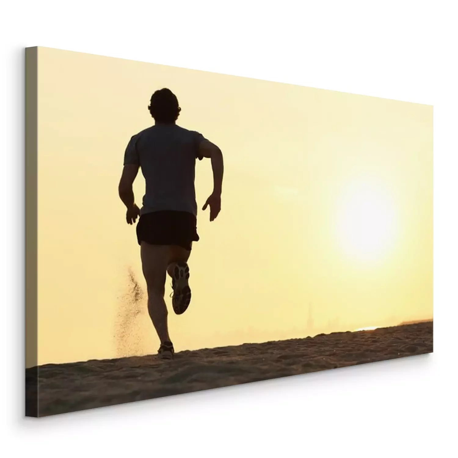 Tableau  Back view silhouette of a runner man running on the beach