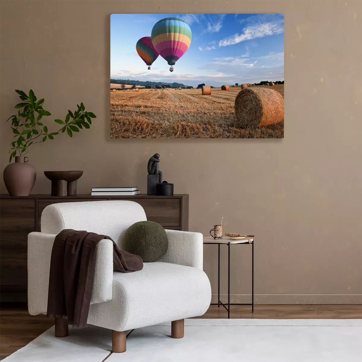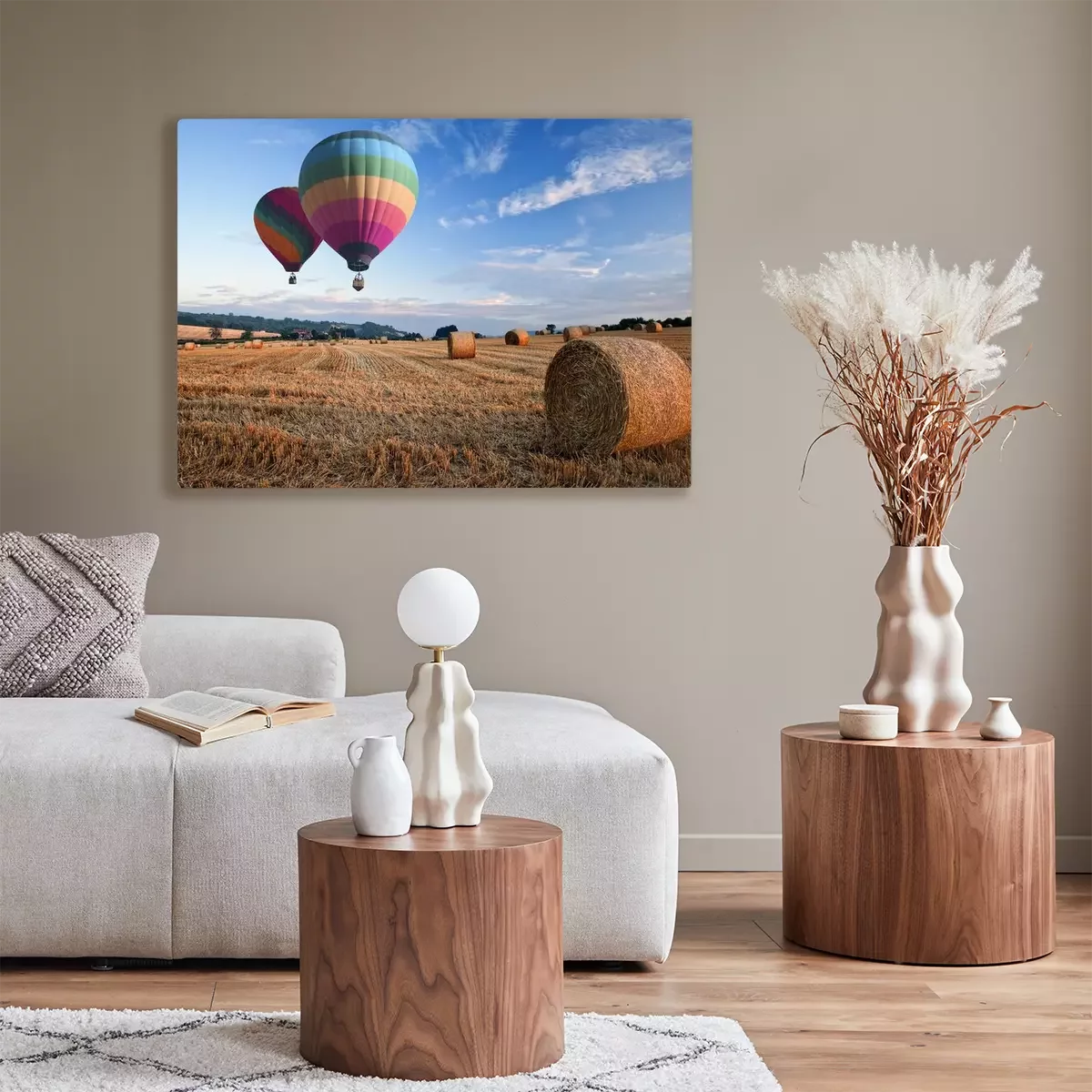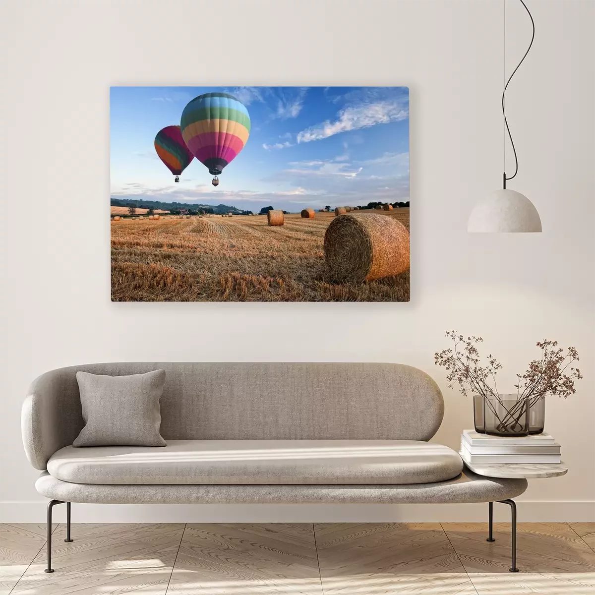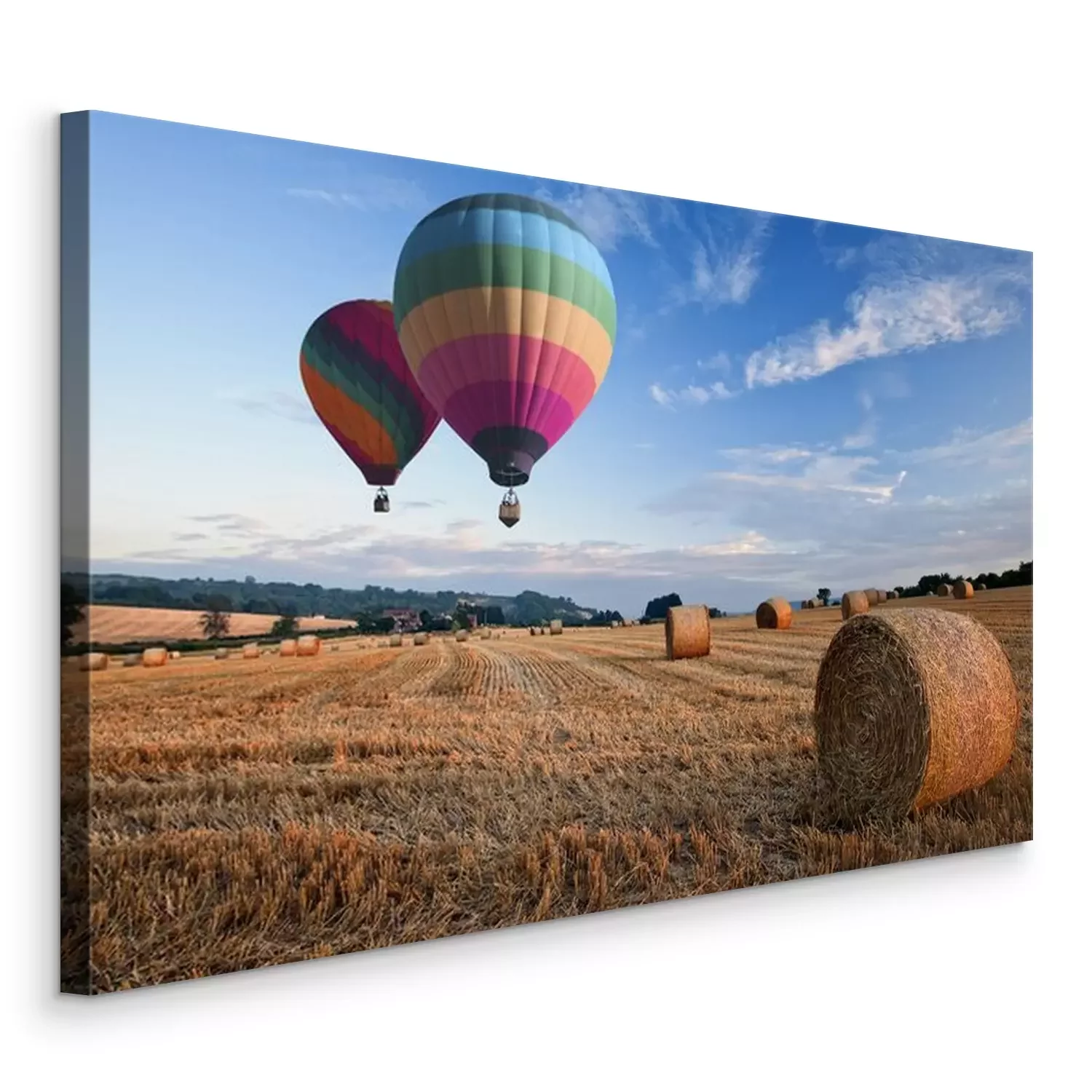 Tableau : Ballons à air chaud plus de foin balles coucher du soleil paysage