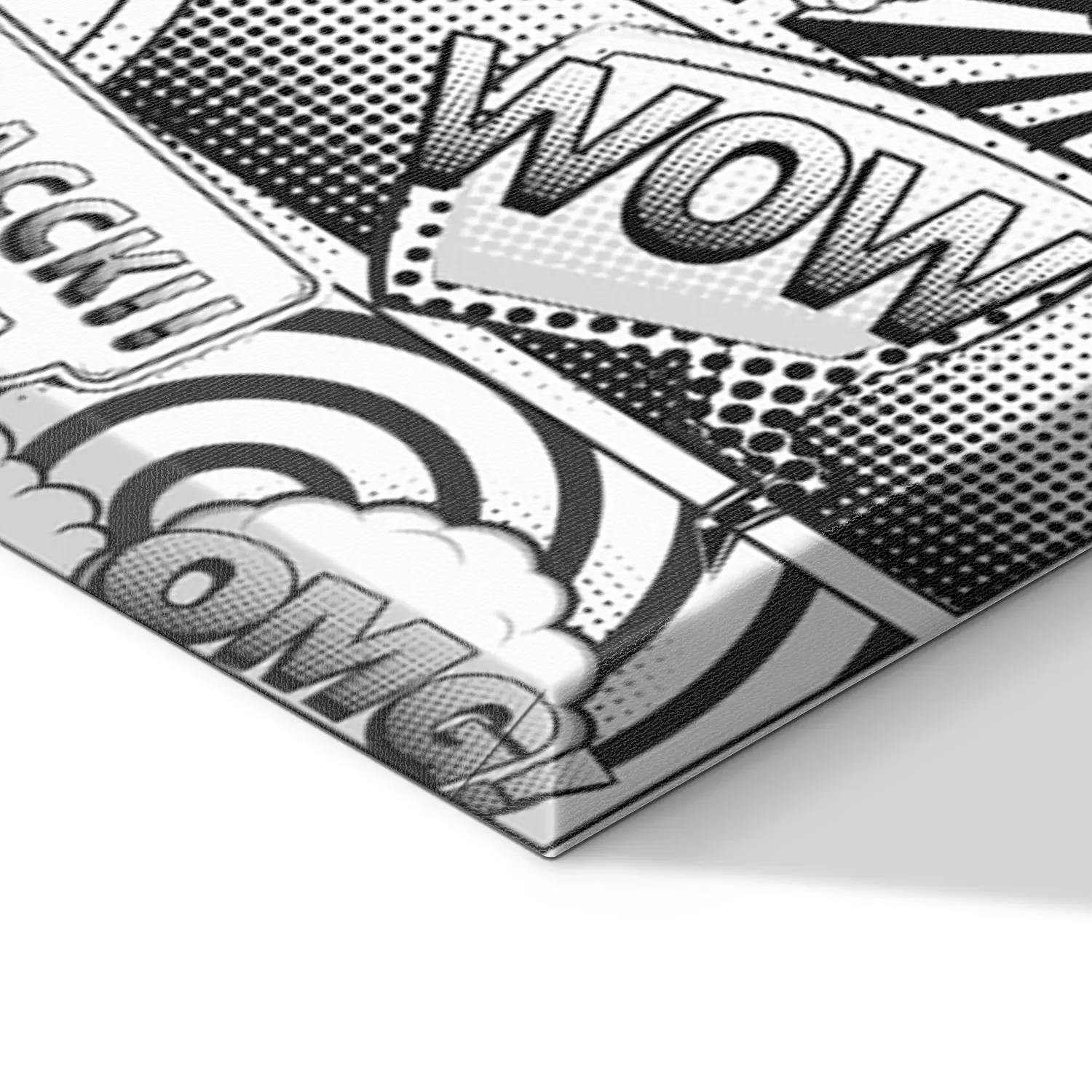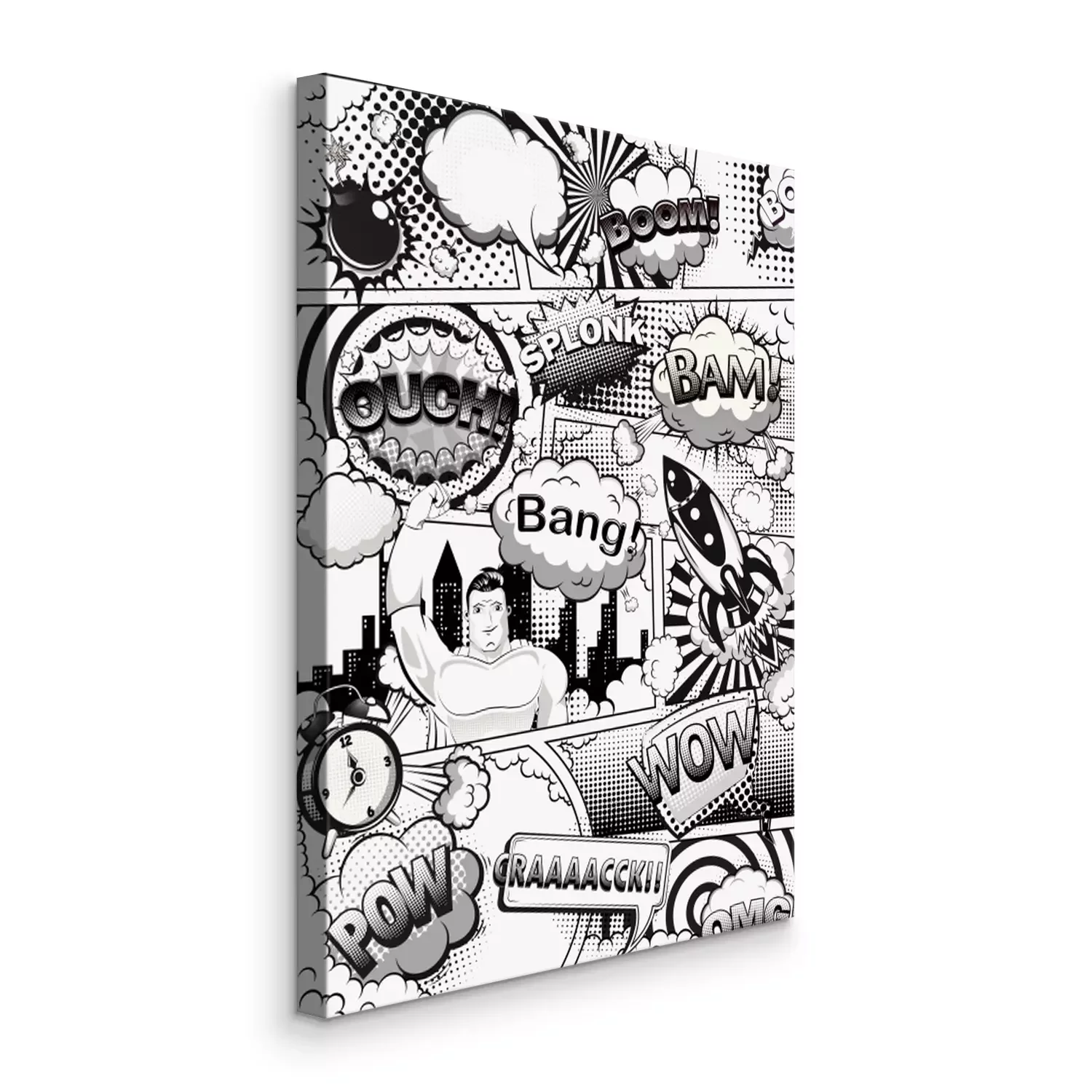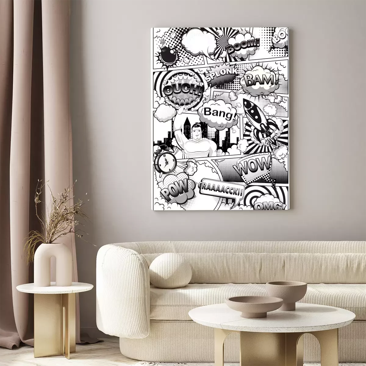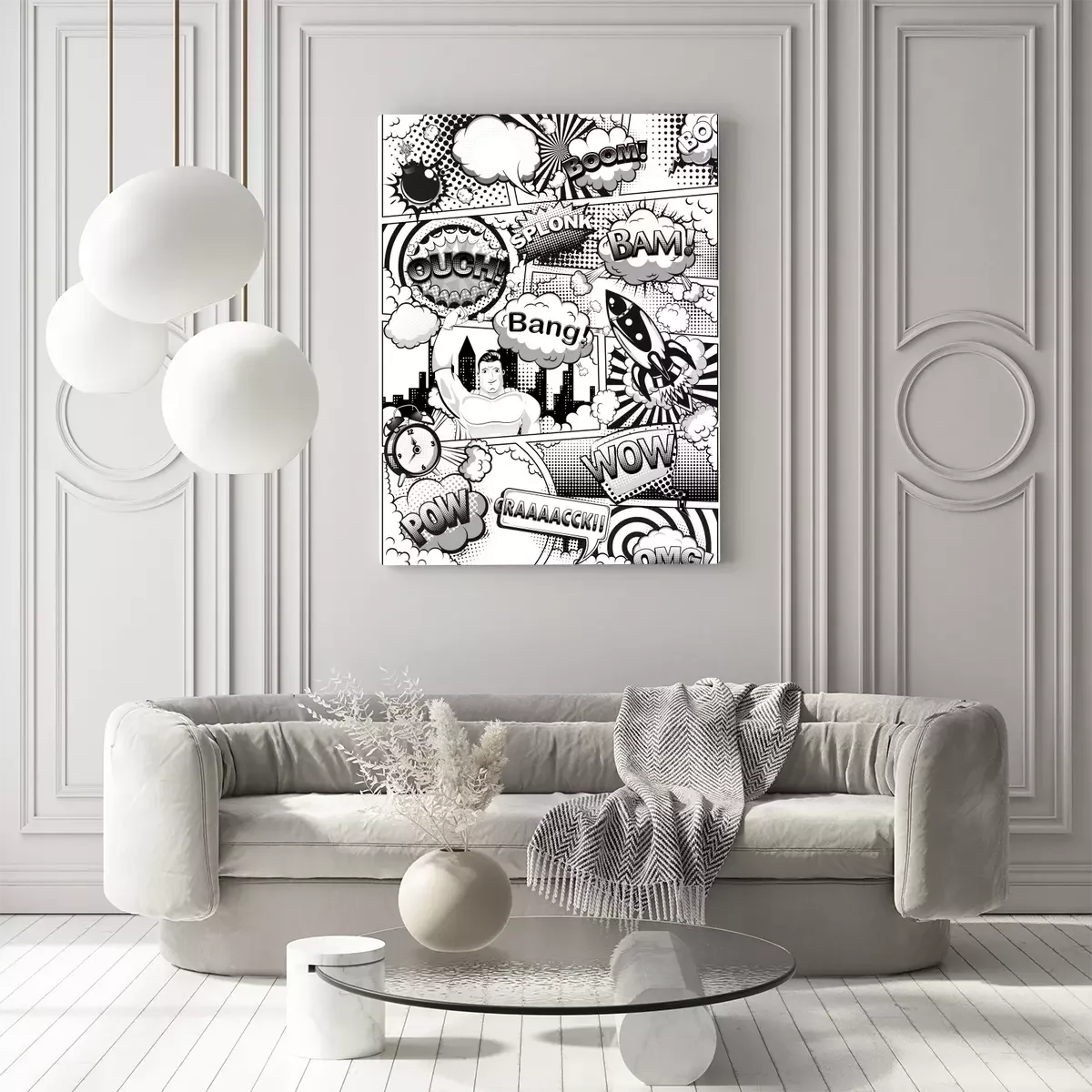 Black and white comic book page divided by lines with speech bubbles, rocket, superhero and sounds effect. Retro background mock-up. Comics template on dark background. Vector illustration