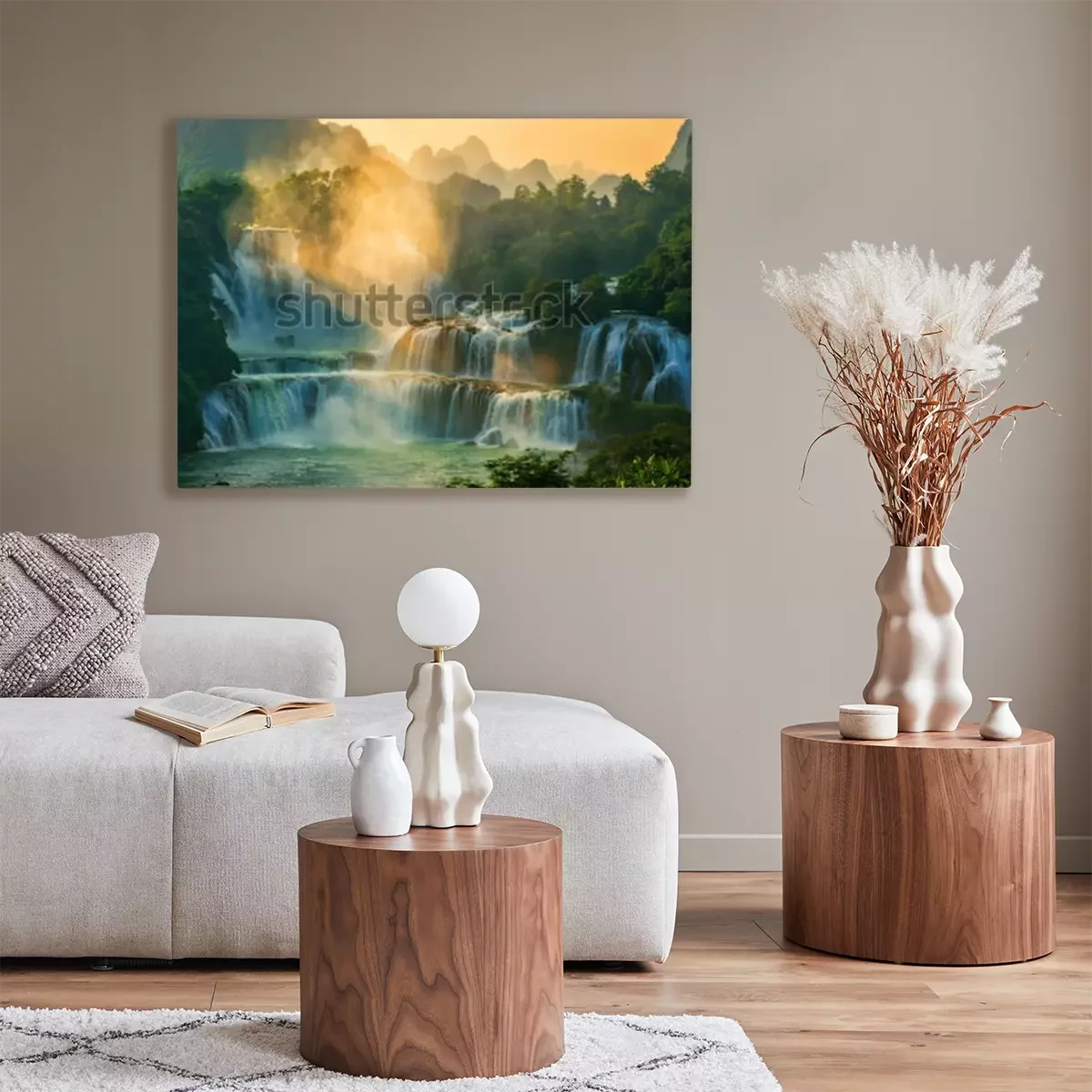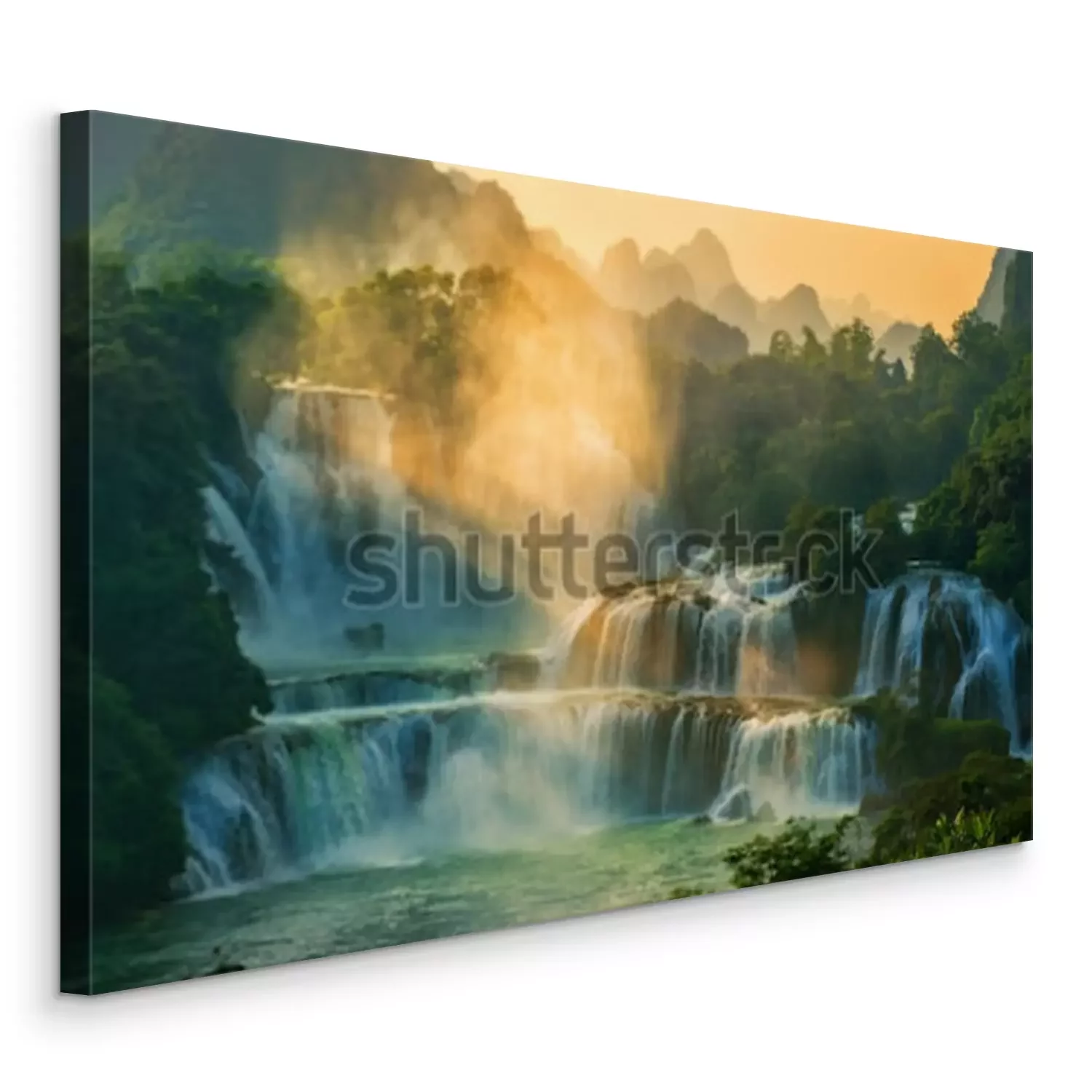 Tableau : Bangioc - La cascade est située à la frontière de la Chine et du Vietnam, c’est la célèbre chute d’eau des deux pays. Il existe des services de bateaux touristiques à voir à proximité d