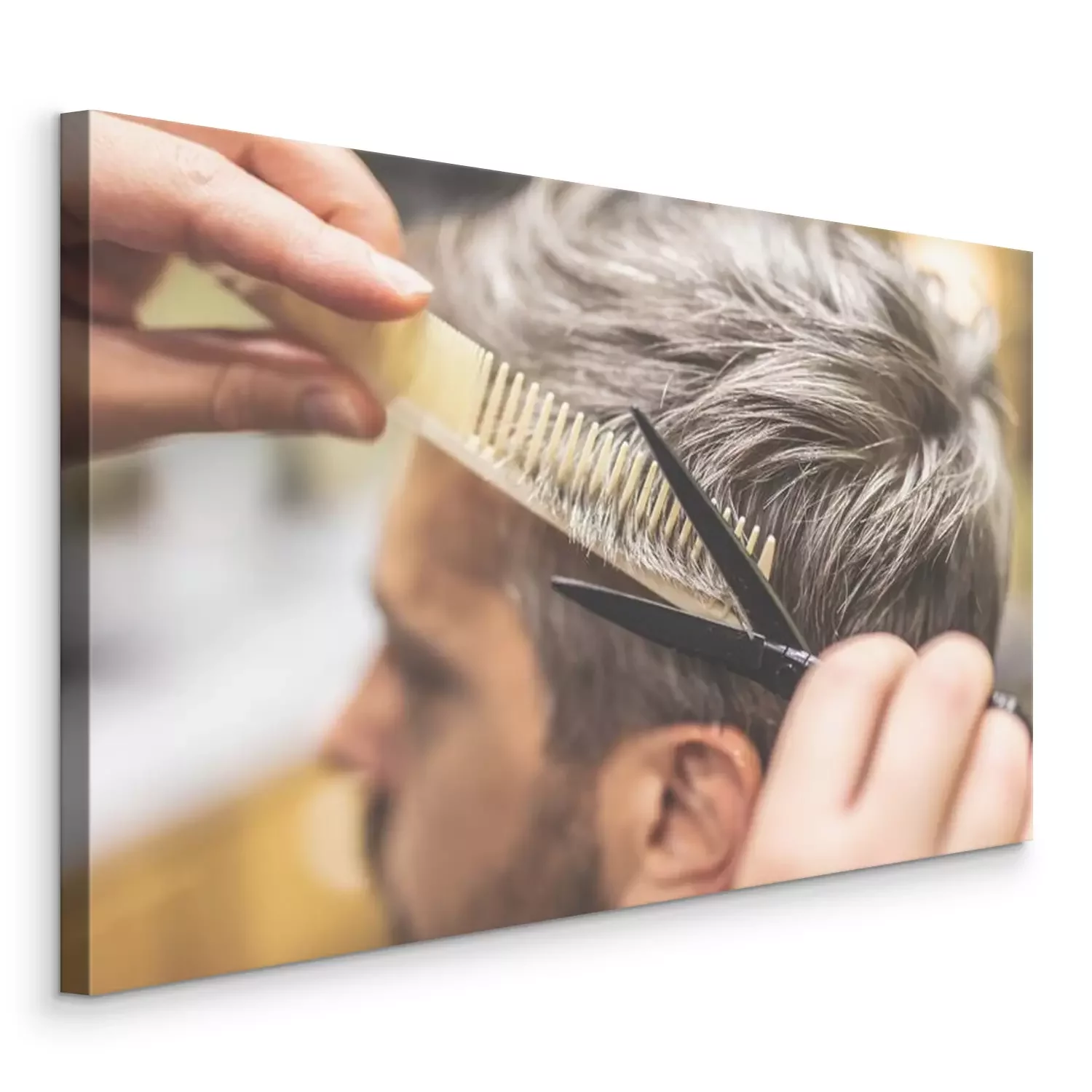 Tableau  Barber cutting and modeling hair with scissors and comb.