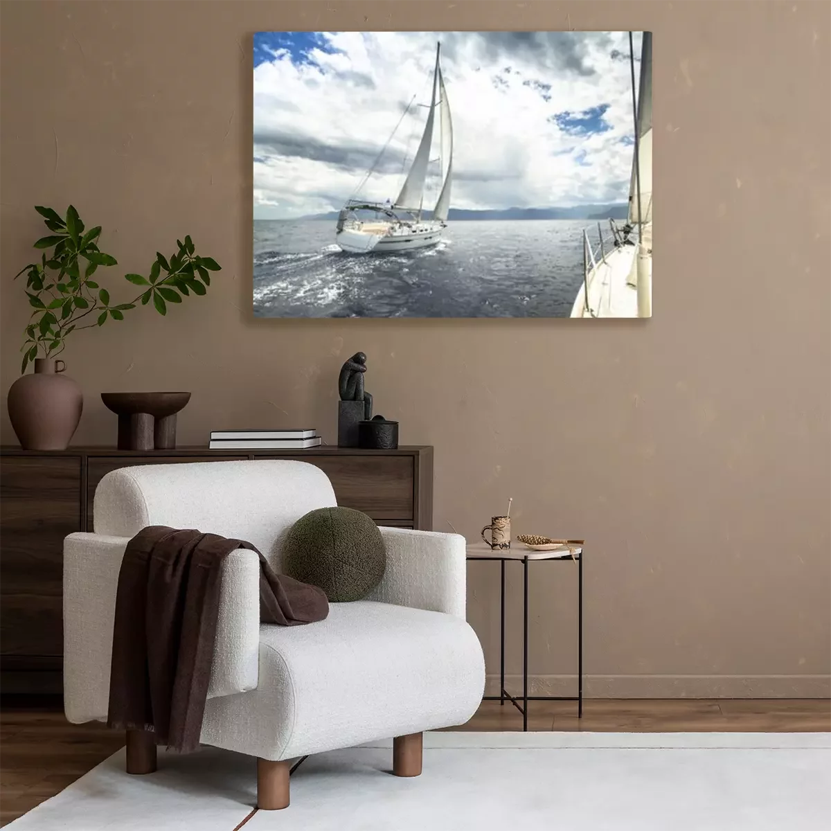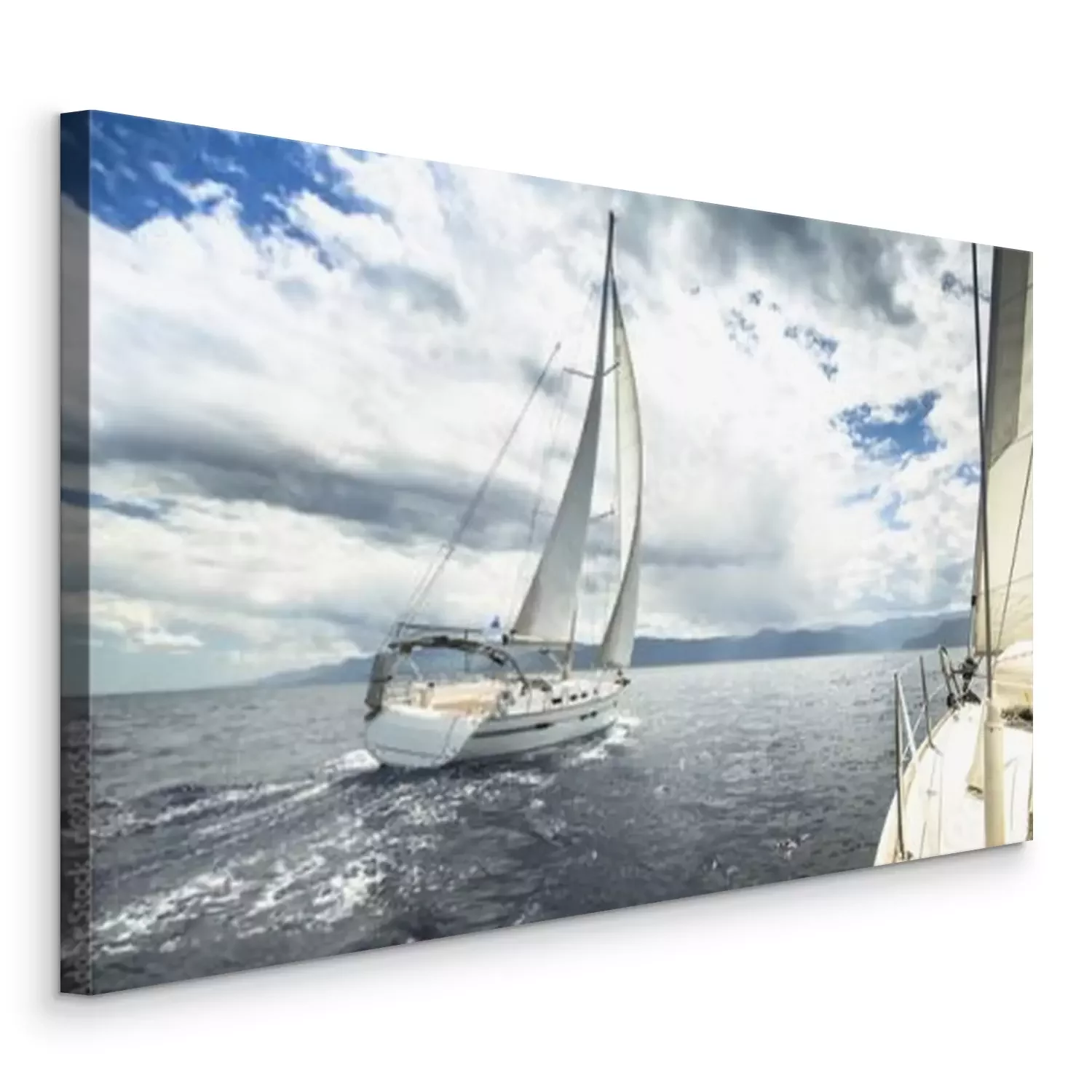 Tableau : Bateau à voile sur la course dans une mer démontée.