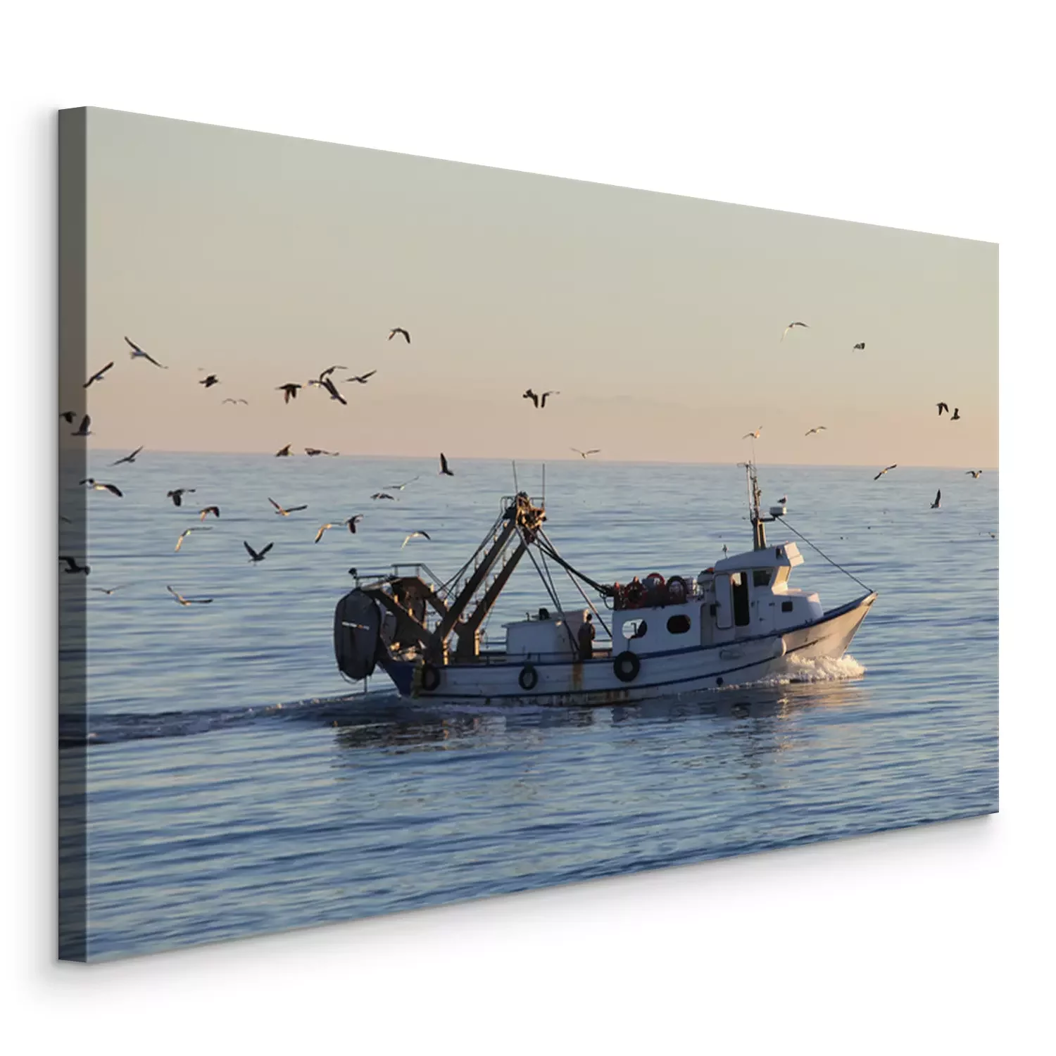 Tableau  Bateau de pêche de retourner à la maison port avec beaucoup de mouettes