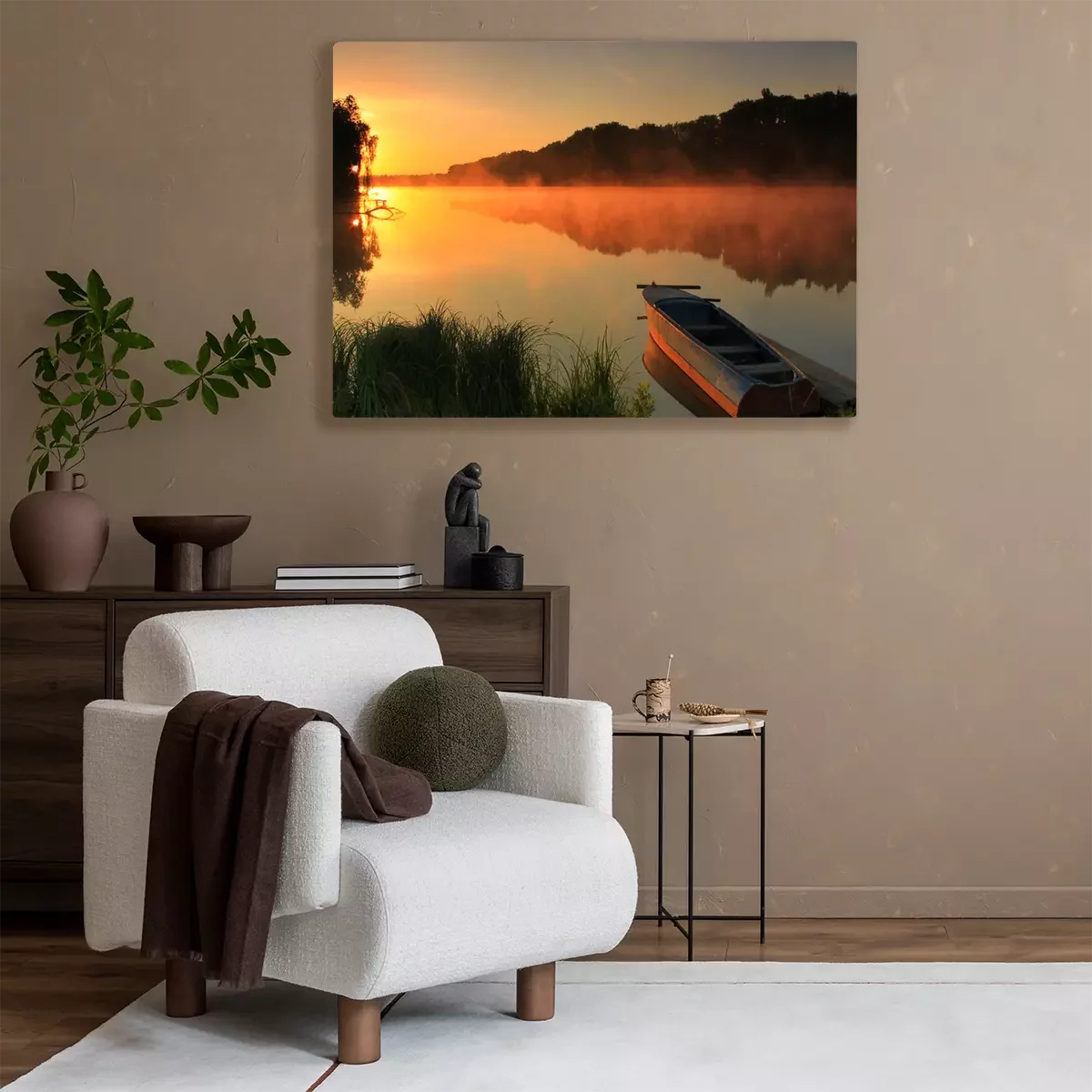 Tableau : Bateau sur le rivage d'un lac brumeux