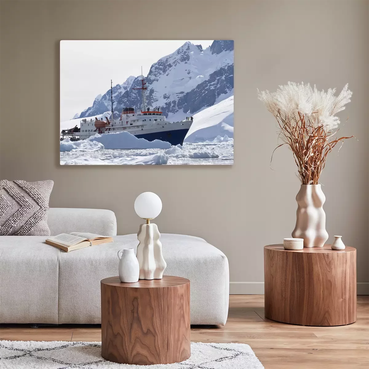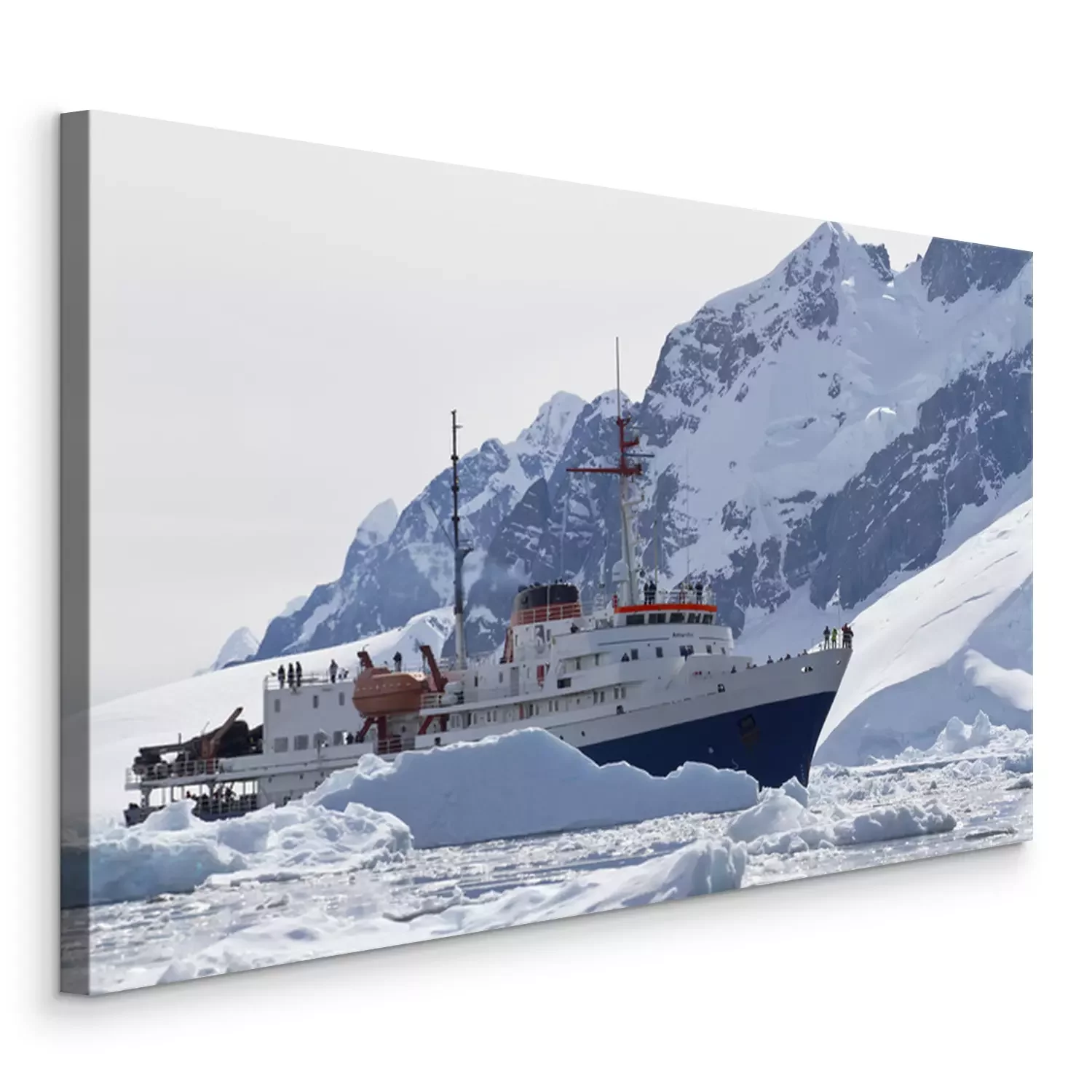 Tableau : bateau touristique au milieu des icebergs sur le fond du moun